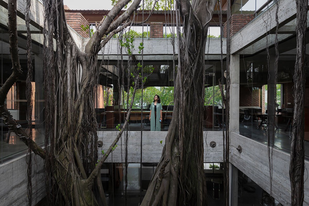 Excerpt: Charuta Factory Office by Roofliners_Studio of Architecture features a harmonious blend of nature and industry, creating a transformational narrative within a factory complex. The design honors a Pakur tree, symbolizing wisdom and existence, by reimagining interior spaces within a concealed courtyard. This sacred pact between interior space and the arboreal creates a sanctuary for employees, visitors, and the tree, fostering harmony within the community.