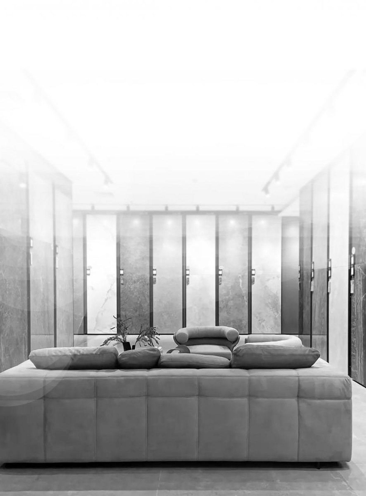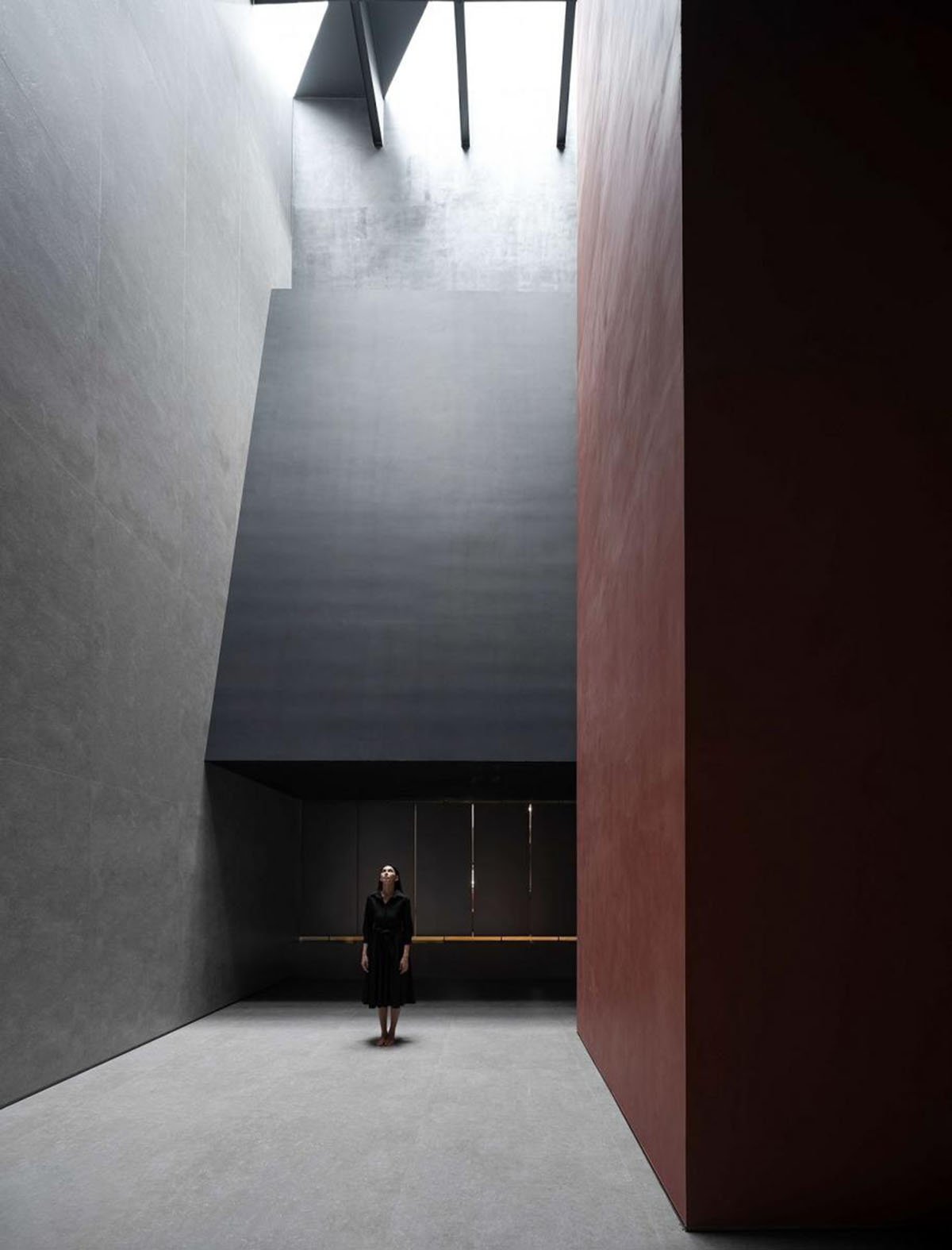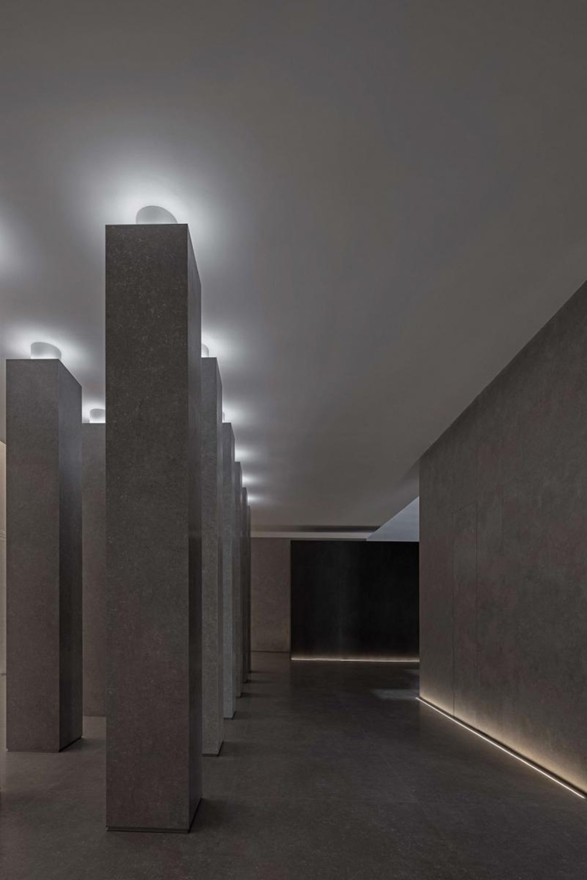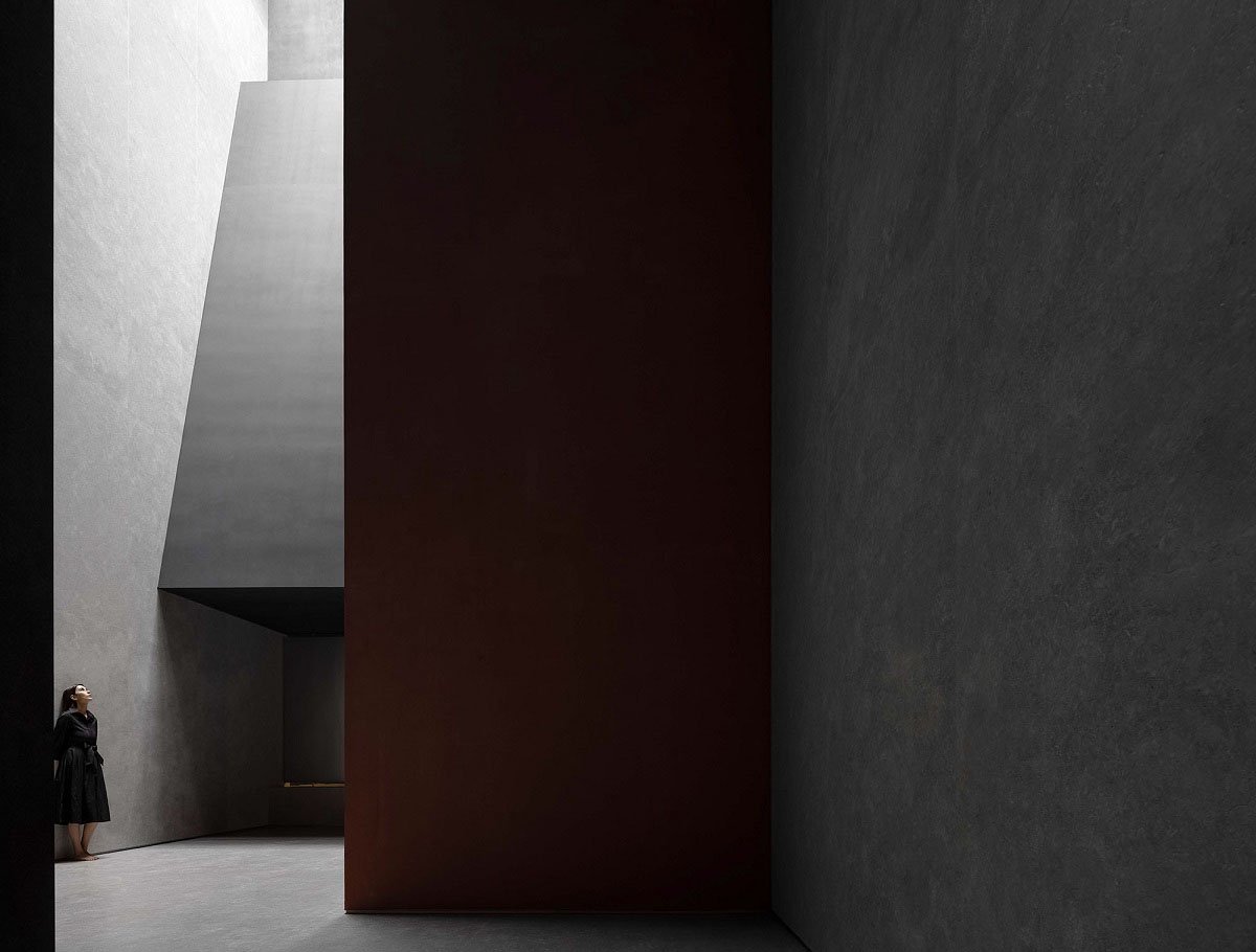 The design well matches spatial functions and deliberately creates contrasts to amplify the emotional experience. Several transitional spaces are inserted to link spatial nodes, which produces a calm atmosphere before visitors enter the spatial climax, so as to generate a strong sense of shock and surprise and intensify visitors’ emotions and feelings. The design creates powerful forms and makes use of light to highlight product textures in a natural manner. The column network leads to the 20m-high hollow space, where visitors feel released from the oppressive feeling. Daylight penetrates the glass and geometric steel structures, enters the space and interacts with sintered stone panels. It varies with time, bringing visitors a joyful experience and taking them to the spatial climax. The geometric form and scale of the space highlight the large size of sintered stone panels. Complemented by light, the textures of natural sintered stones are strengthened. The tranquil light, powerful forms and natural tactile experience are intriguing, evoking various emotions and thinking. Light and geometric forms interact with each other, and the quality of displayed products is accentuated through architectural aesthetics.