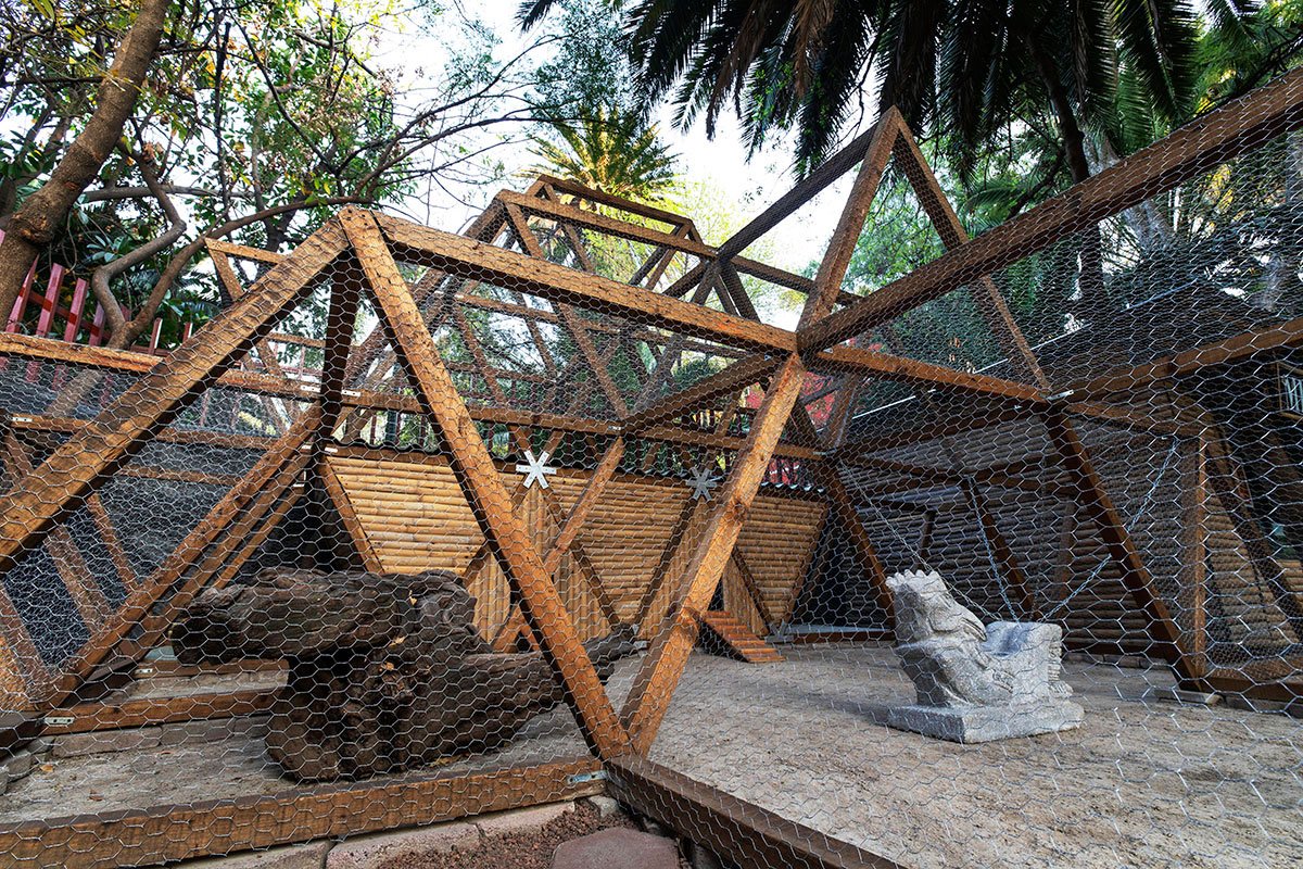 For the façade, salvaged pieces of bamboo from previous projects were cut into pieces and assembled into a horizontal pattern. A wire mesh that protects the chickens from outside predators and weather elements covers the whole exterior frame. The geometry of the coop allows for various areas inside to be repurposed for other animals, such as rabbits on the ground floor and doves in the upper areas. Guarding the entrance of the chicken coop is a custom-made Chac Mool stone statue referencing a Mayan deity placed in front of temples and pyramids in ancient Mexico.
