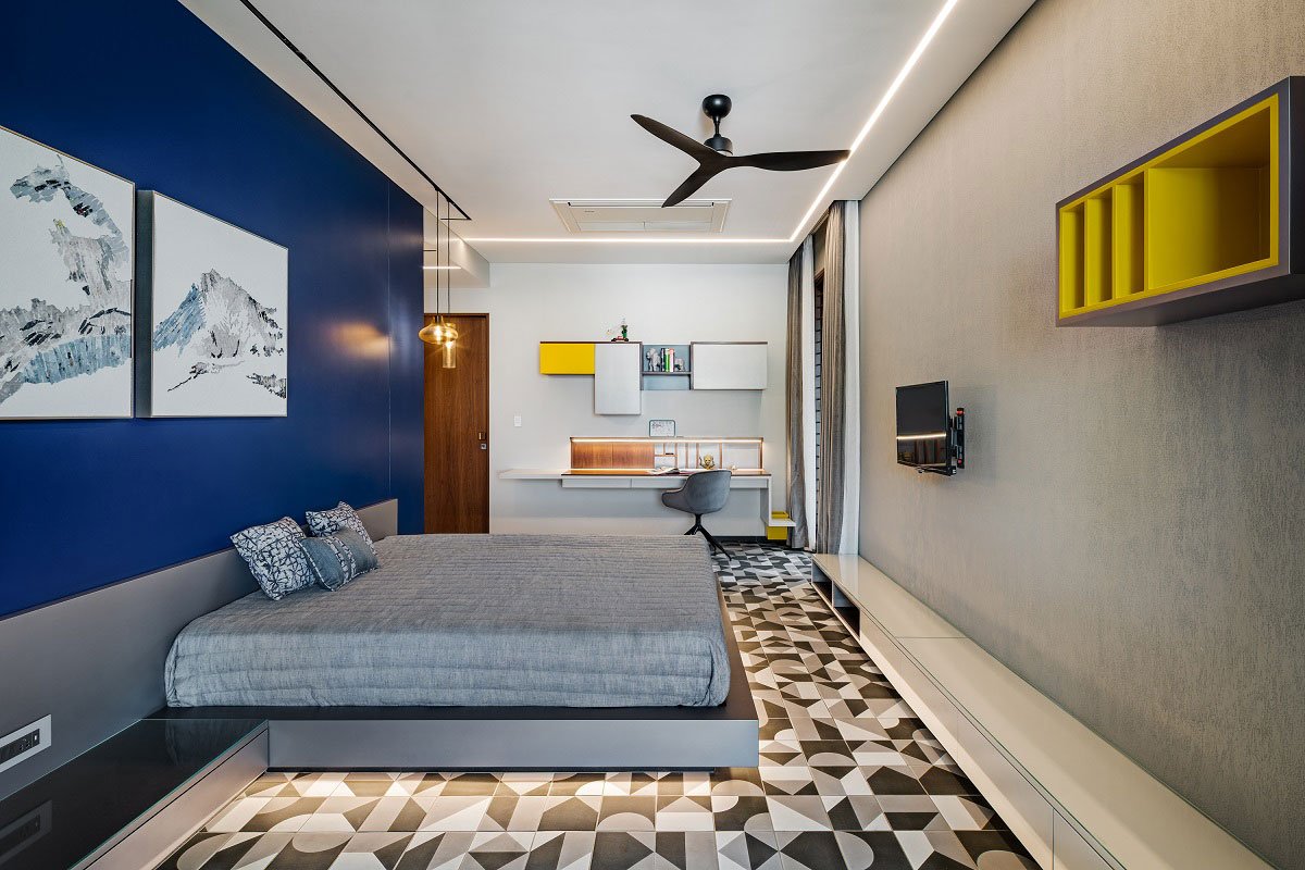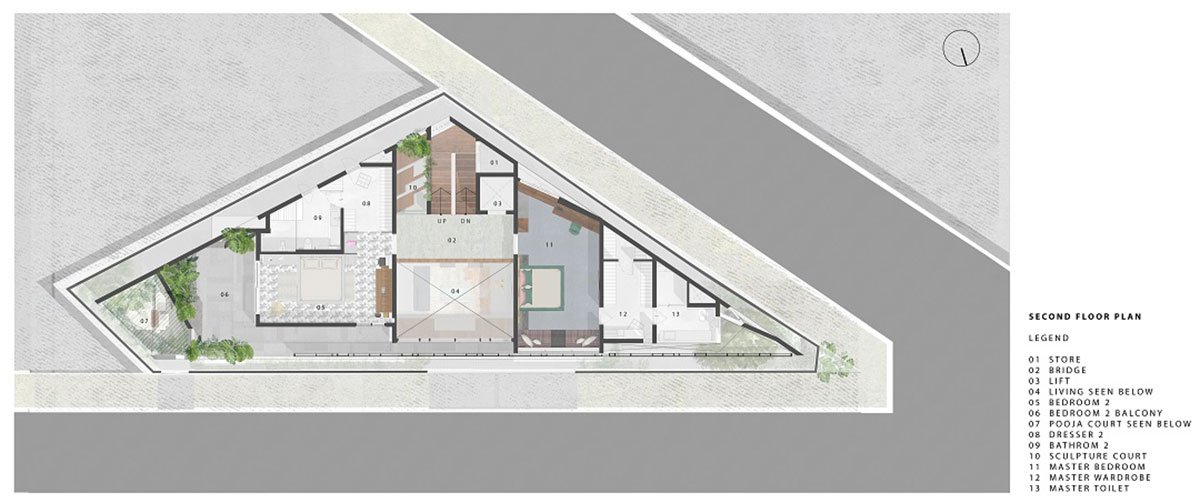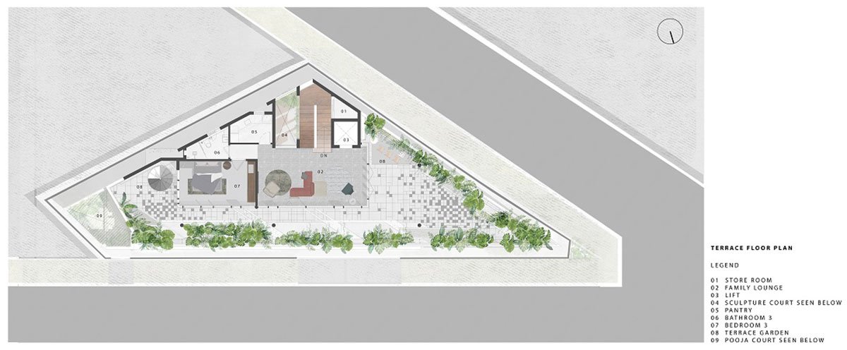 Programmatically, the core of the site unifies and divides the layout into two distinctive activity zones resonating vertically and horizontally through the building. It houses a ddouble height living space and stairwell. From here, activities radiate towards the western and eastern wings on either side of the triangular layout. The first floor accommodates a kitchen, dining and spill out terrace towards the eastern wing, while the western wing accommodates a bedroom with an attached bath. The concept resonates to the second floor layout as well. Individual bed and bath spaces are accommodated in both wings that eventually converge at a pedestrian bridge at the core. The terrace at the third floor level opens up significantly creating a scenic vantage point to the generously canopied tree-lines of the city. It accommodates an enclosed terrace lounge at the core, surrounded by open terraces along its periphery. A guest bed and bath sits at the eastern wing of the terrace layout.