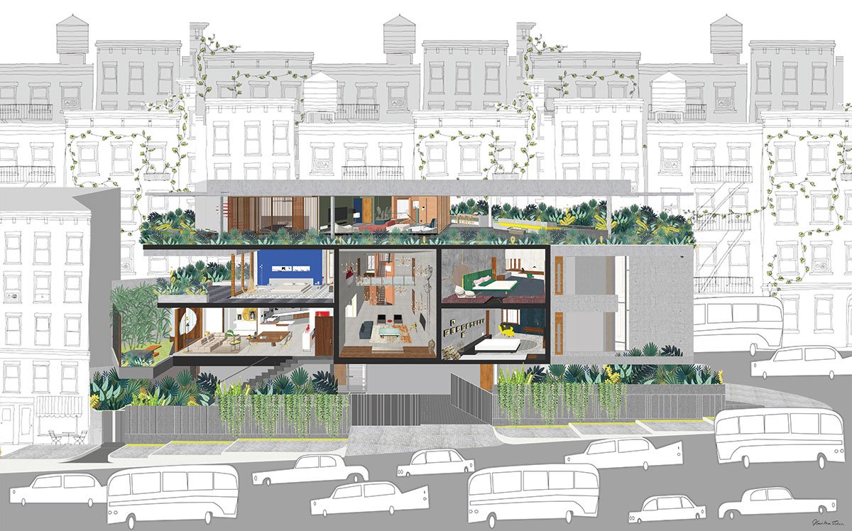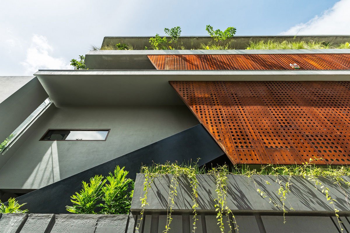 For taking advantage of the sharp angled plot, the building towers in a defensive fashion to fight aagainst the paraphernalia of the imposing city fabric. Its elevational profile has an armor-like appeal, further accentuated with large corten steel sheeting along the northern facade. It conceals all activities within the three-sided fortification, and showcases a sudden bout of exposure at the terrace of the building. The construction appears to levitate at different horizontal planes adding a certain depth to the facade surfaces. The primary bulk is lifted off the street level translating into a stilt parking at ground level. Whilst the terrace level parasol manifests a sharp angled concrete slab, giving it a sense of finesse.