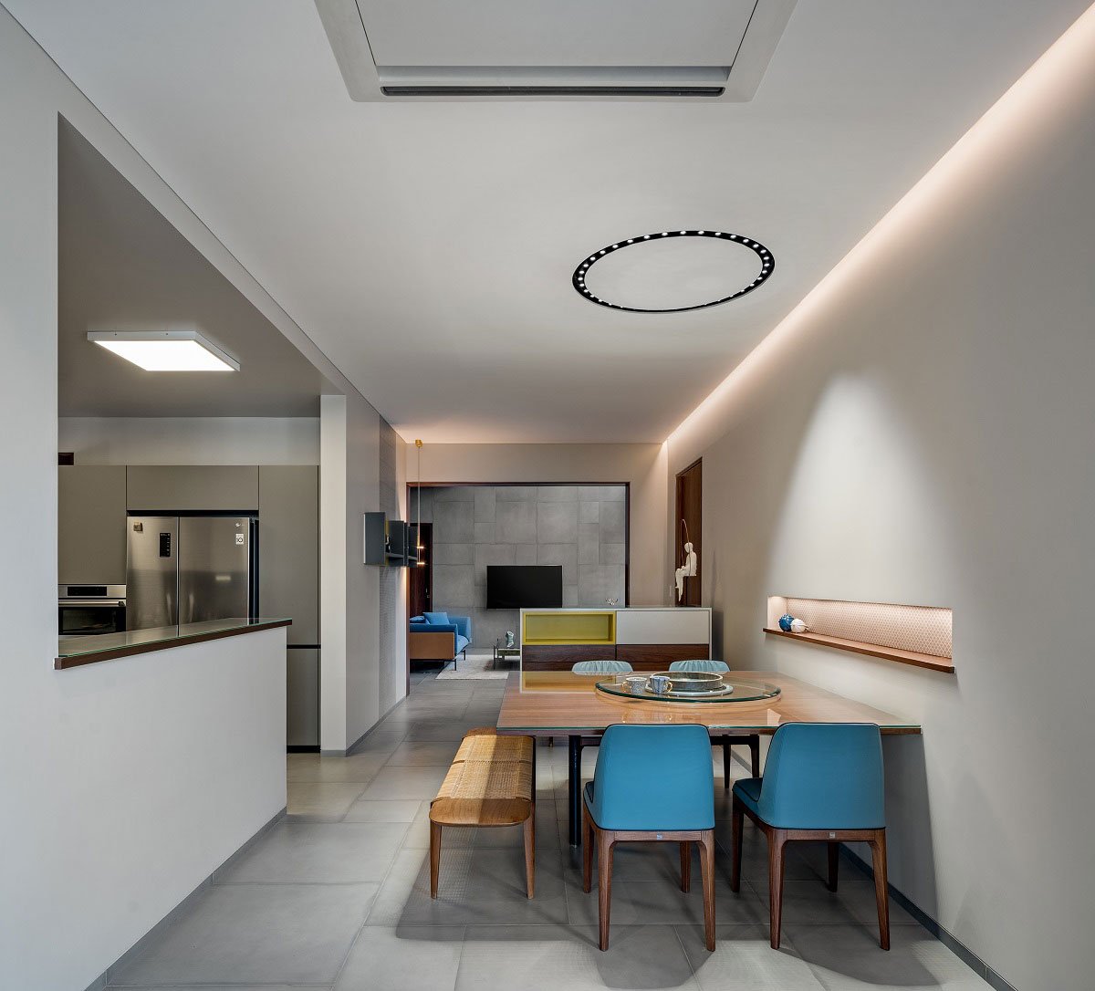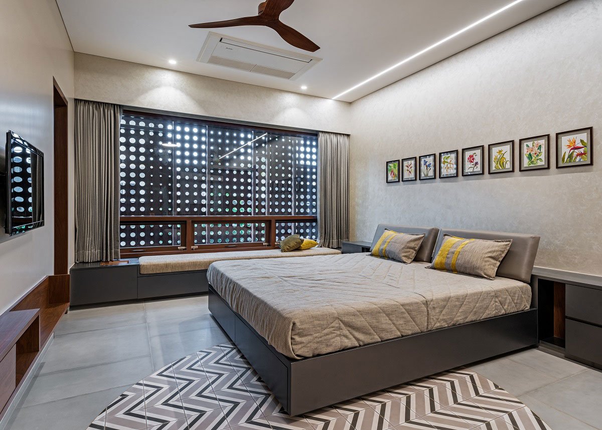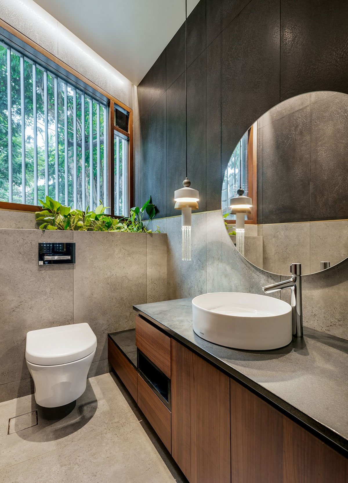 The defensive fortress-like exteriors suddenly translate into warm and protective finishes of the interiors. The spaces showcase rustic and earthy tones against a neutral palette of walls and flooring, adhering to the scheme of the building. This gives ample room for earthy accents and interior landscaping that aesthetically enliven the spaces. The dappled light streaming in through the corten sheeting screen, adds the finishing touch to the scene. By creating distinct lighting effects that render the interiors in a ‘new light’.