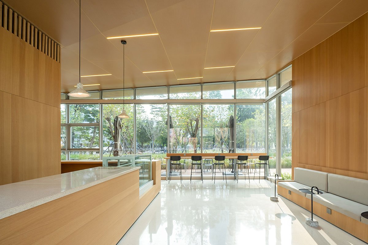 The interior of CloudLand is composed of a book café and a restroom. Furnished with a warm texture of wood veneer, the café serves as a space with full-height windows facing the surrounding landscape to provide a cozy vibe for relaxation. The interior and exterior ceilings are made up of aluminum panels of the same color and embedded lighting to form a continuous spatial experience from inside to outside. Moreover, the architect specially customized the cloud-inspired dining table, door handles, and other details to resonate with the theme on all scales.