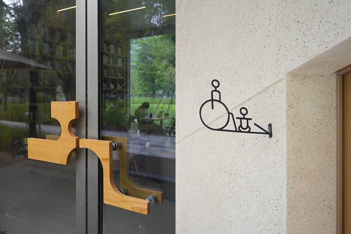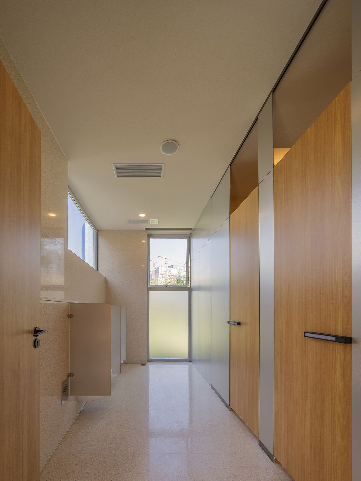 The interior of the restroom provides visitors with bright light and colors, smooth materials, and views of the gardens. The exterior walls of the restroom are made of white washed stone, while the interior walls and floors are made of light-grey terrazzo, both of which add a touch of natural texture to the well-equipped restroom facilities.