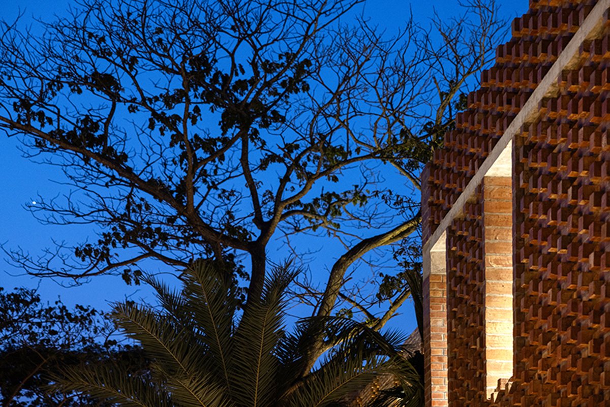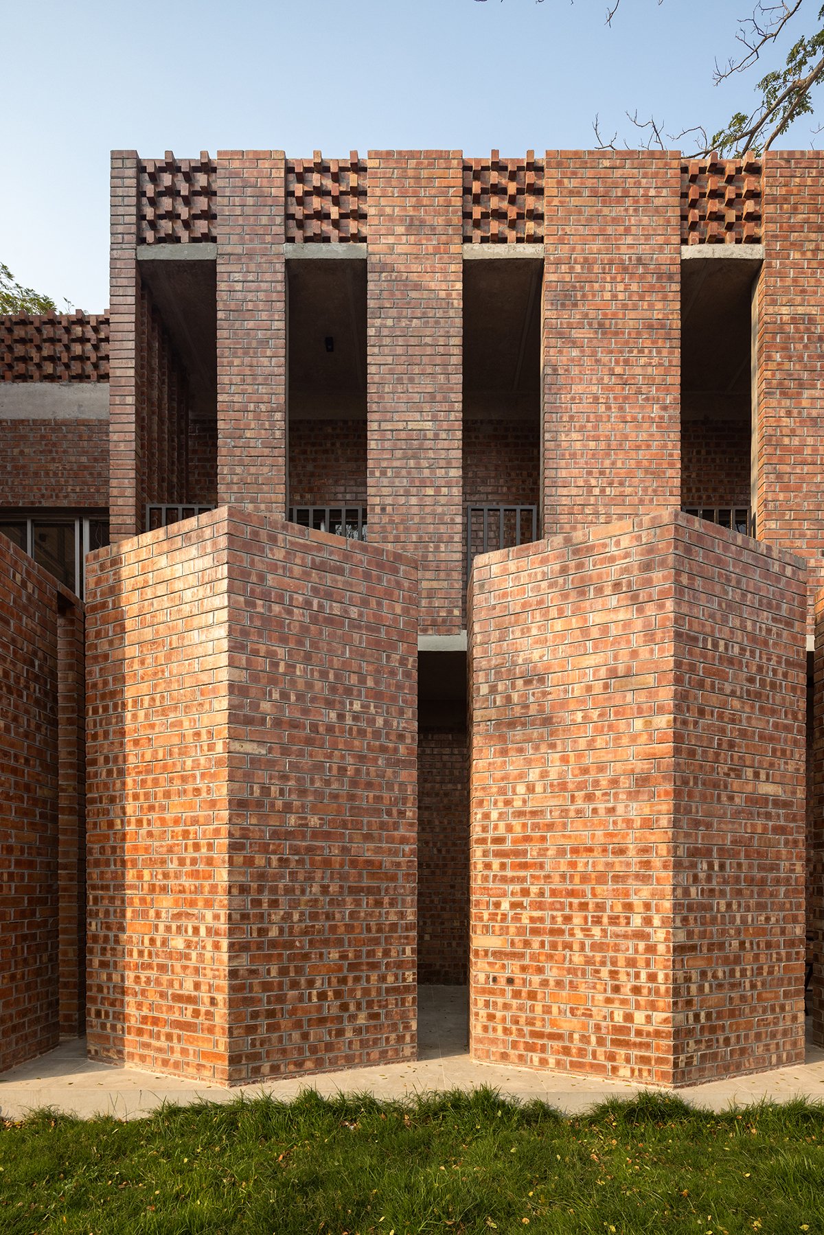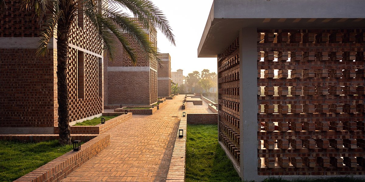 Climate resilience has been central to the architectural approach. Given Kuakata’s vulnerability to cyclones, flooding, and saline intrusion, the structures are elevated to withstand seasonal surges. Passive cooling strategies reduce dependence on mechanical systems. A long water body on the southern side functions as a freshwater reservoir in a region where groundwater is often saline or arsenic-contaminated. At the same time, it enhances thermal comfort by cooling southern breezes before they enter the building. Ventilation and daylighting are optimized through jali screens, which filter sunlight and reduce heat gain. Structurally, the center combines locally produced brick load-bearing walls with reinforced concrete beams and roofs, offering durability suited to cyclone-prone environments.