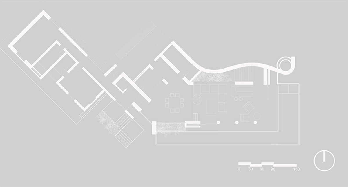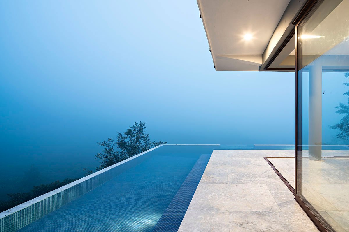 The exuberant context guided the design of this holiday residence extension. The integration of both interior and exterior programs was achieved through the use of a large sliding curtain wall on both levels intended to remain open while the house is in use. This allows the house to open up to the unique landscape, while also connecting the adjacent infinity swimming pool with the public living area on the lower level, and the master bedroom with an open hot tub, bathroom and terrace on the upper level.
