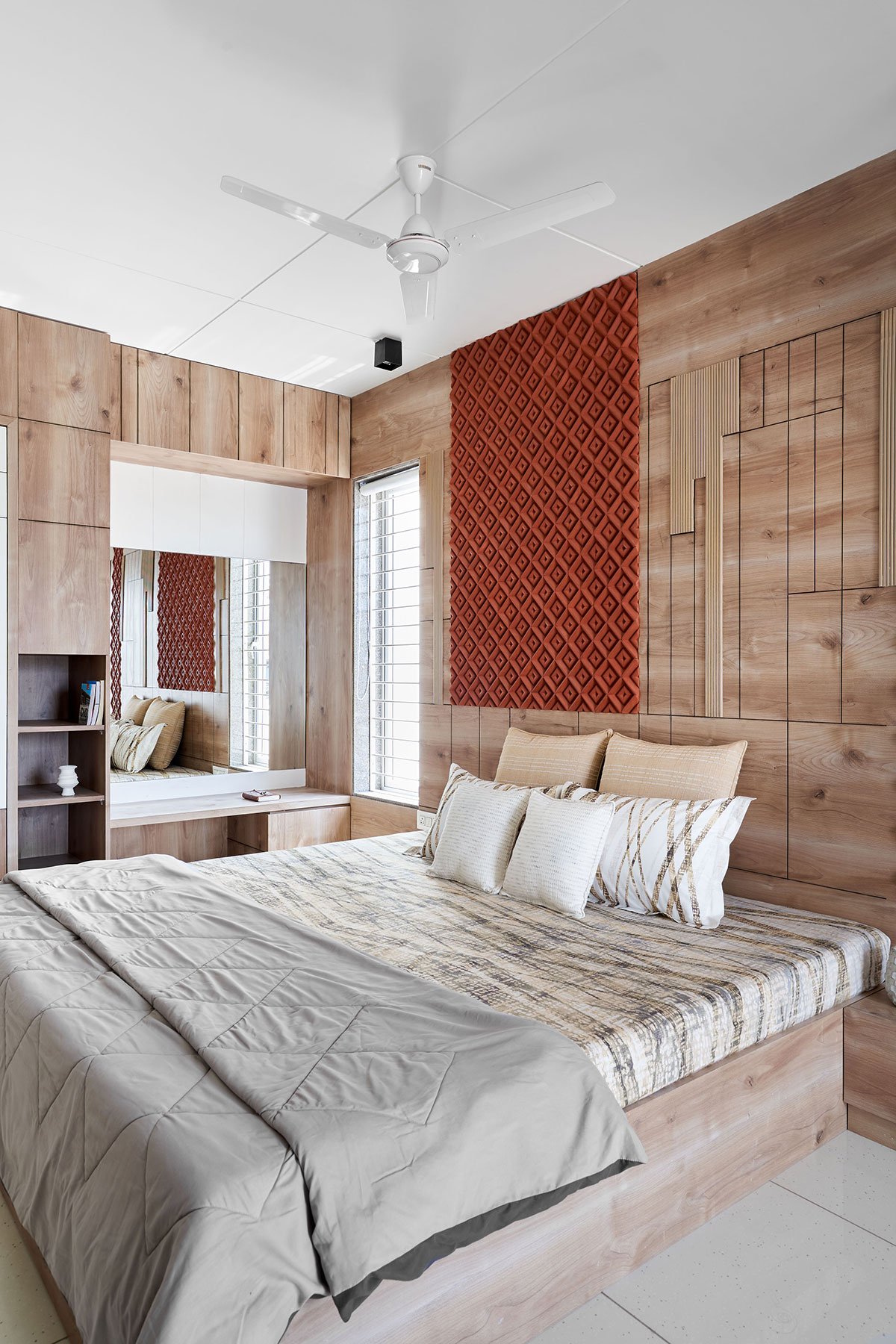 Excerpt: Colorful Mosaics House, designed by Manoj Patel Design Studio, uses simpler geometric forms and robust massing that has evolved into subtle, striking surfaces with detailed patterns and textures. The home is oriented as per daily functions with a variety of double height living and dining attached with a garden, kitchen and master bedroom for elderly parents on the ground. The interiors of the dwelling feature use of light coral pink walls and a complimenting shade of yellow inspired by the concept of surprising color graphics.