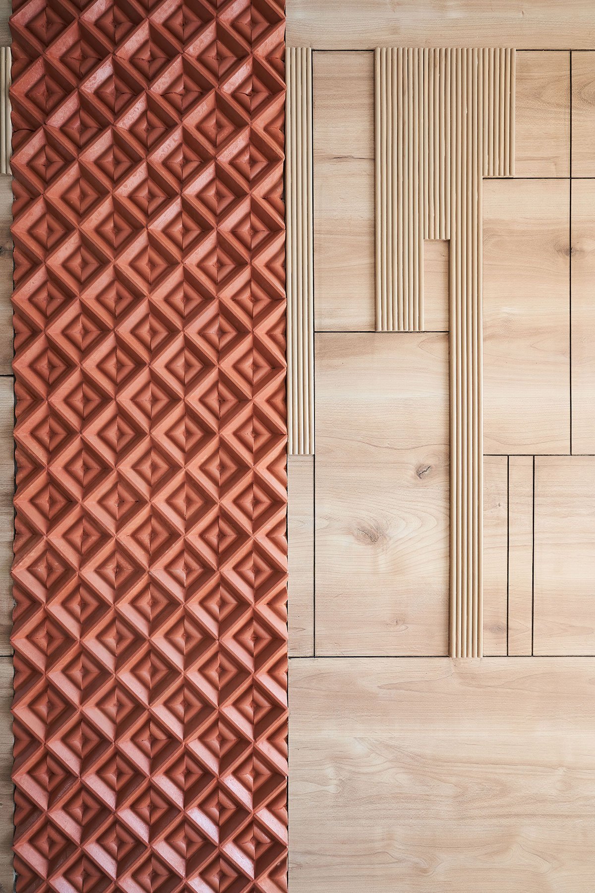 An experiment with clay roof tiles as planter voids depicts alternating patterns popping out into 3D walls. The natural material property allows the plantations to blossom completely. In the kitchen, the paneling above the countertops fascinates the uncommon use of bohemian patterned tiles. A section of tiles has been overturned to form a new pattern module from the actual pattern.