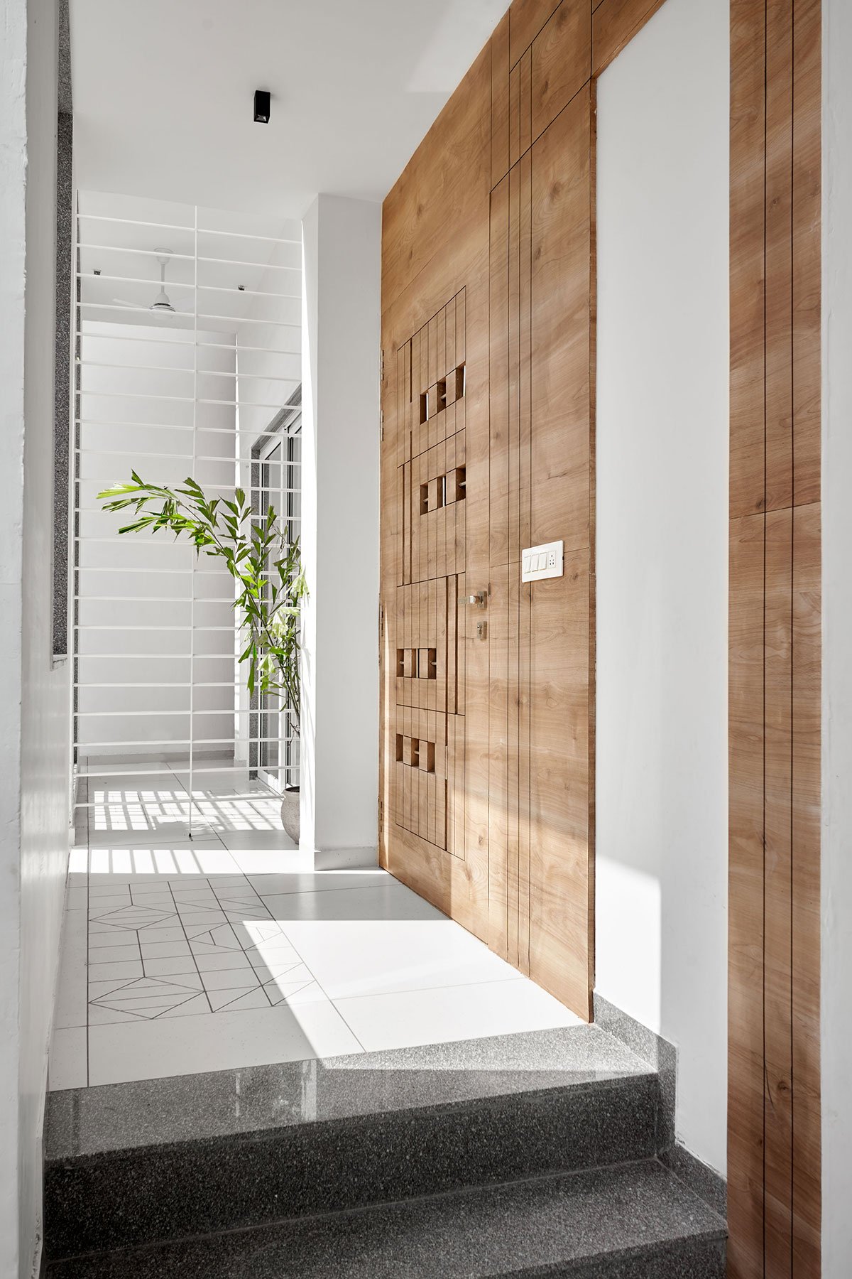 Floor mats are a symbol of welcome. The idea of channeling carpets into an art form emerged, through carved grooves and lines on tiles, which adorn the floor. To have a see through screen that assures safety, the entry door has slits running around in sizes intact with small metal bars.