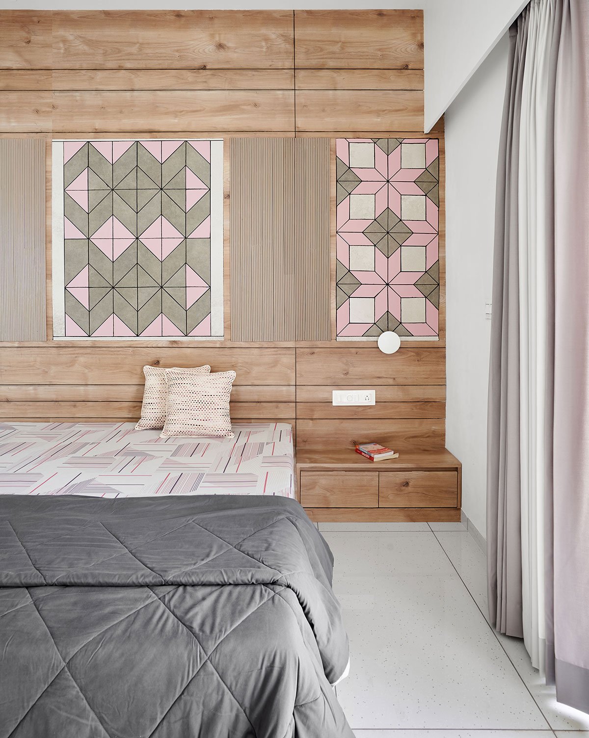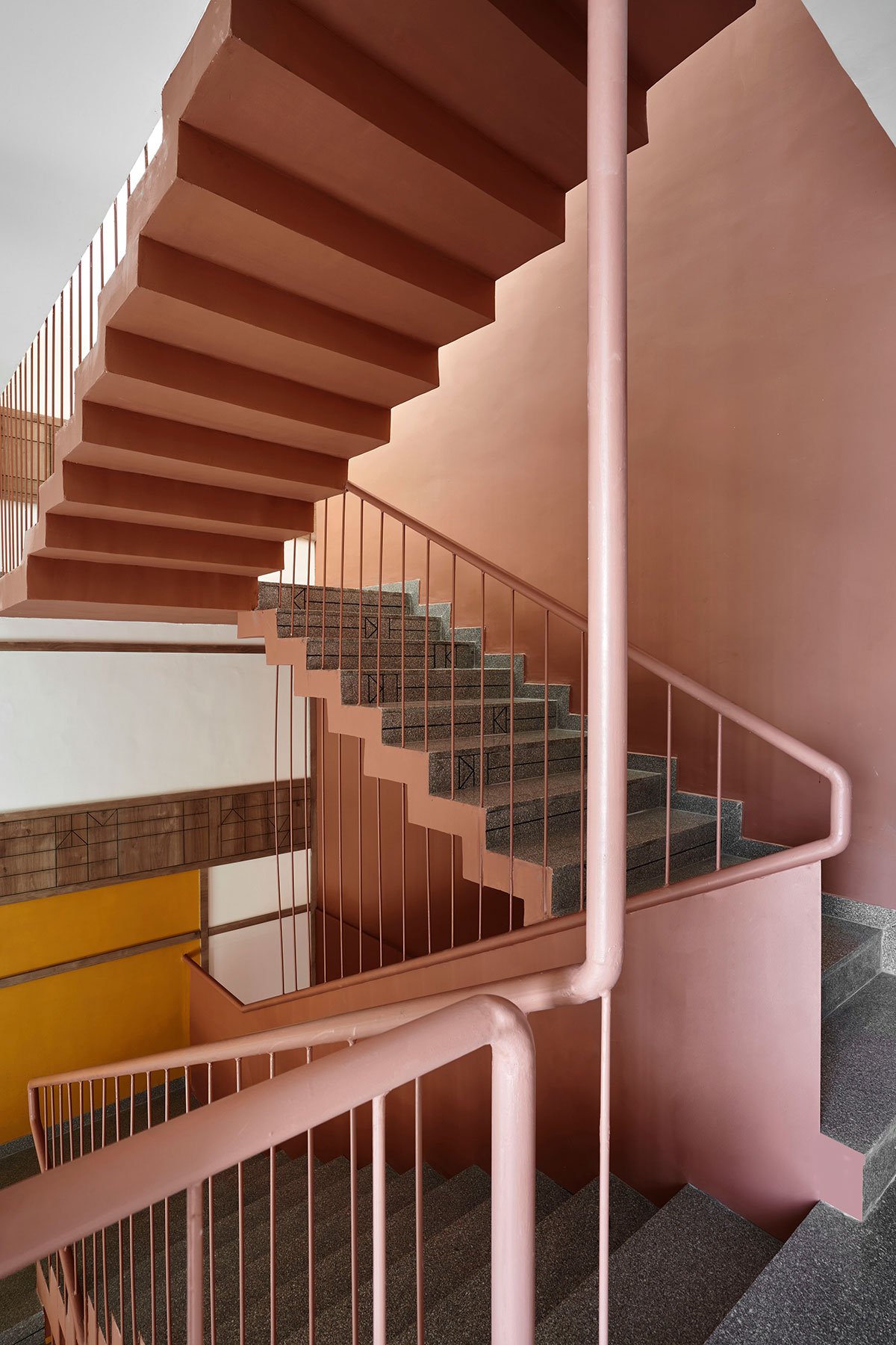 [Text as submitted by architect] Colors express celebrations of life. Located in a semi urban area of Vadodara, this plot space of 1600 square-feet-space has two sides open with one side adjoining the neighbourhood. Using simpler geometric forms, robust massing has evolved in subtle, striking surfaces with detail patterns and textures. The interiors of the dwelling feature use of light coral pink walls and a complimenting shade of yellow inspired by the concept of surprising color graphics.