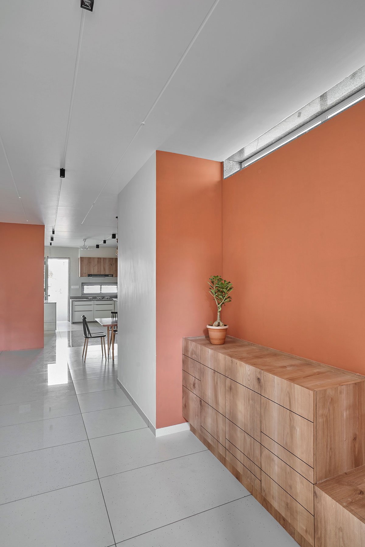 While entering, a perception to simulate a much larger space, the living, dining and kitchen are without barriers, articulated only by the furniture layouts. The foyer sets a backdrop of uncommon storage with seating, where the light coral color on accent walls pops out from the white mass.