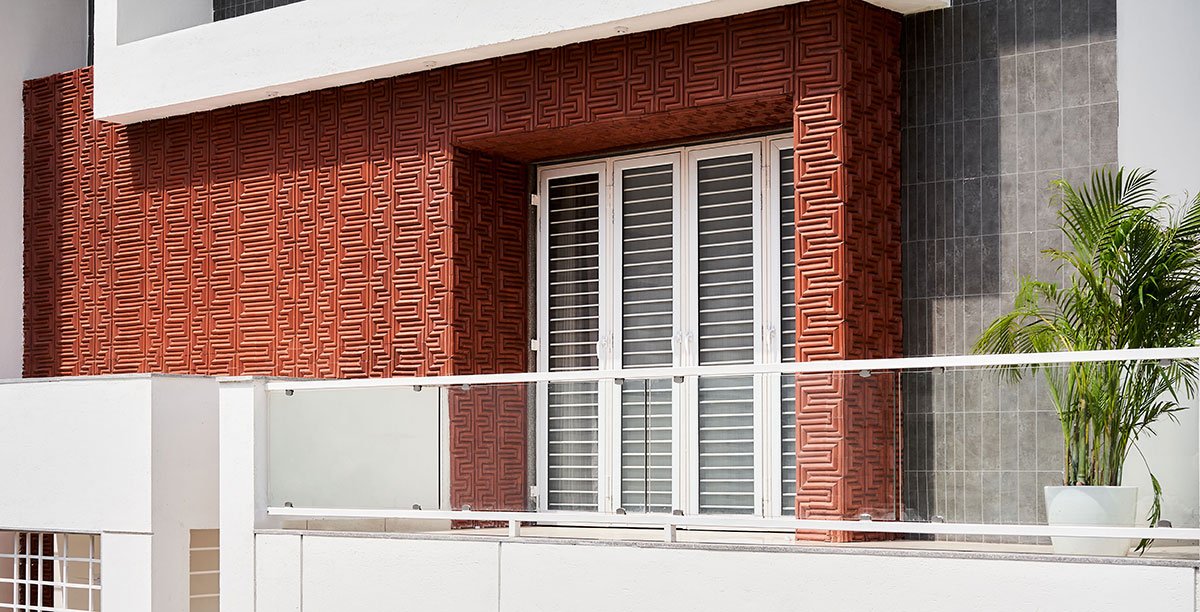 This two storey structure has an entrance from the west side of the plot. The facade has been set against the rustic tones of vernacular material. Clay roof tiles have been crafted into possibilities of crisscross angles which interlock the pattern on intersecting. The continuous variations attained in shadows of prime façade material at time intervals, convey the study of sun rays.