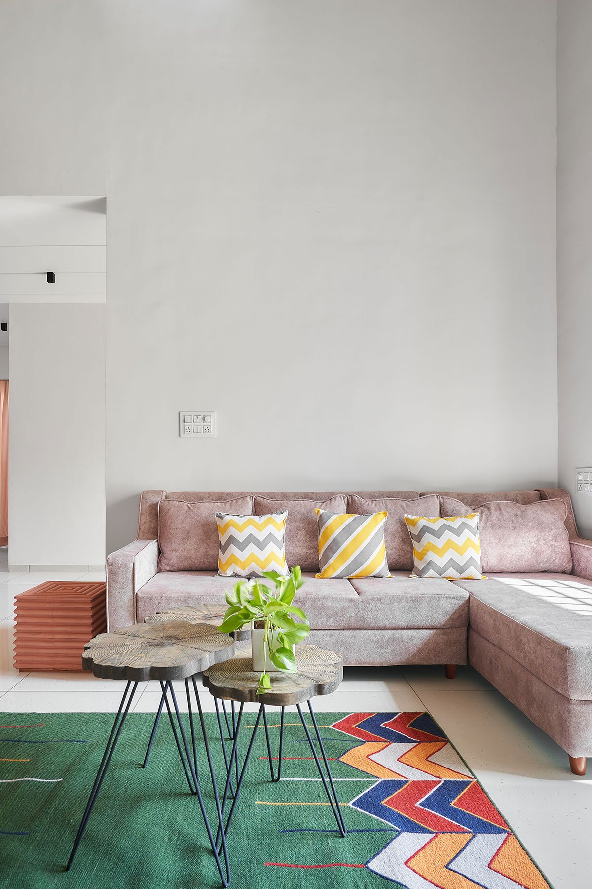 Letting the clients indulge in elevated ceilings, the backdrop frame for T.V. wall composition artistically elongates until the top, which adjoins the staircase. At the other end, is a floating T.V. unit made out of wood. Our idea was to utilize minimum materials and not accessorize with dense combinations of colors or materials. Traditional pattern grooves on wooden joinery uplift the bold step. Balancing the vibrancy, certain walls deliberately retain white. The living room has grey upholstery and modular furnishings, adding to moments of color are custom – made furniture series of seating stools from clay roof tiles against the sofa. The floor is fitted in the fusion of white matt and glossy terrazzo tiles, defining the seamless palette.