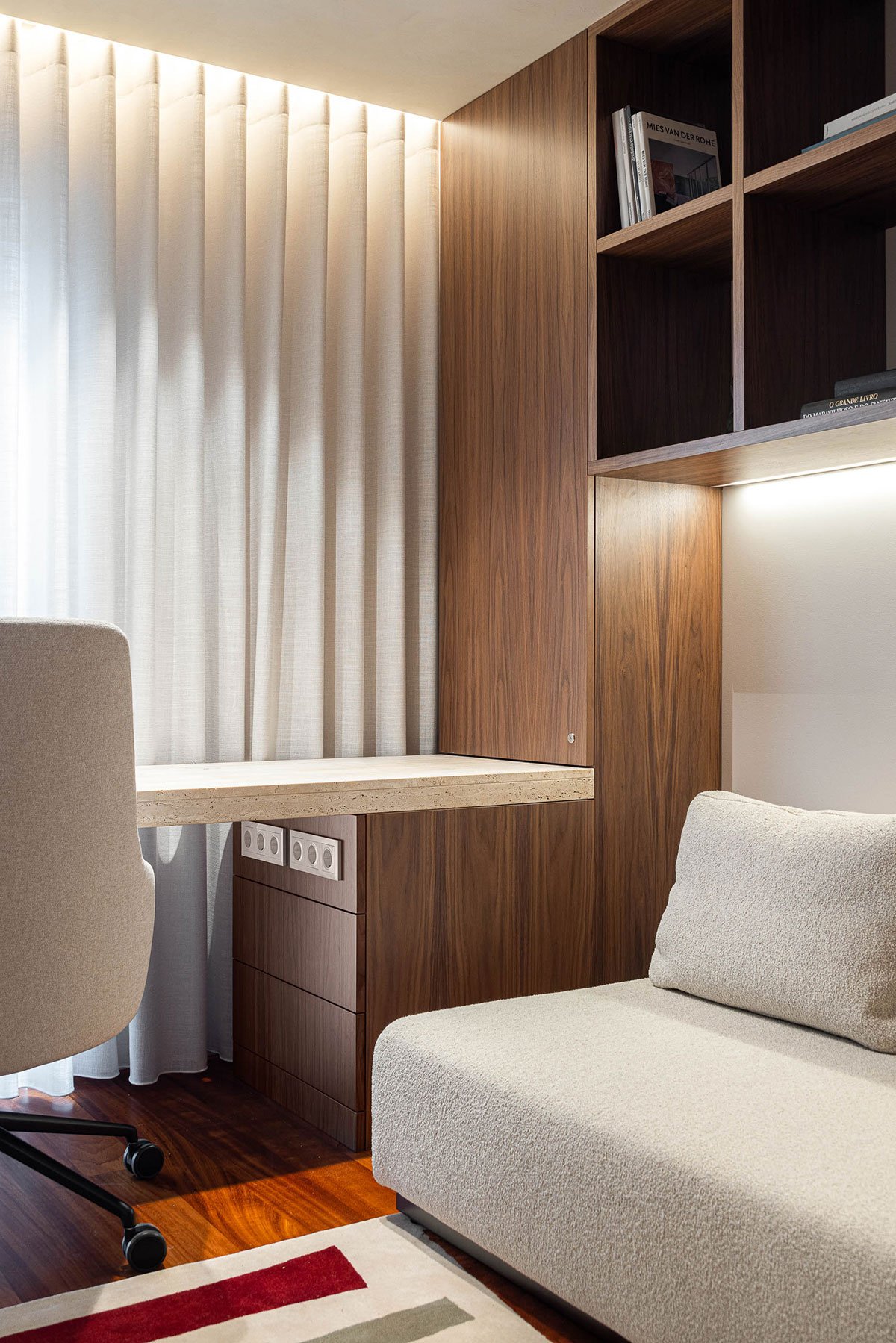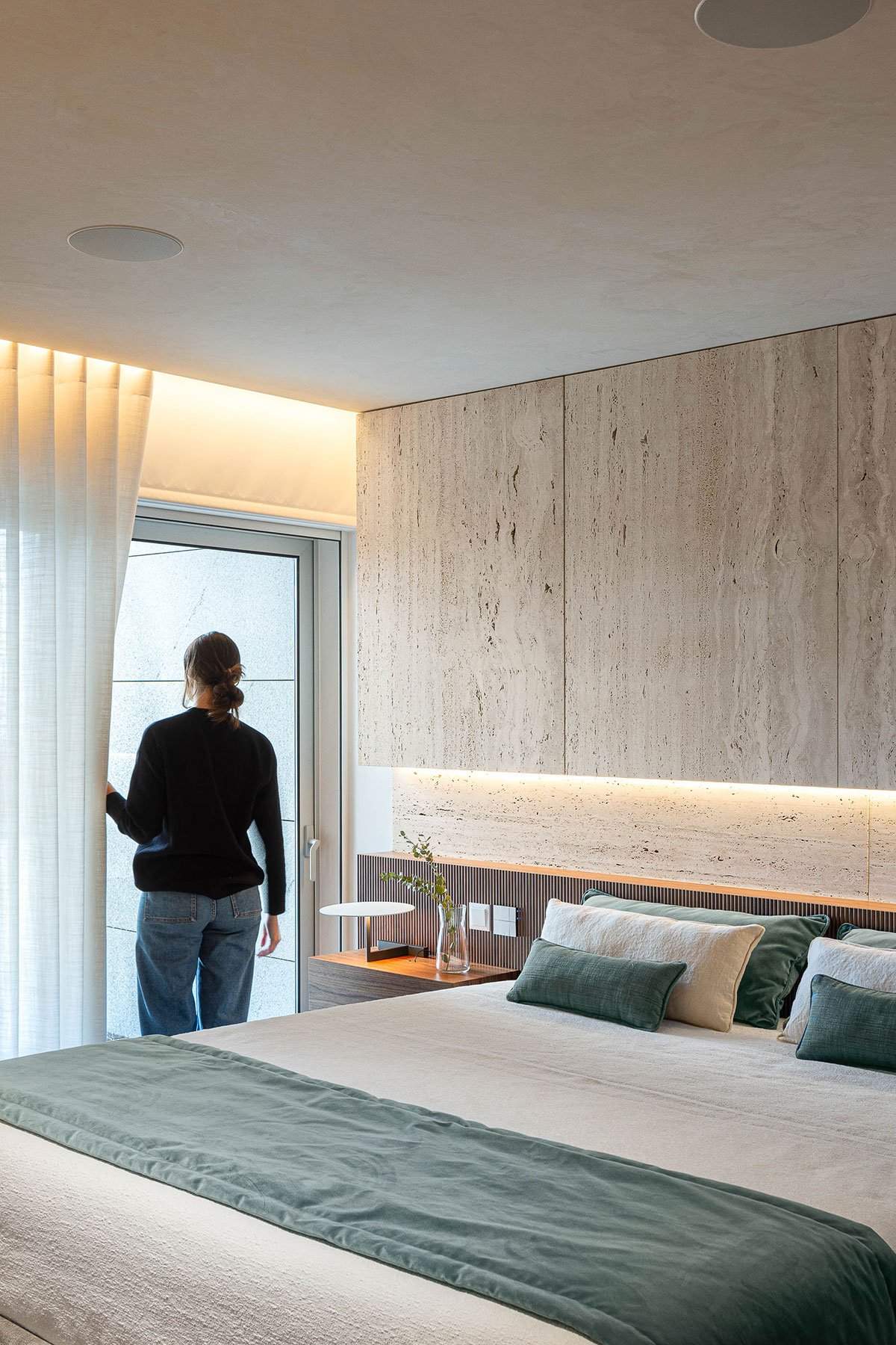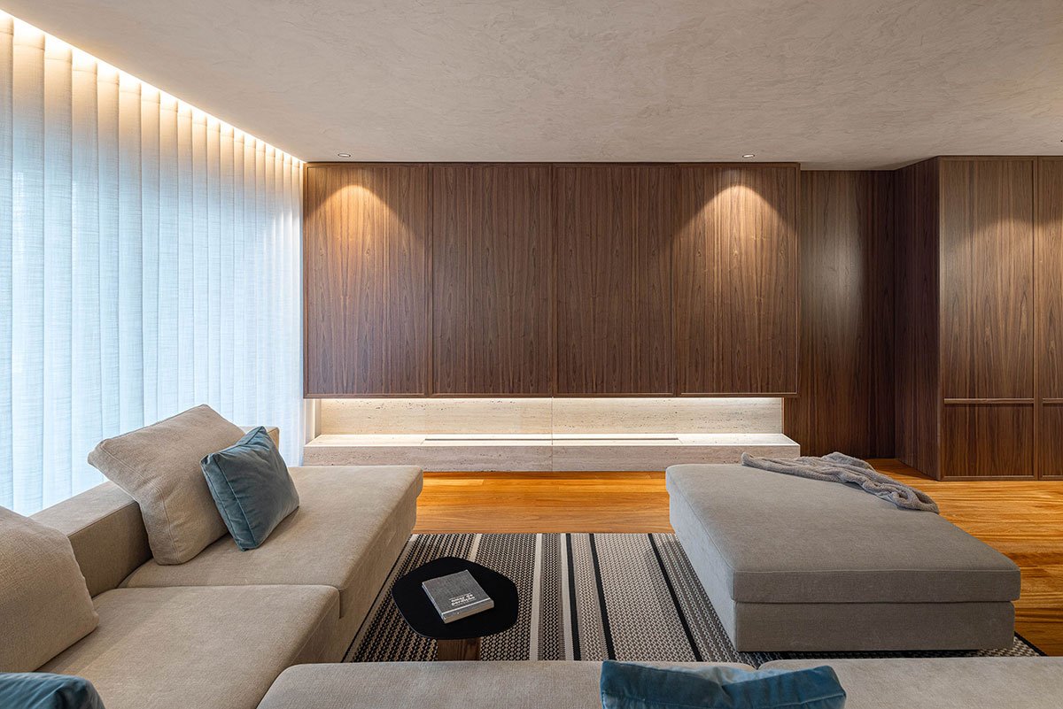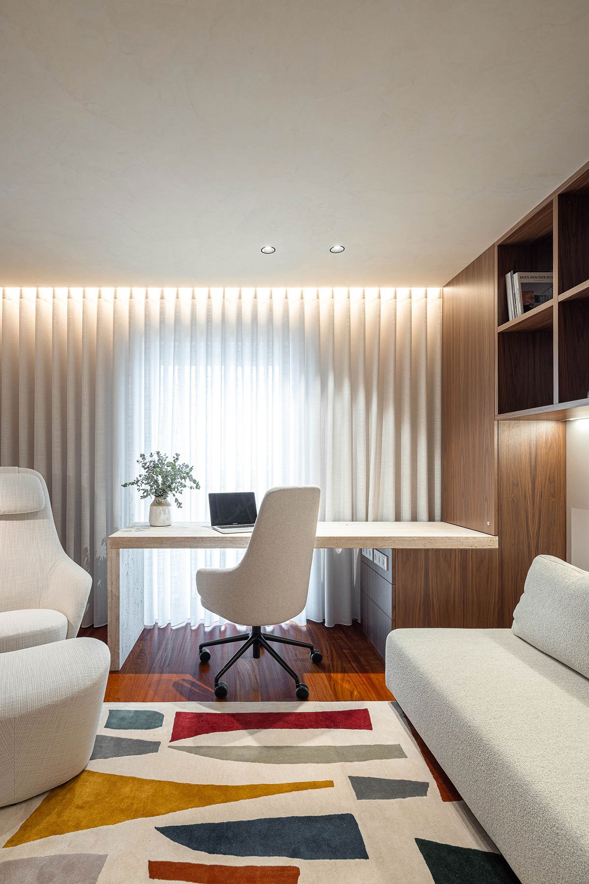 The common spaces, such as the living room and office, were designed to convey a feeling of comfort, harmony and lightness and also to anchor the connection to the place, Vila do Conde, a city surrounded by beaches and pine forests. Travertine, in sandy tones, and wood are the preponderant elements in the interiors, combining the robustness and timelessness of the stone with the elegance and naturalness of walnut wood.