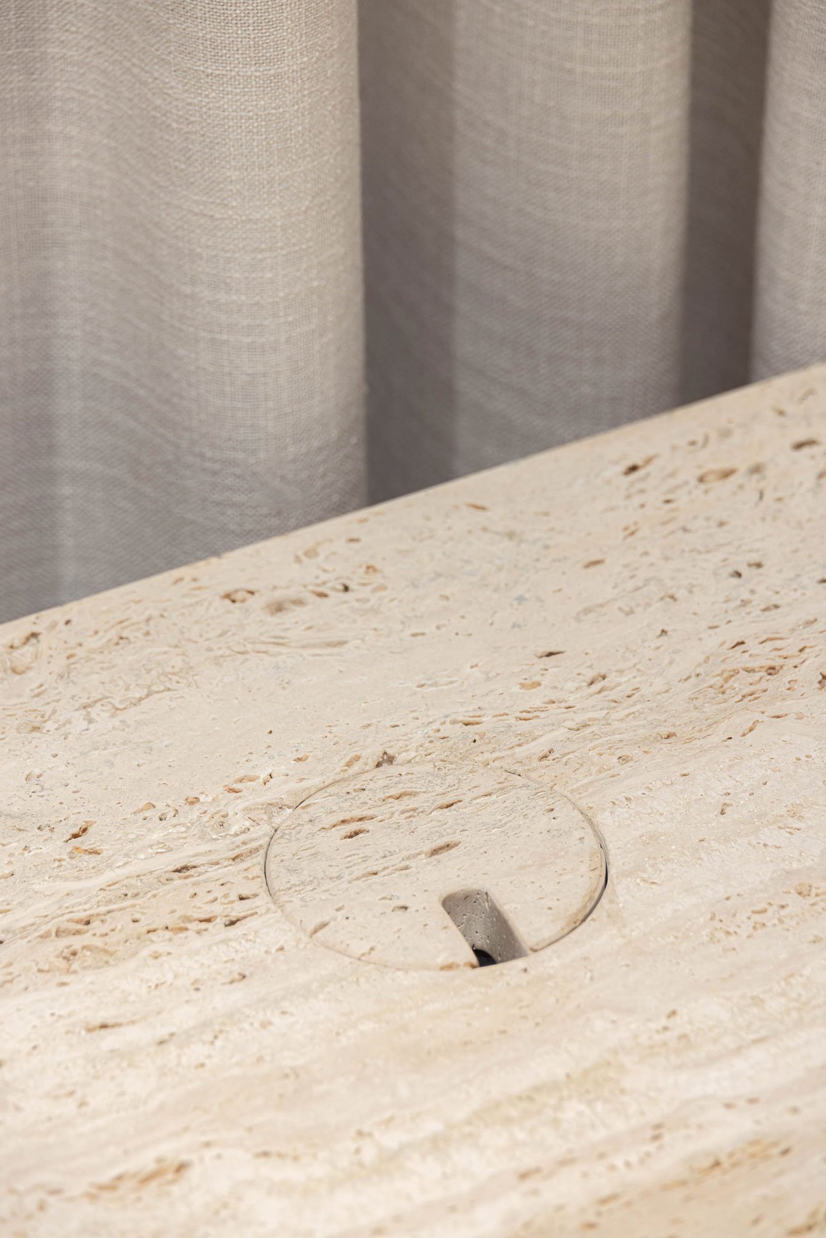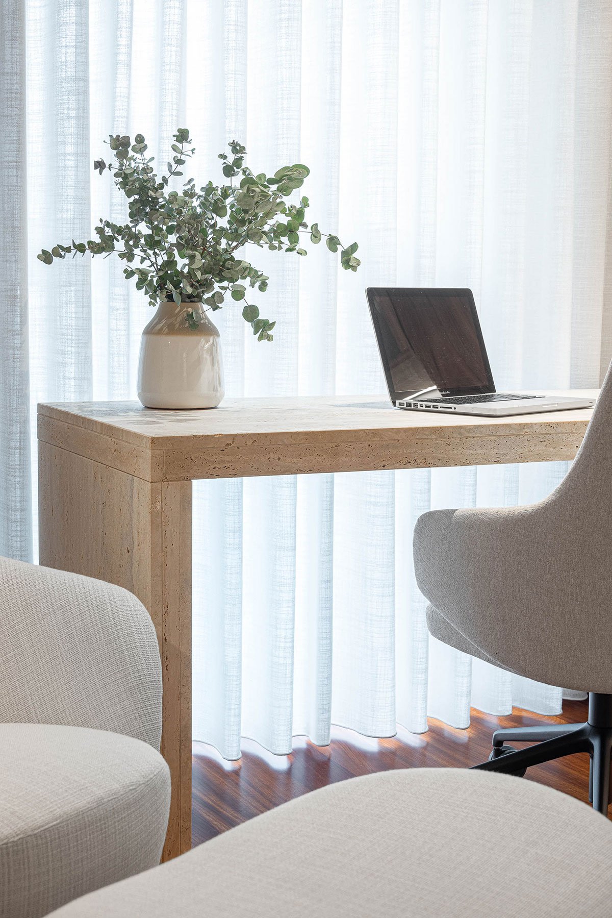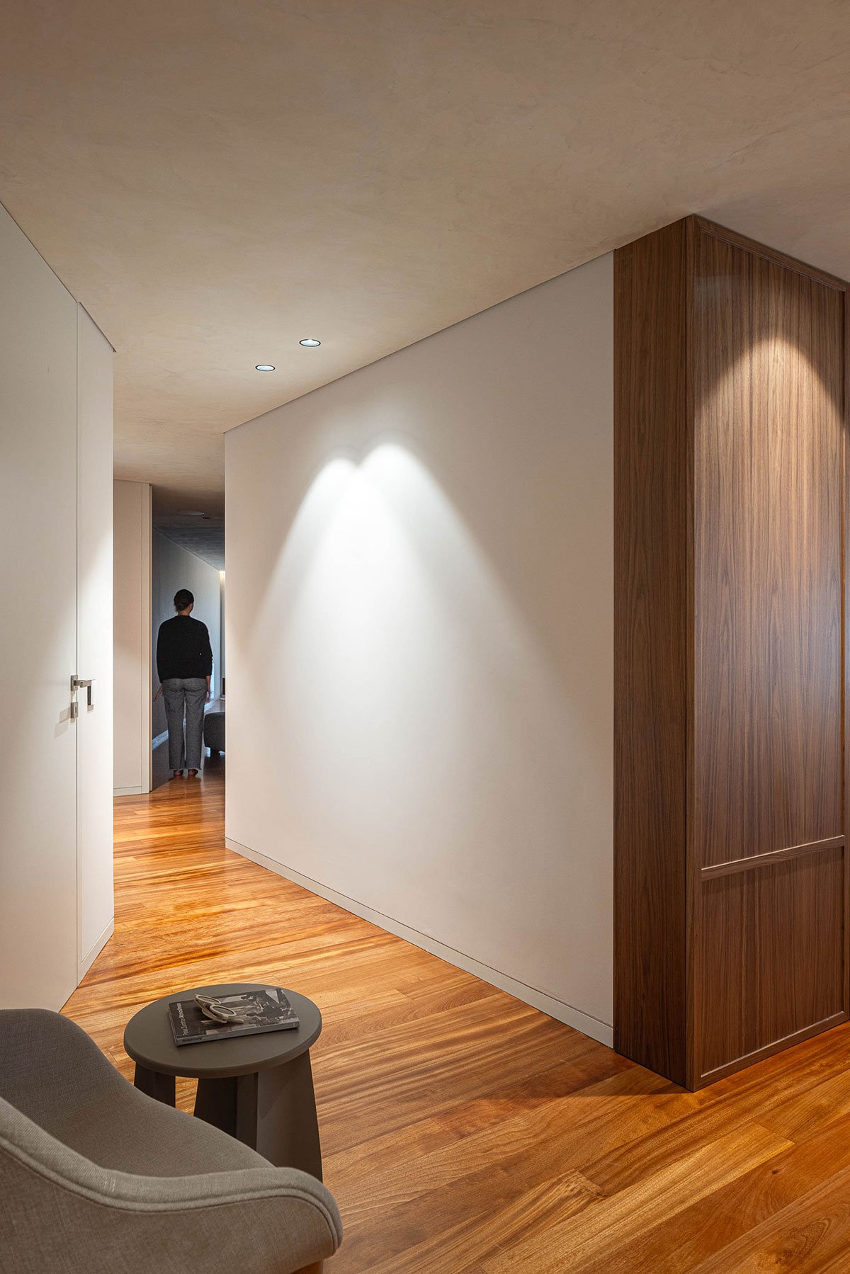 The common spaces, such as the living room and office, were designed to convey a feeling of comfort, harmony and lightness and also to anchor the connection to the place, Vila do Conde, a city surrounded by beaches and pine forests. Travertine, in sandy tones, and wood are the preponderant elements in the interiors, combining the robustness and timelessness of the stone with the elegance and naturalness of walnut wood.