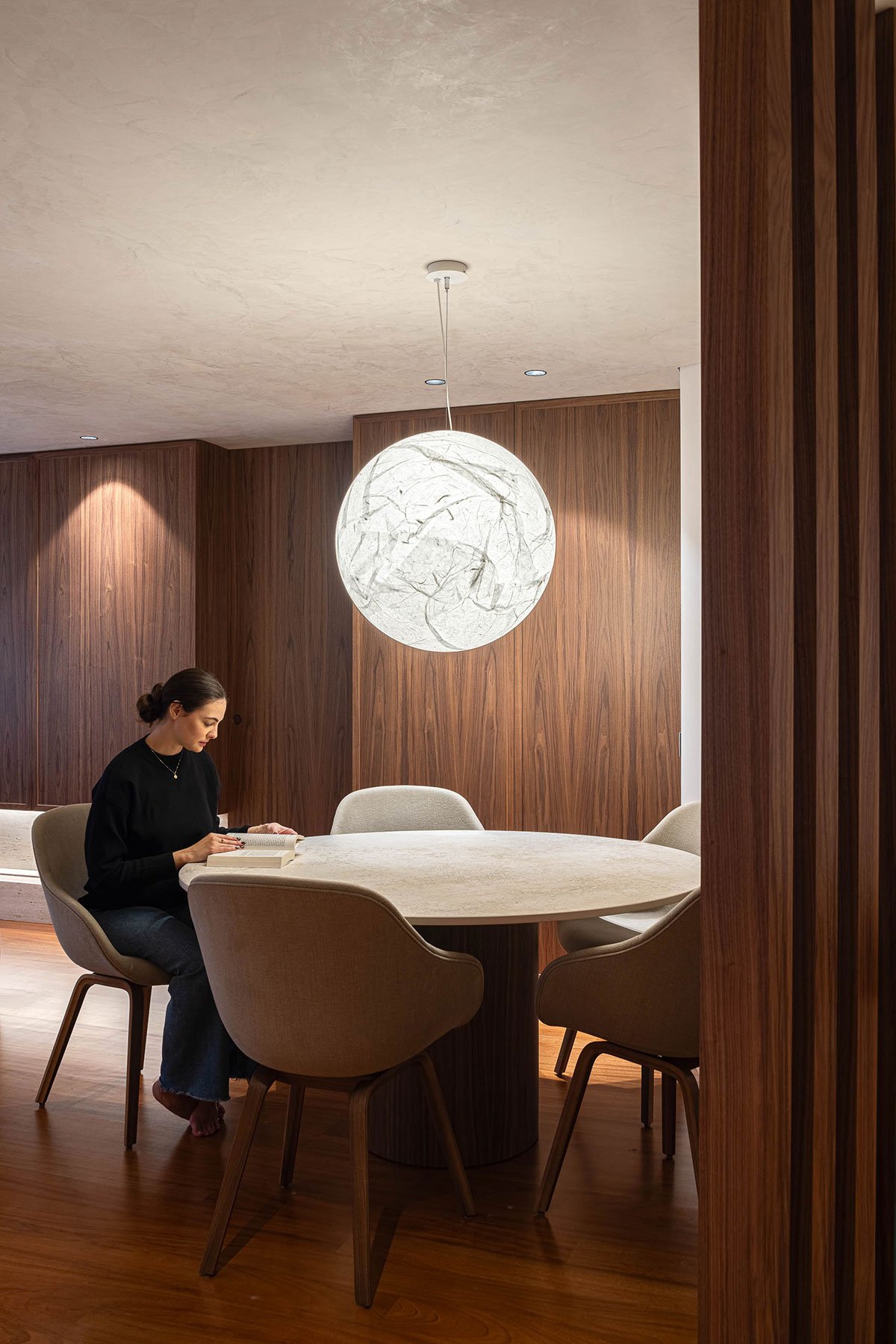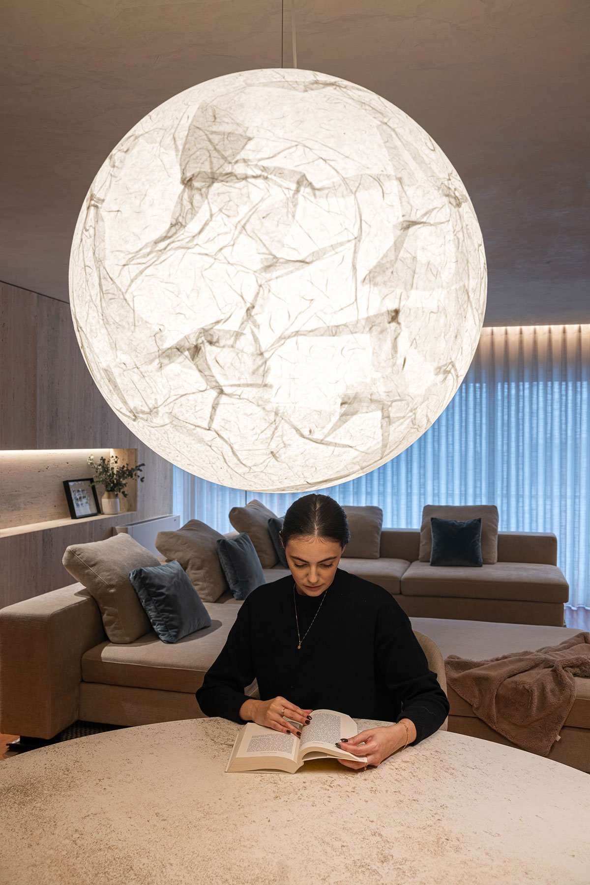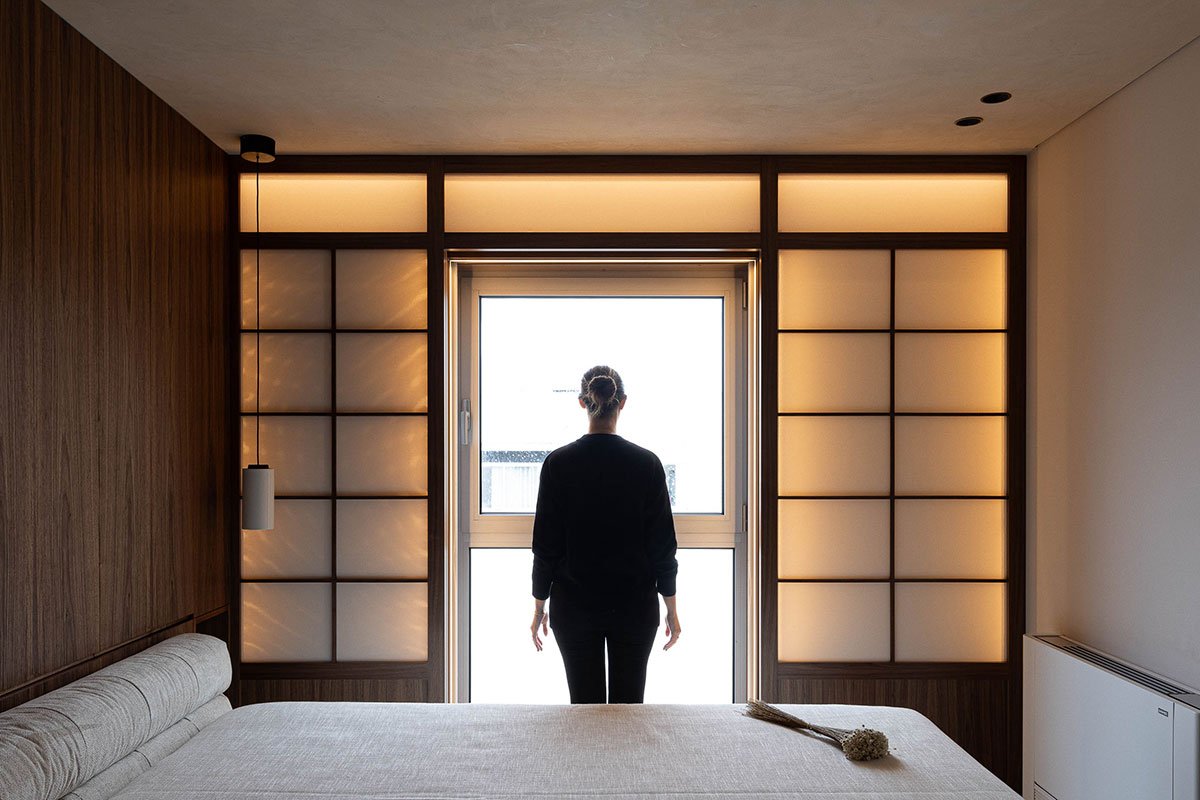 Alongside the minimalism of shapes and materials, objects with a striking identity were created, such as the Moon lamp, designed to represent the full moon, a symbol of prosperity, in Japanese paper, country of choice of one of the owners, that also inspired the design of one of the rooms, whose wooden panels and white canvas create an intimate and welcoming environment, which the couple favors.