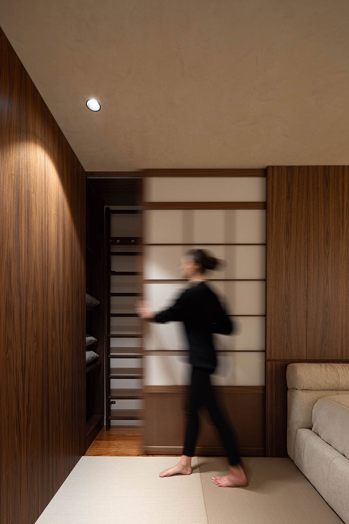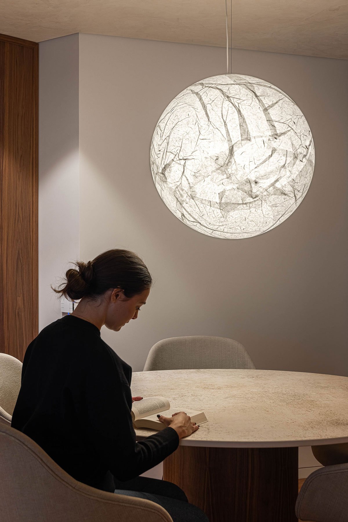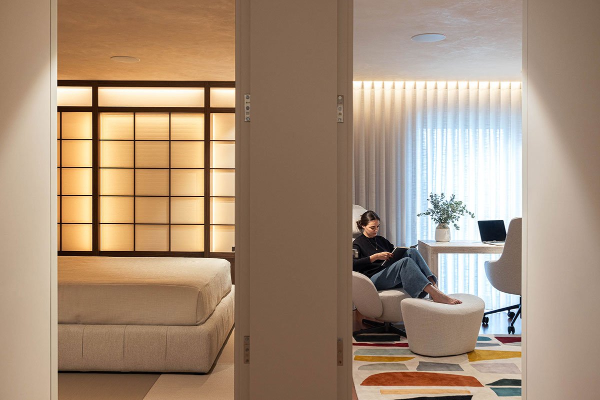 Alongside the minimalism of shapes and materials, objects with a striking identity were created, such as the Moon lamp, designed to represent the full moon, a symbol of prosperity, in Japanese paper, country of choice of one of the owners, that also inspired the design of one of the rooms, whose wooden panels and white canvas create an intimate and welcoming environment, which the couple favors.