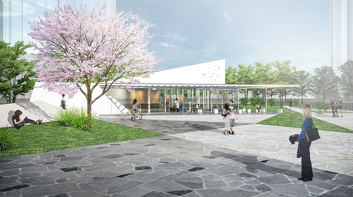 A geometrical order of irregular quadrilaterals and triangles can be drawn from the context of the park where the community center is located, so that the basic form of the building is created. It grows up from the landscape, emerging at the end of the entrance square on the riverbank. The building and the slope of greenery surround the square, defining its impression of space and dynamic atmosphere. The landscape of the park will be renovated together in the same geometrical order.