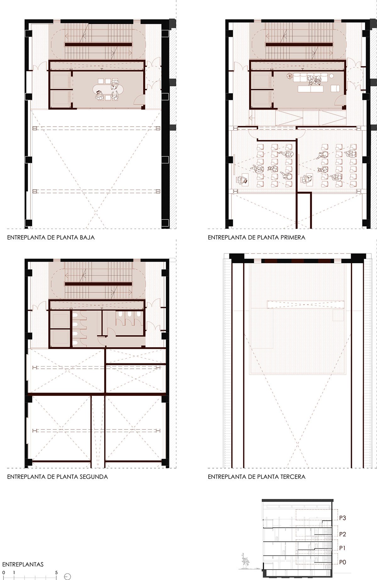 The architectural project complements the transparency of the new façade with the construction of an adjoining recessed plaza that allows the entry of daylight into what originally was a semi-basement level, where the restaurant is located, and also provides direct access to the building, characteristics that reinforce the public character of the facility.