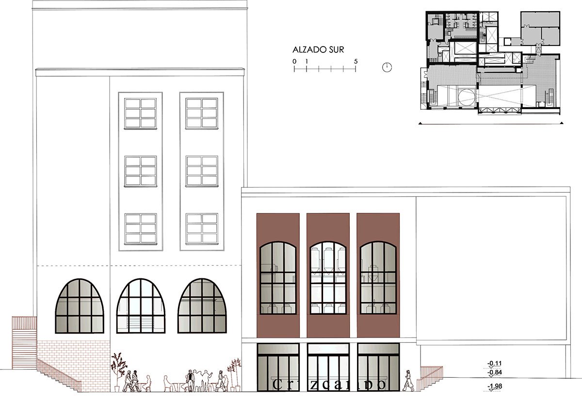 The project envisages the removal of part of this wall, making the intervened buildings more accessible and visible, establishing direct contact with the city. To this end, in the Cruzcampo Factory building, the removal of the wall is accompanied by the construction of a recessed plaza that permits direct entrance into what was a semi-basement level, where the restaurant is located, and improves entry of natural light to the space, design moves that reinforce the public nature of the facility. In the case of the Cruzcampo Tower building, the demolition of part of the wall and the urbanization with flowerbeds are essential for the project.