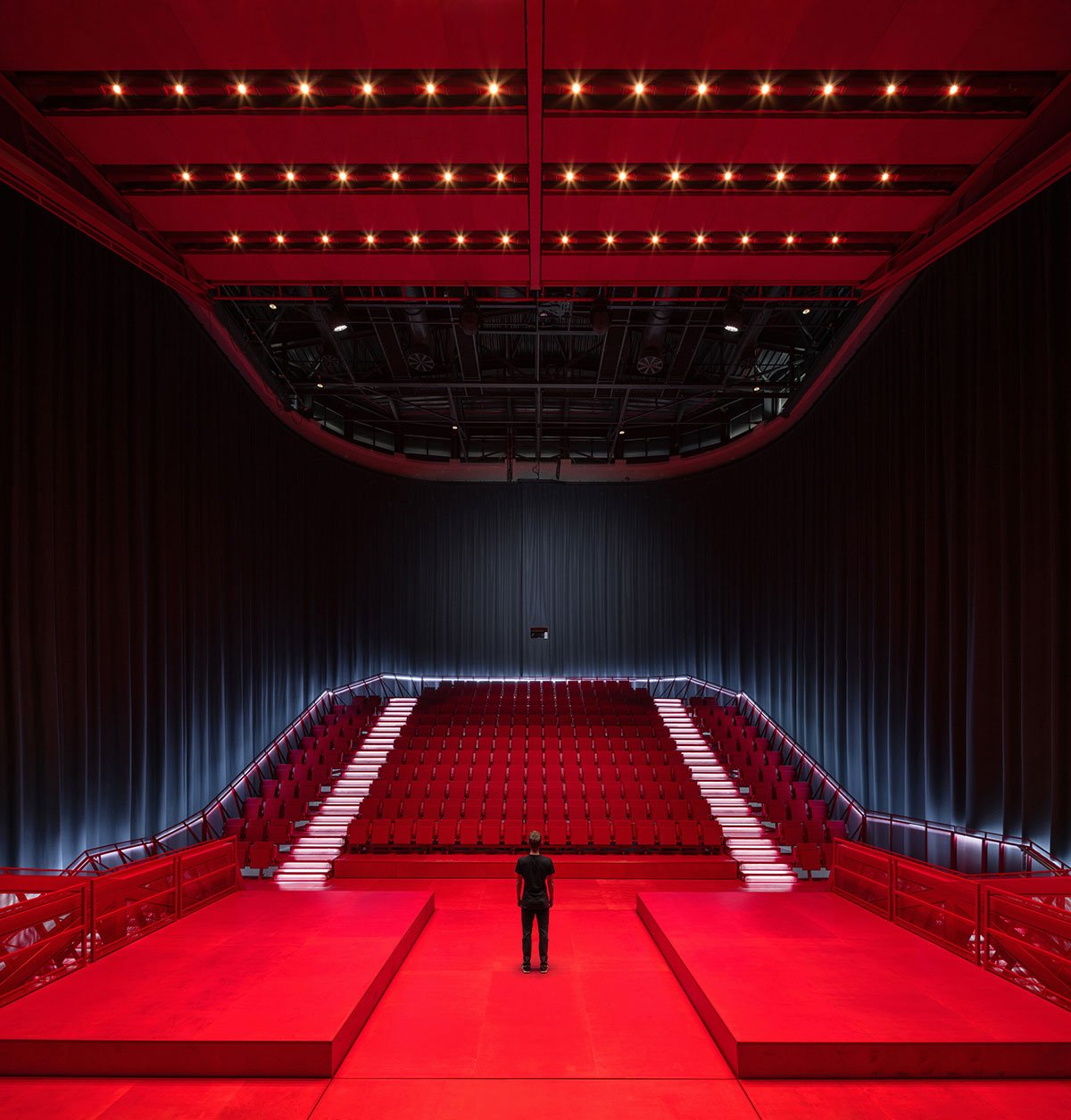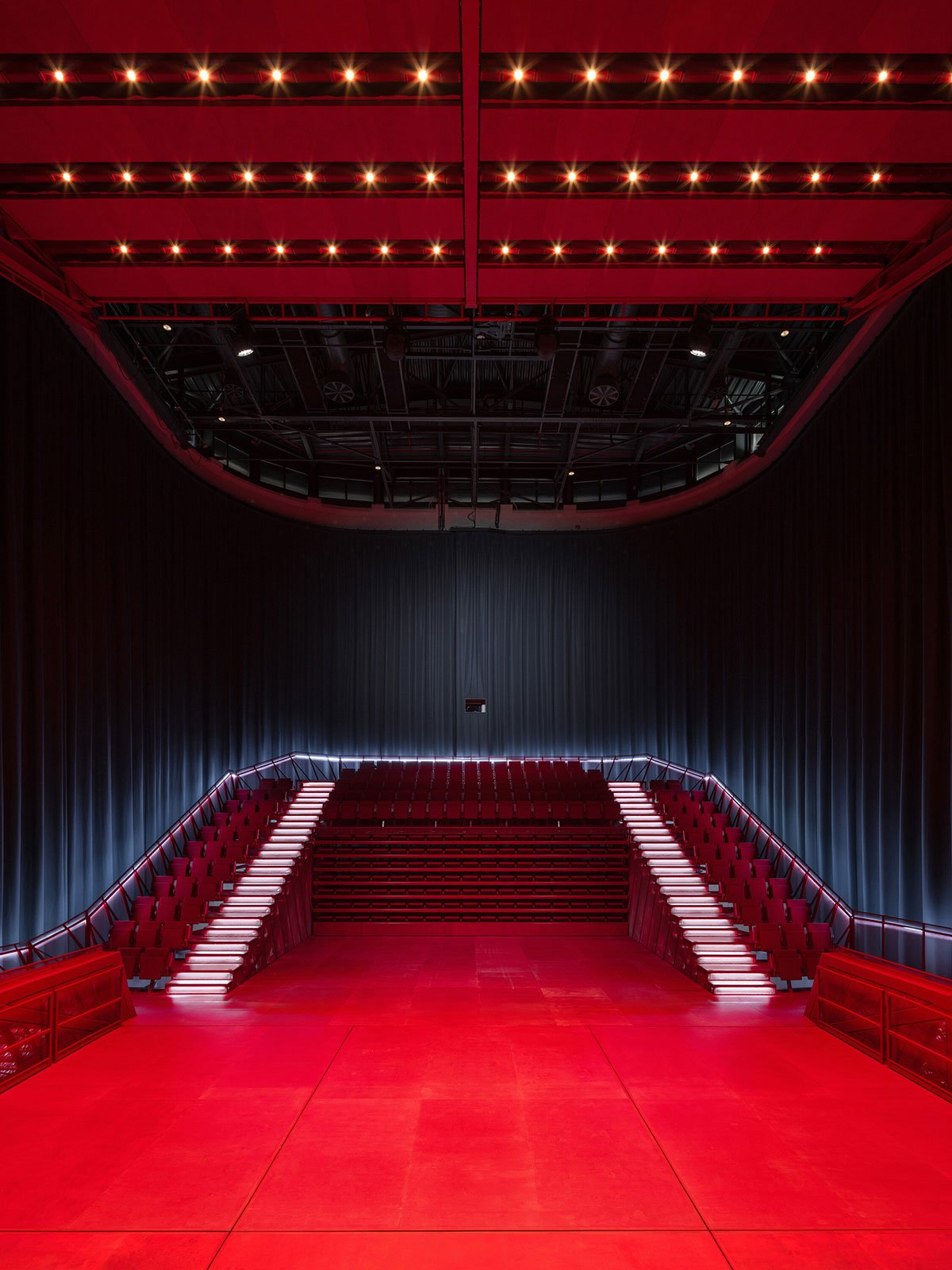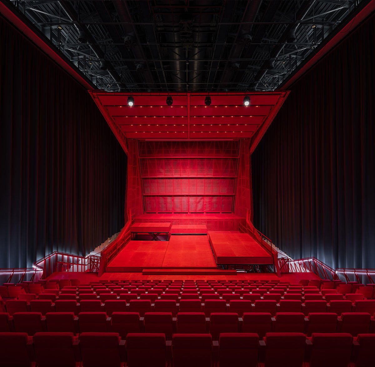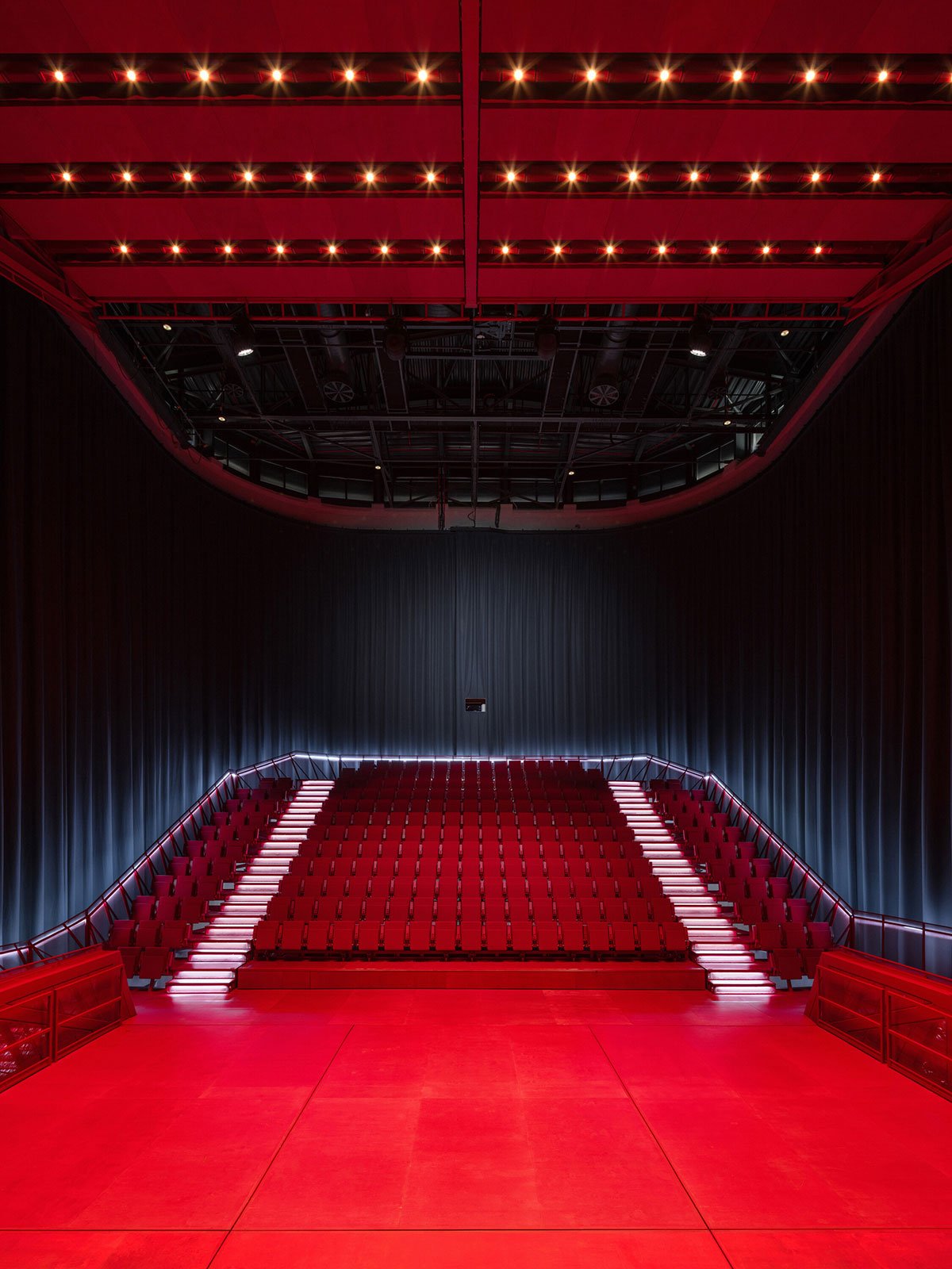 The hall is fitted with technology to accommodate concerts, theater performances, dance, conferences, film screenings, and popular music. A heavy blackout curtain allows the space to be completely darkened and acoustically dampened. All scenic and acoustic technologies are integrated into the hall’s structure, while ventilation and fire safety systems are housed in a block above the main staircase roof.