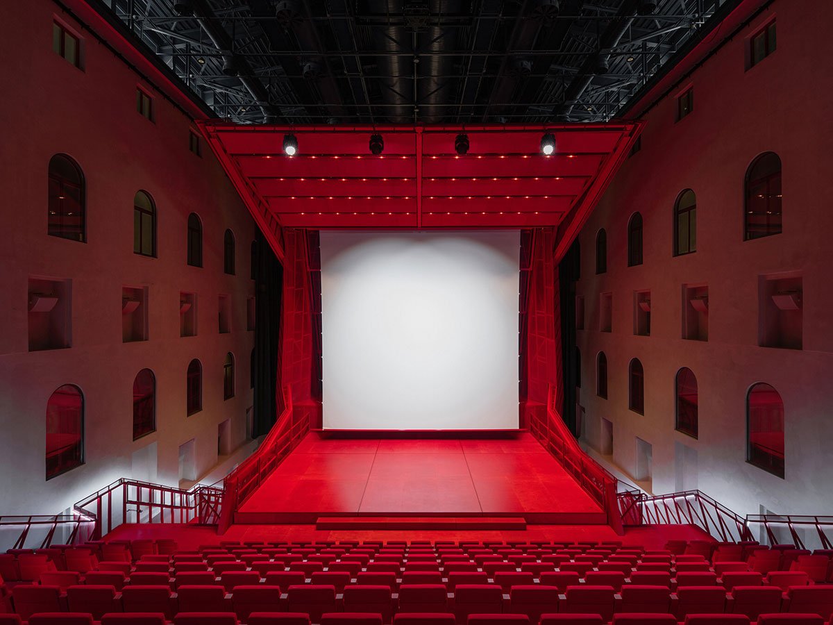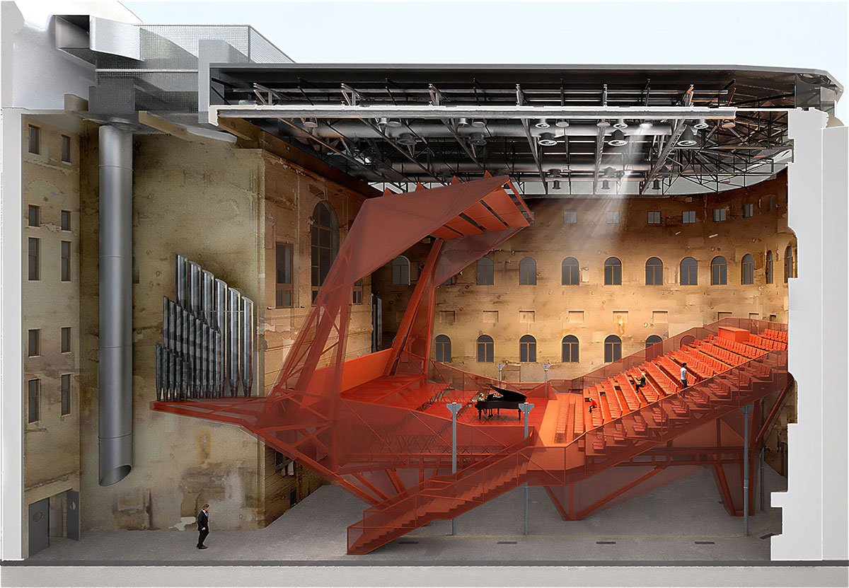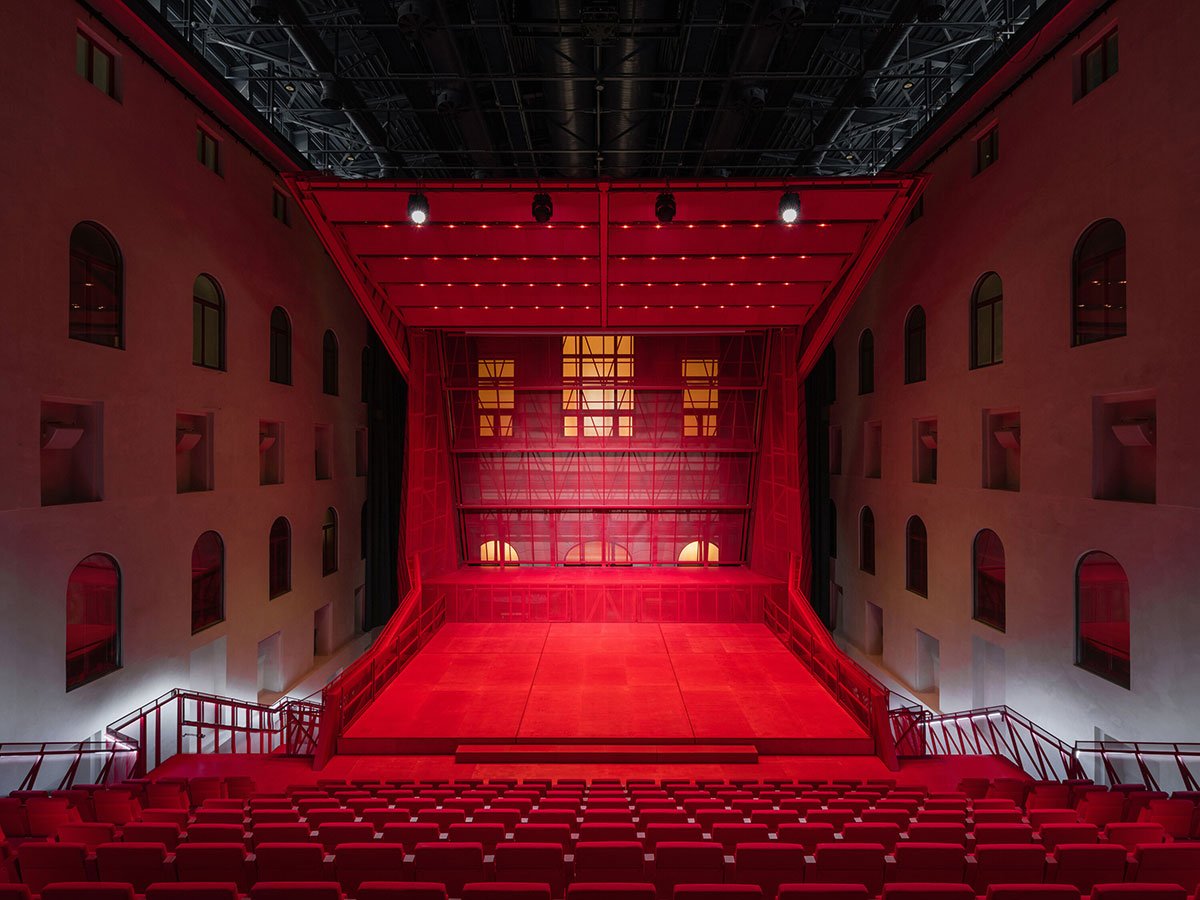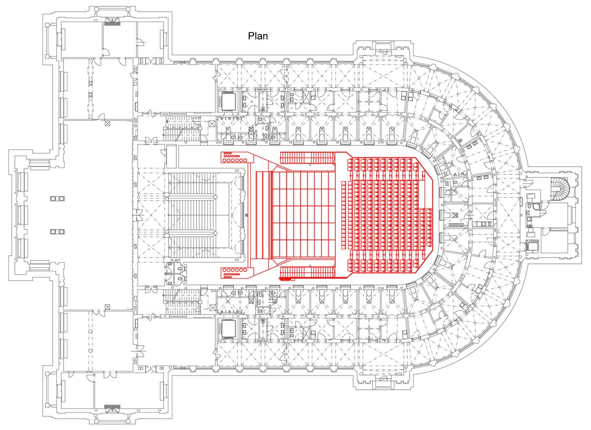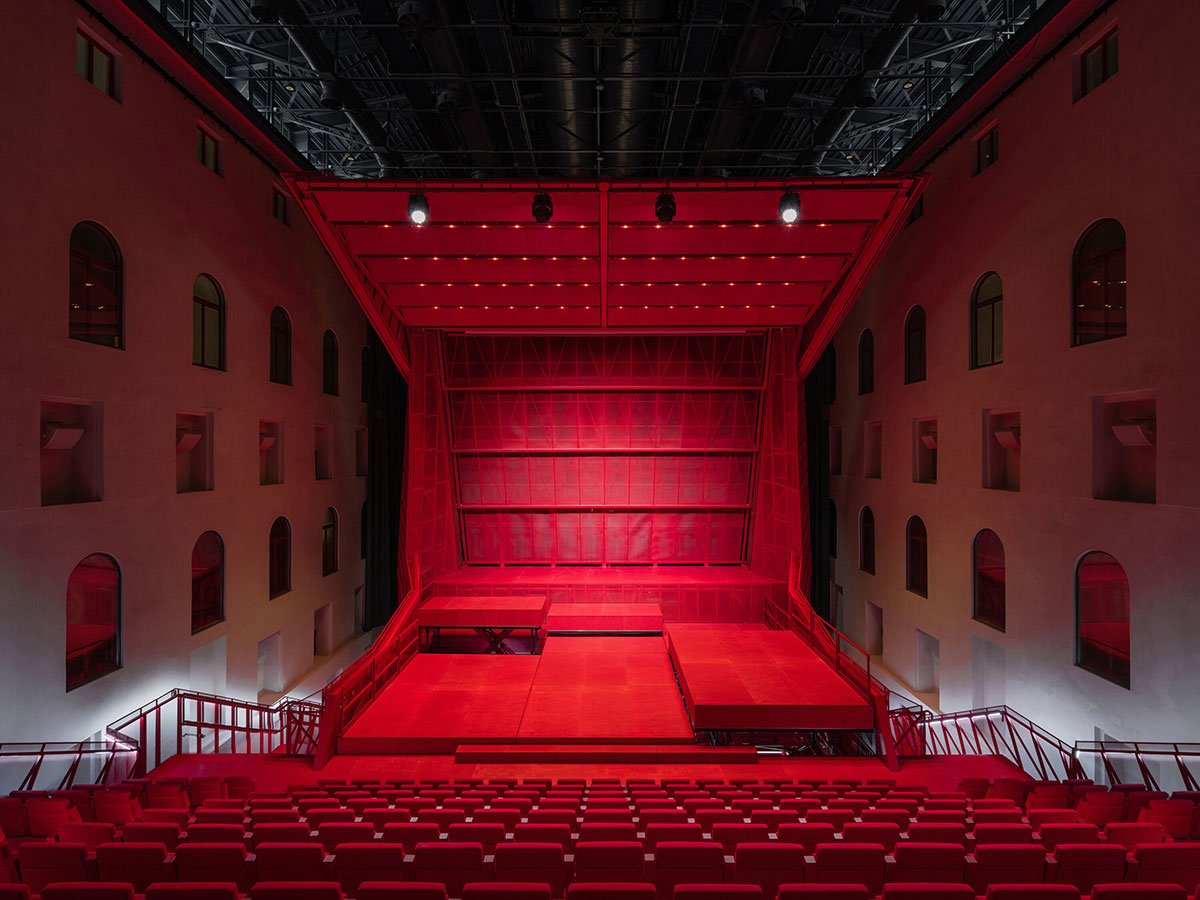 The hall is fitted with technology to accommodate concerts, theater performances, dance, conferences, film screenings, and popular music. A heavy blackout curtain allows the space to be completely darkened and acoustically dampened. All scenic and acoustic technologies are integrated into the hall’s structure, while ventilation and fire safety systems are housed in a block above the main staircase roof.