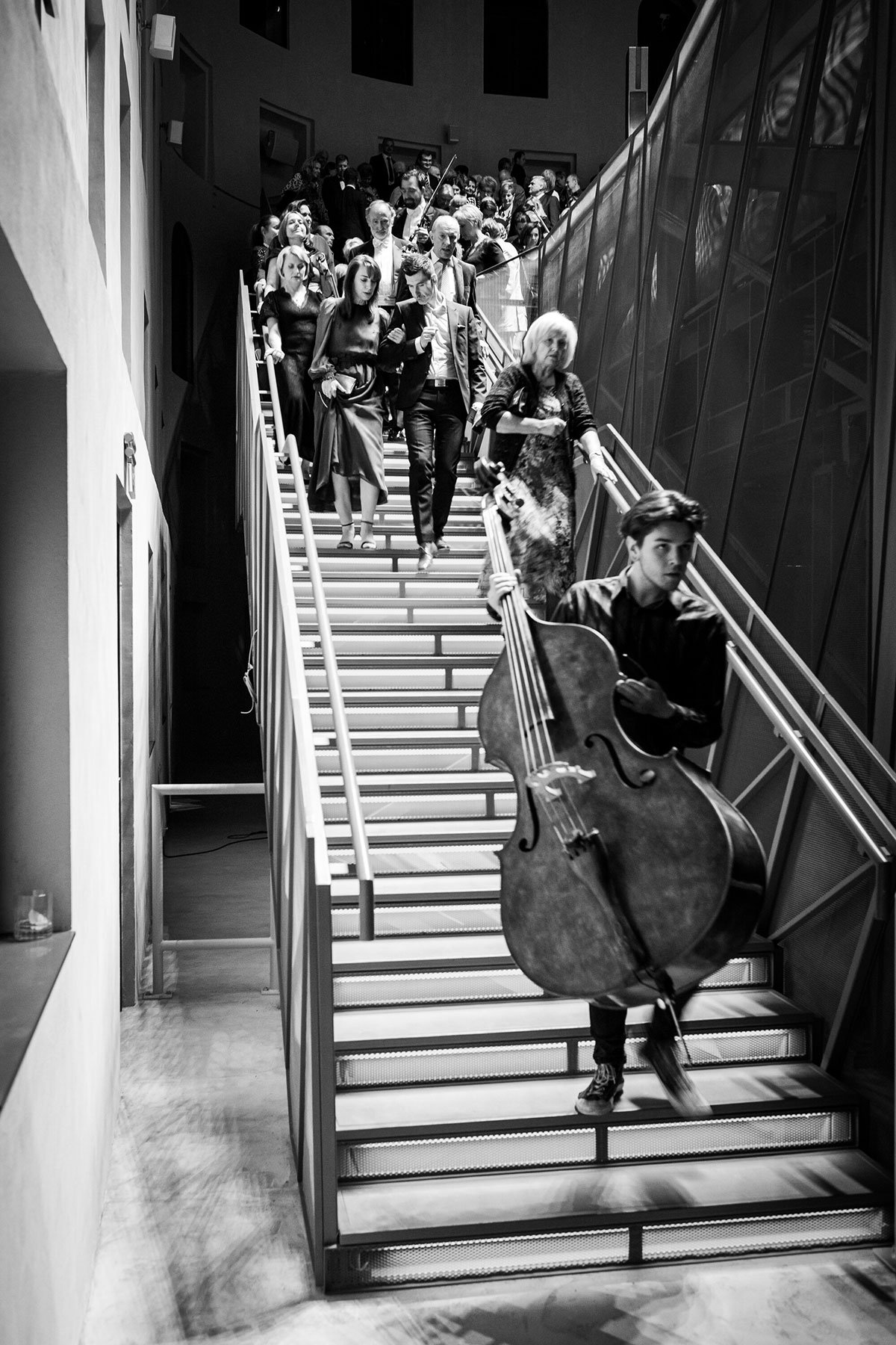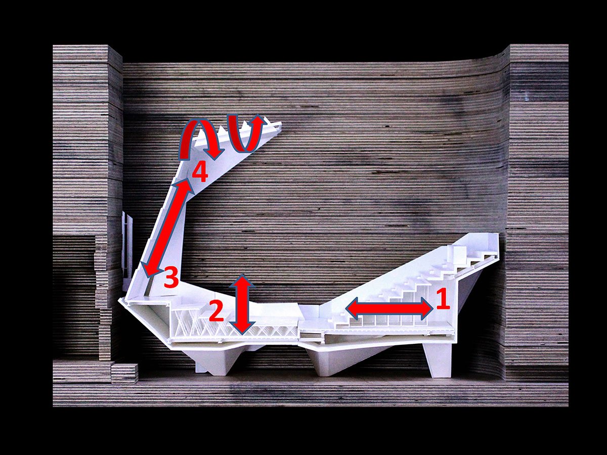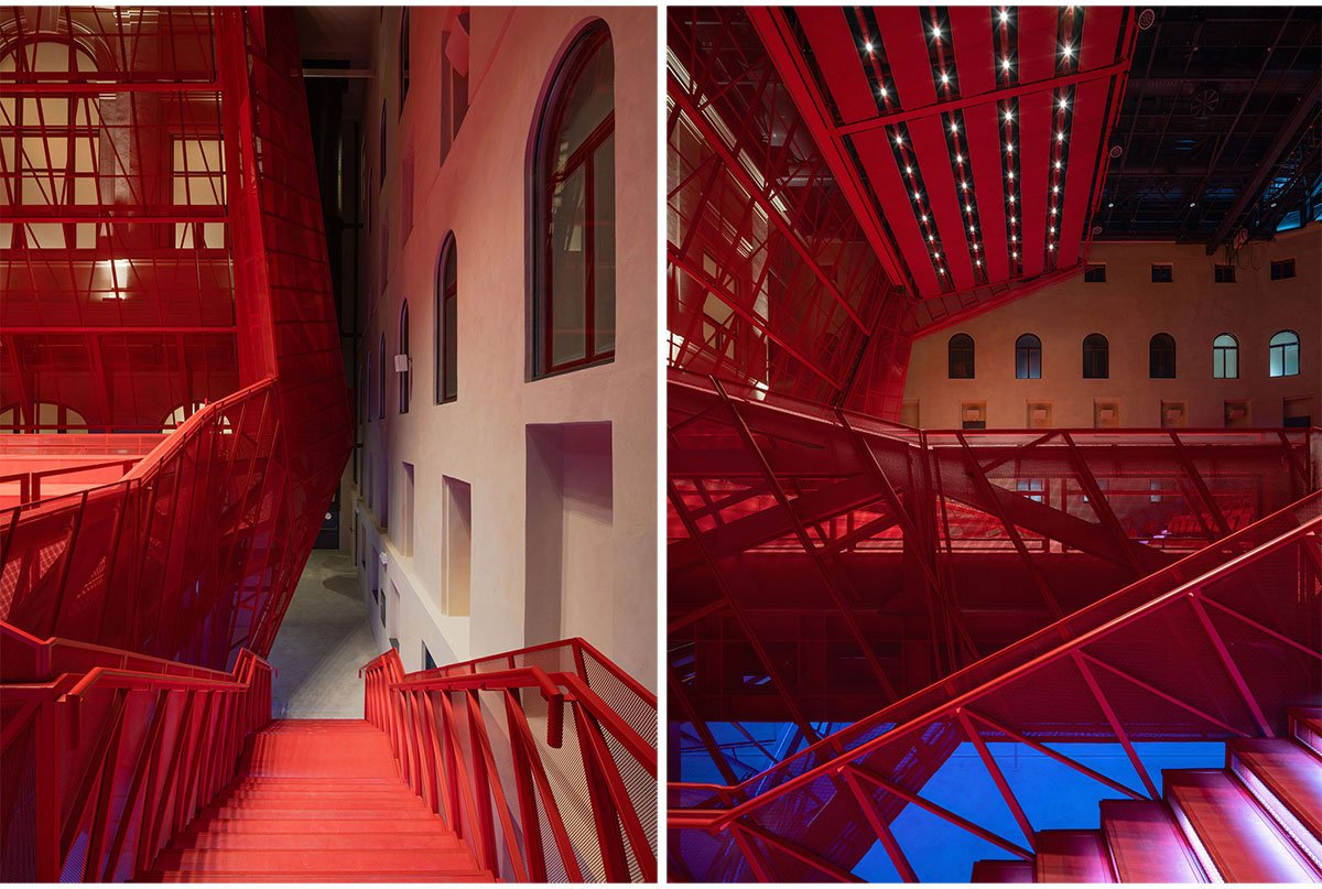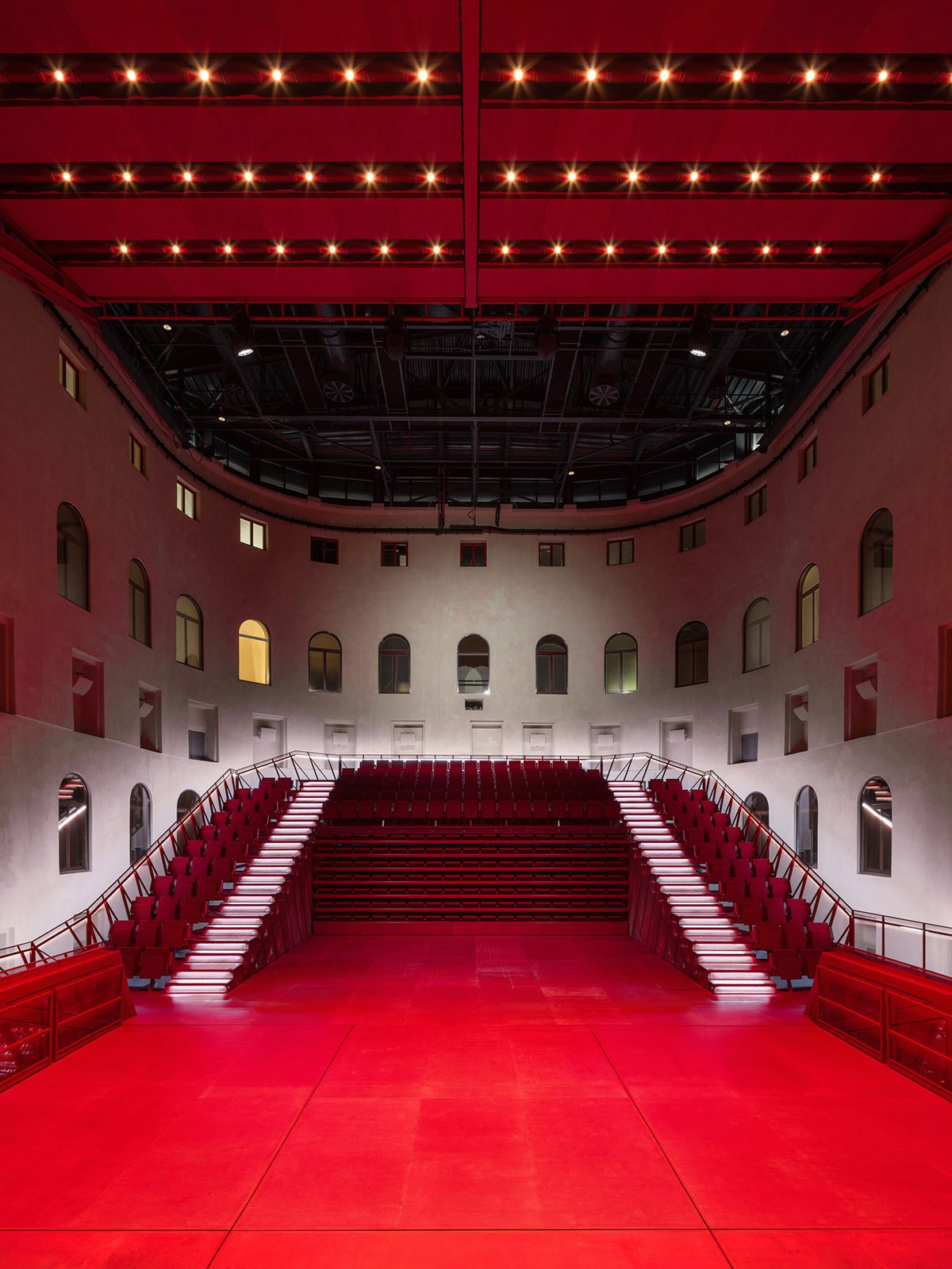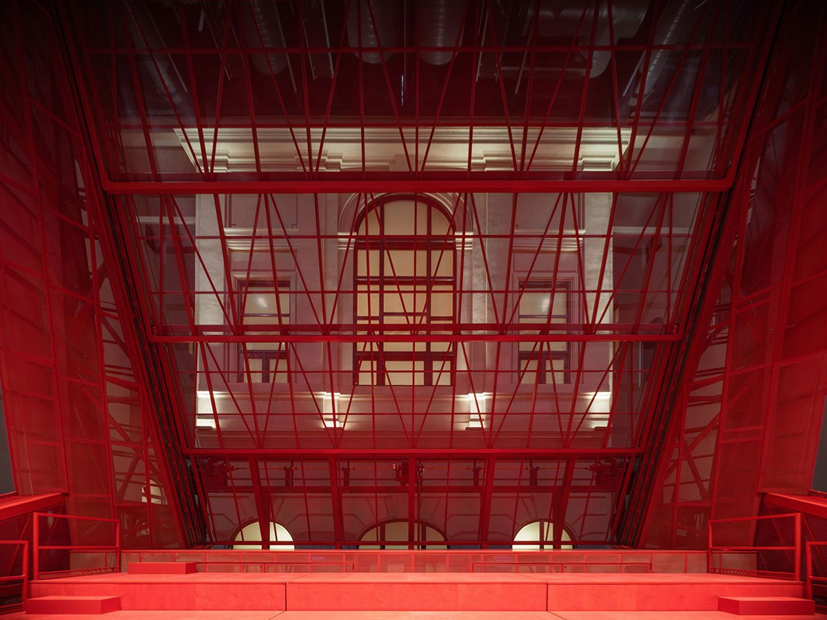 The hall is fitted with technology to accommodate concerts, theater performances, dance, conferences, film screenings, and popular music. A heavy blackout curtain allows the space to be completely darkened and acoustically dampened. All scenic and acoustic technologies are integrated into the hall’s structure, while ventilation and fire safety systems are housed in a block above the main staircase roof.