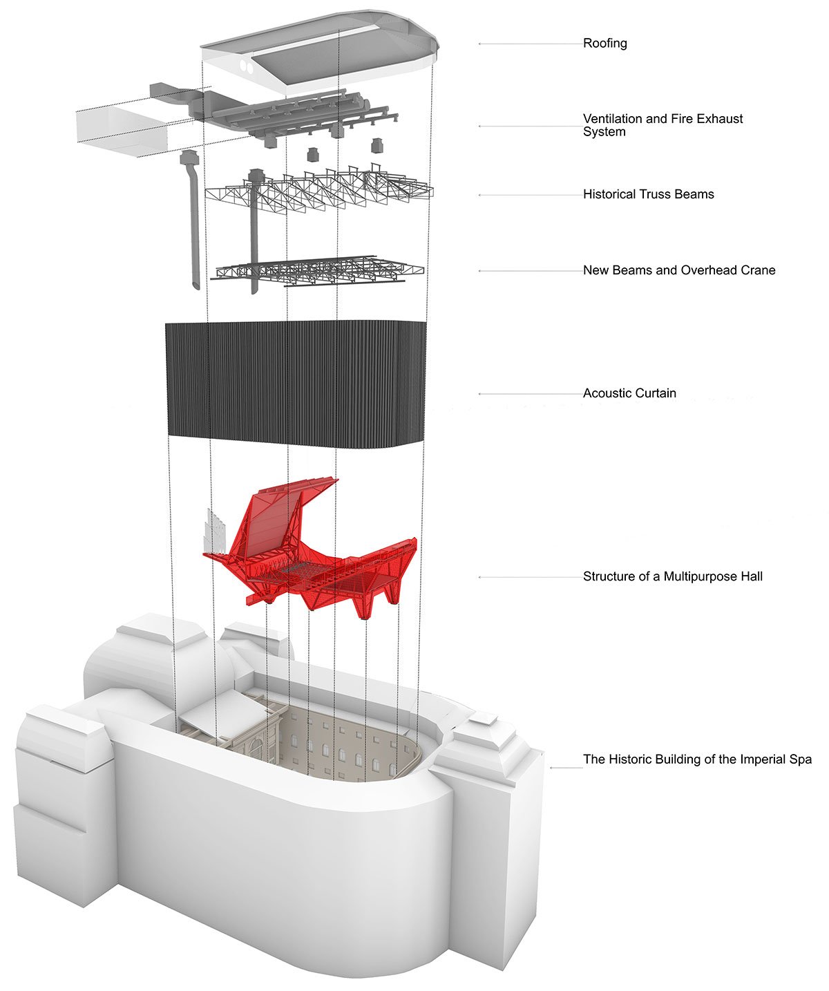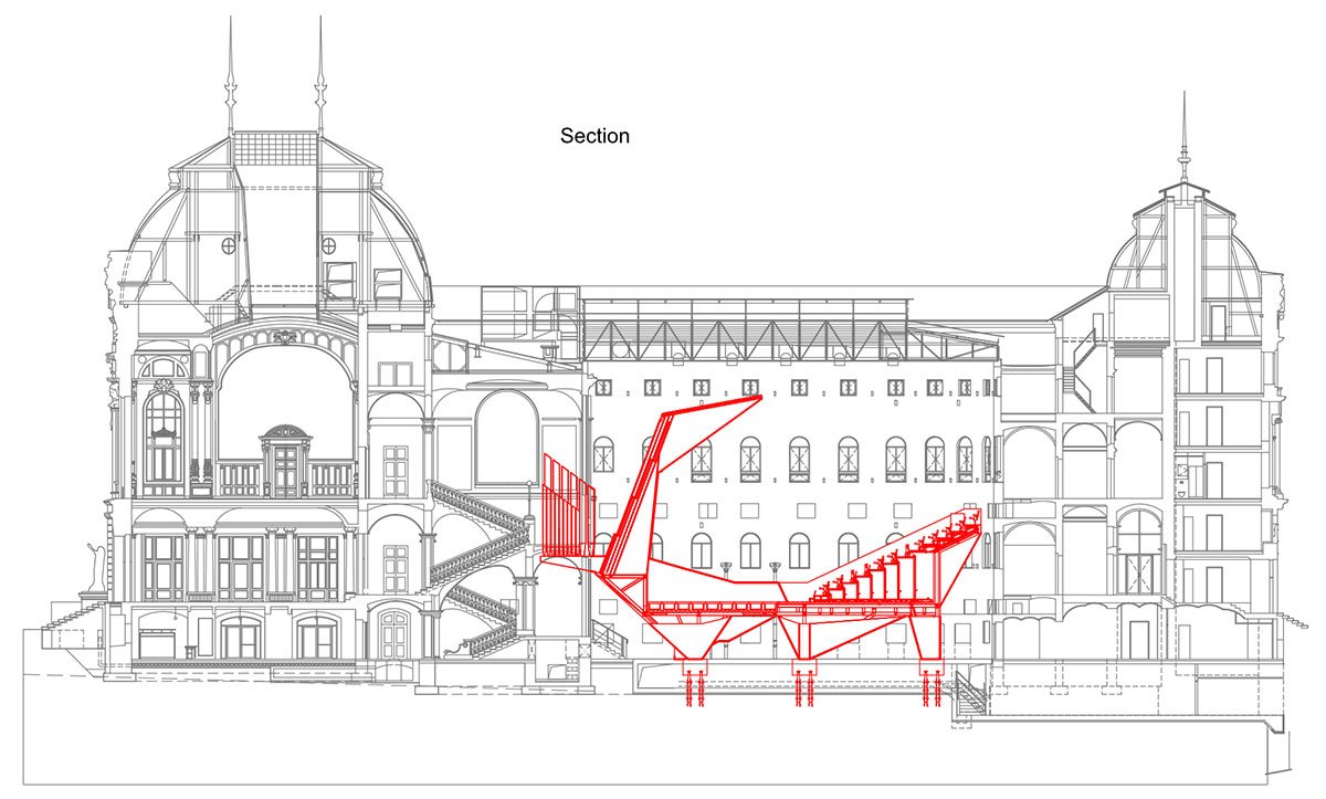 At the turn of the 20th and 21st centuries, the building was used only occasionally for cultural events and gradually fell into disrepair. A meaningful purpose was sought to justify the costly reconstruction. This situation persisted even during the preparation phase for the building works. Eventually, the investor decided to transform the Imperial Spa into a cultural institution, with a concert and multifunctional hall as its central feature. This hall was located in the building’s core, within the atrium, which had previously functioned as a utilitarian machine room with the peat conveyor.