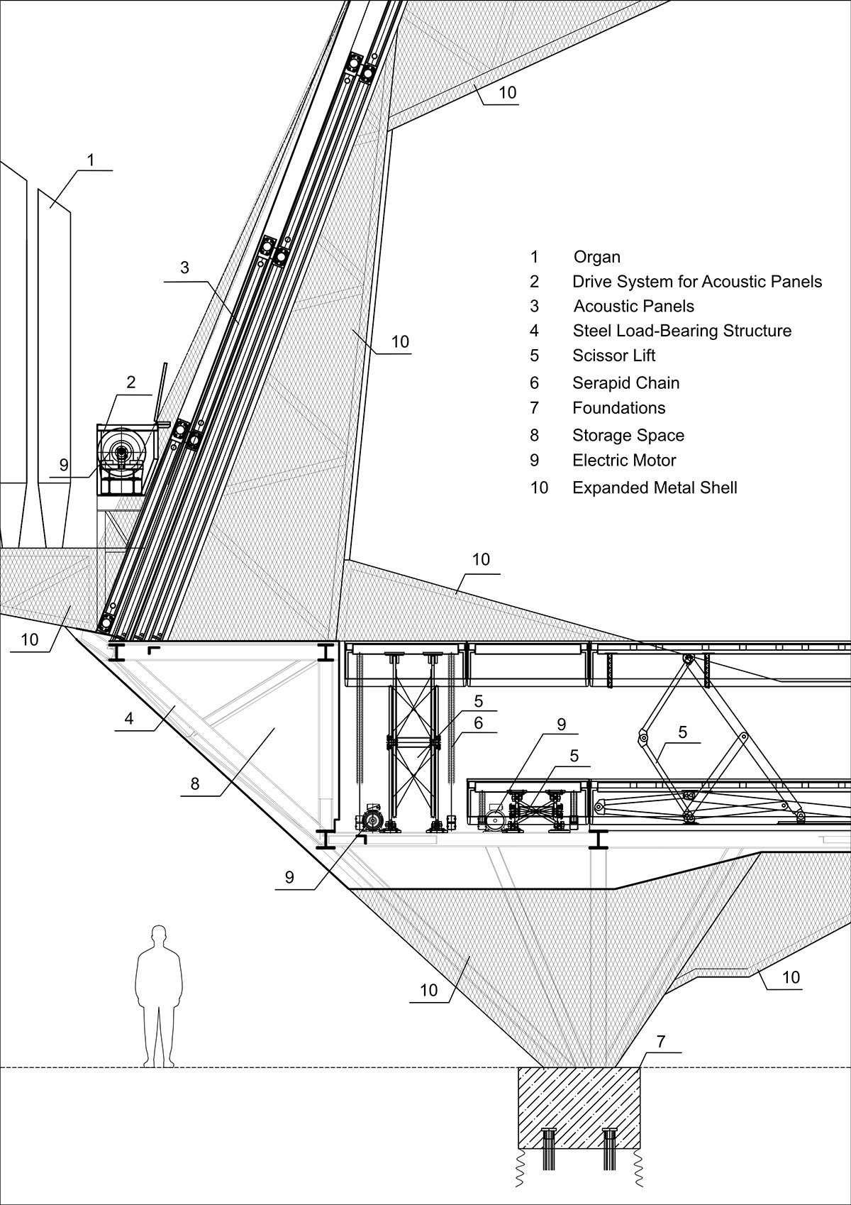 The hall is equipped with elements that adjust reverberation time, as well as the direction and intensity of sound energy. The orchestral shell features a retractable screen that reflects sound towards the audience. Rotating triangular panels above the stage can reflect, absorb, scatter, or direct sound. Wooden panels on a steel framework in the orchestra’s floor serve as resonators, harmonizing with the musicians’ instruments.