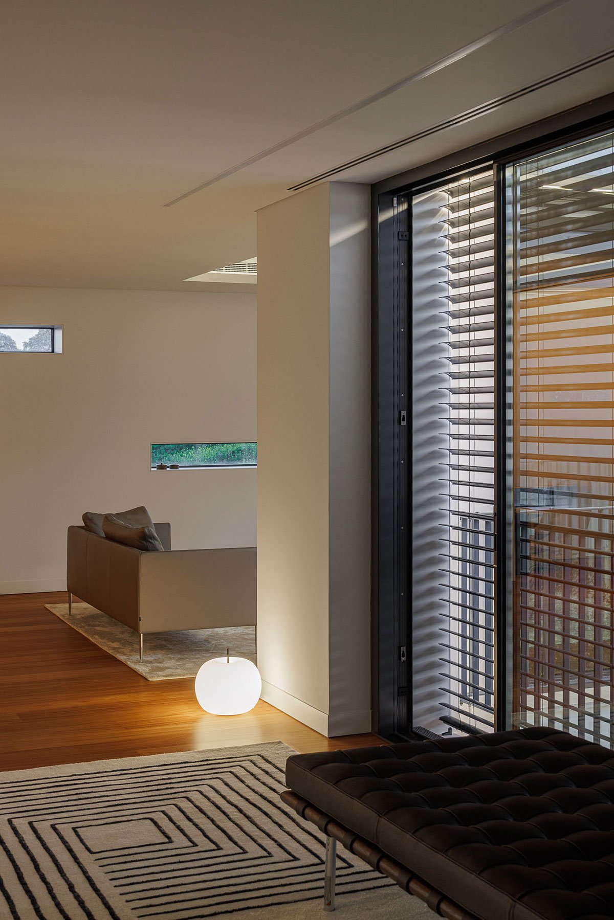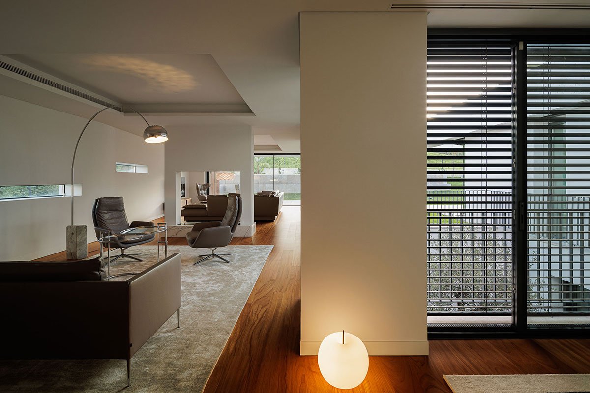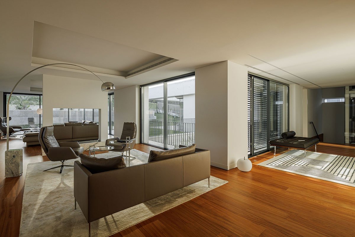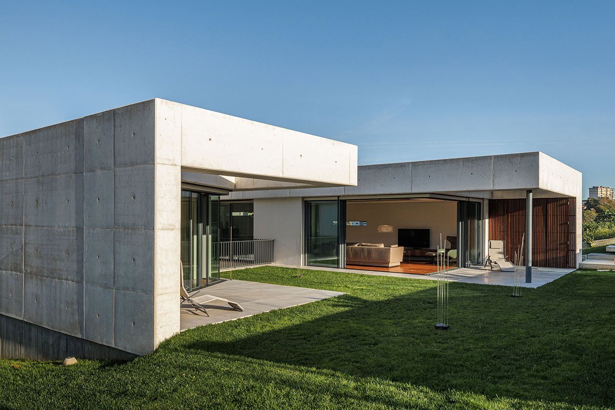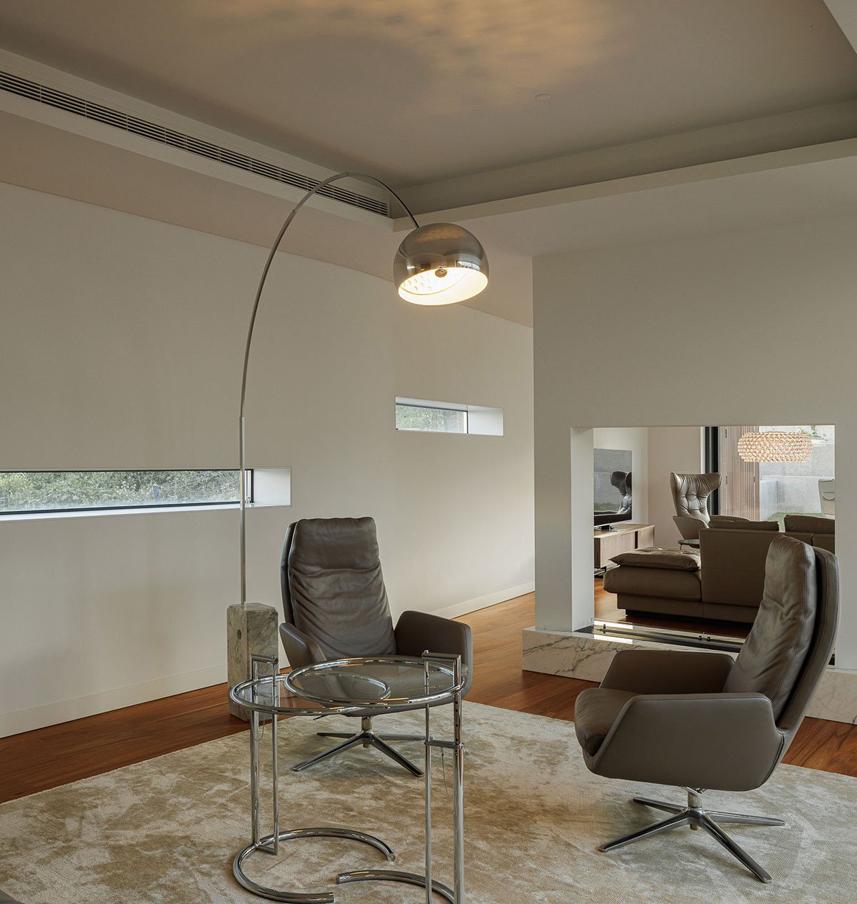 Urban and landscape integration is ensured, as the materiality of the facades leaves the volume sober and camouflaged in the terrain. As this is a terrain with a steep slope, it was possible to let the volume function in two overlapping layers: one that serves as a base and is embedded in the terrain, and another that levitates over the first, represented by a white element, and where the social part of the house develops.