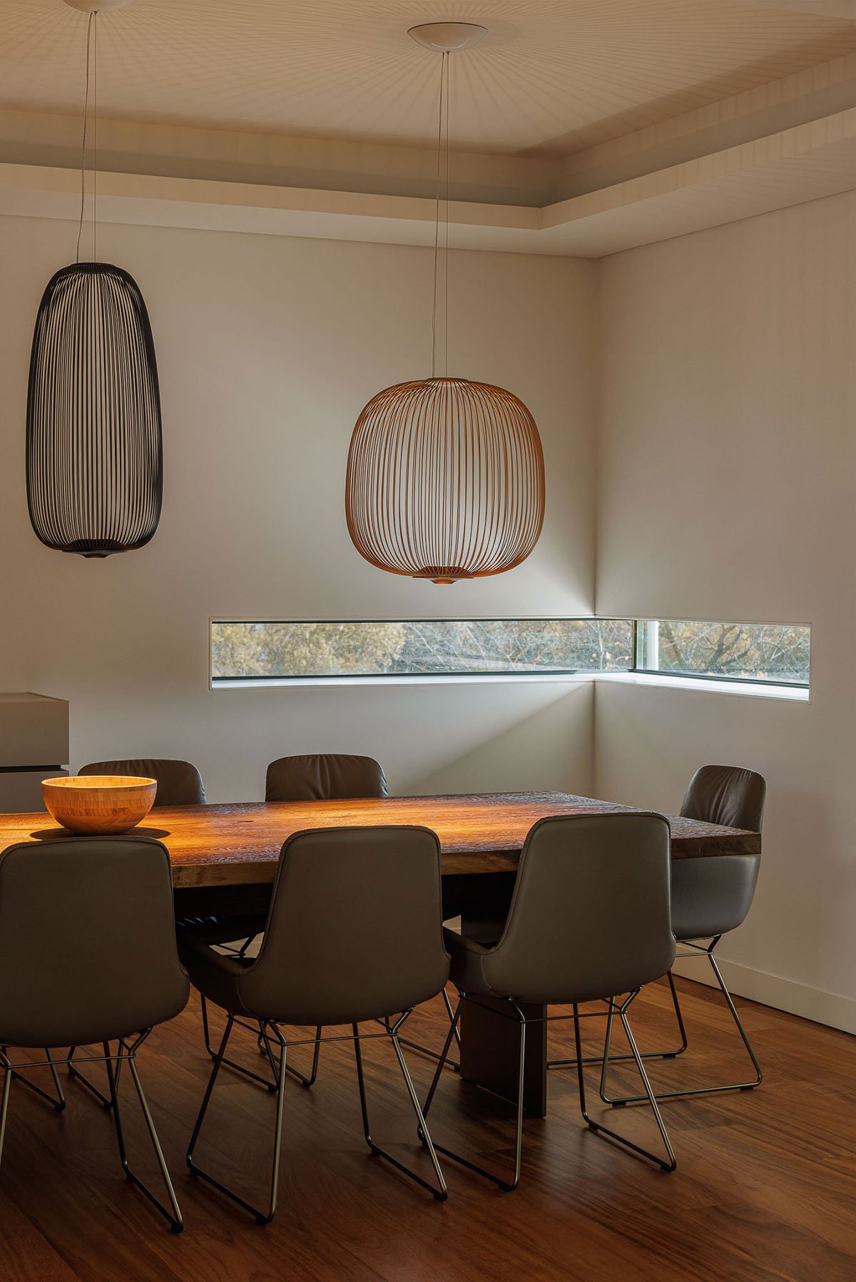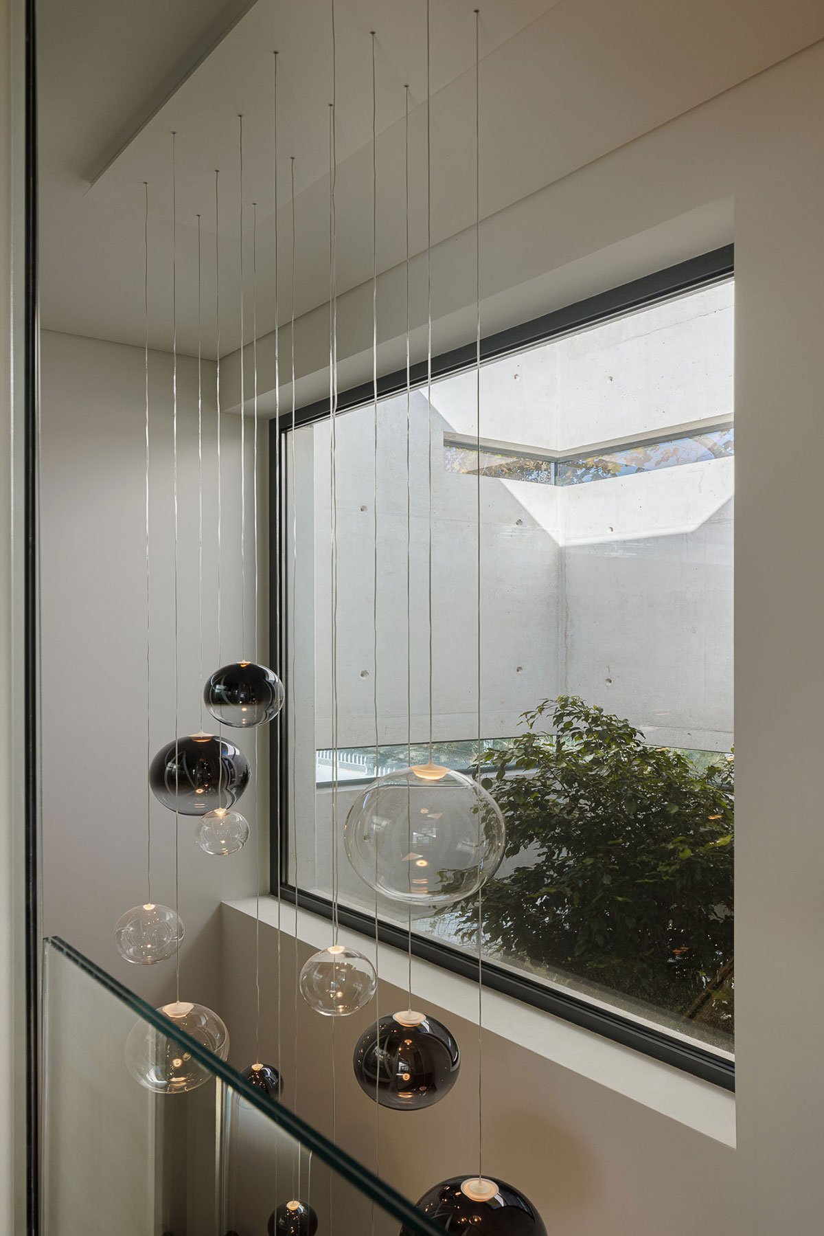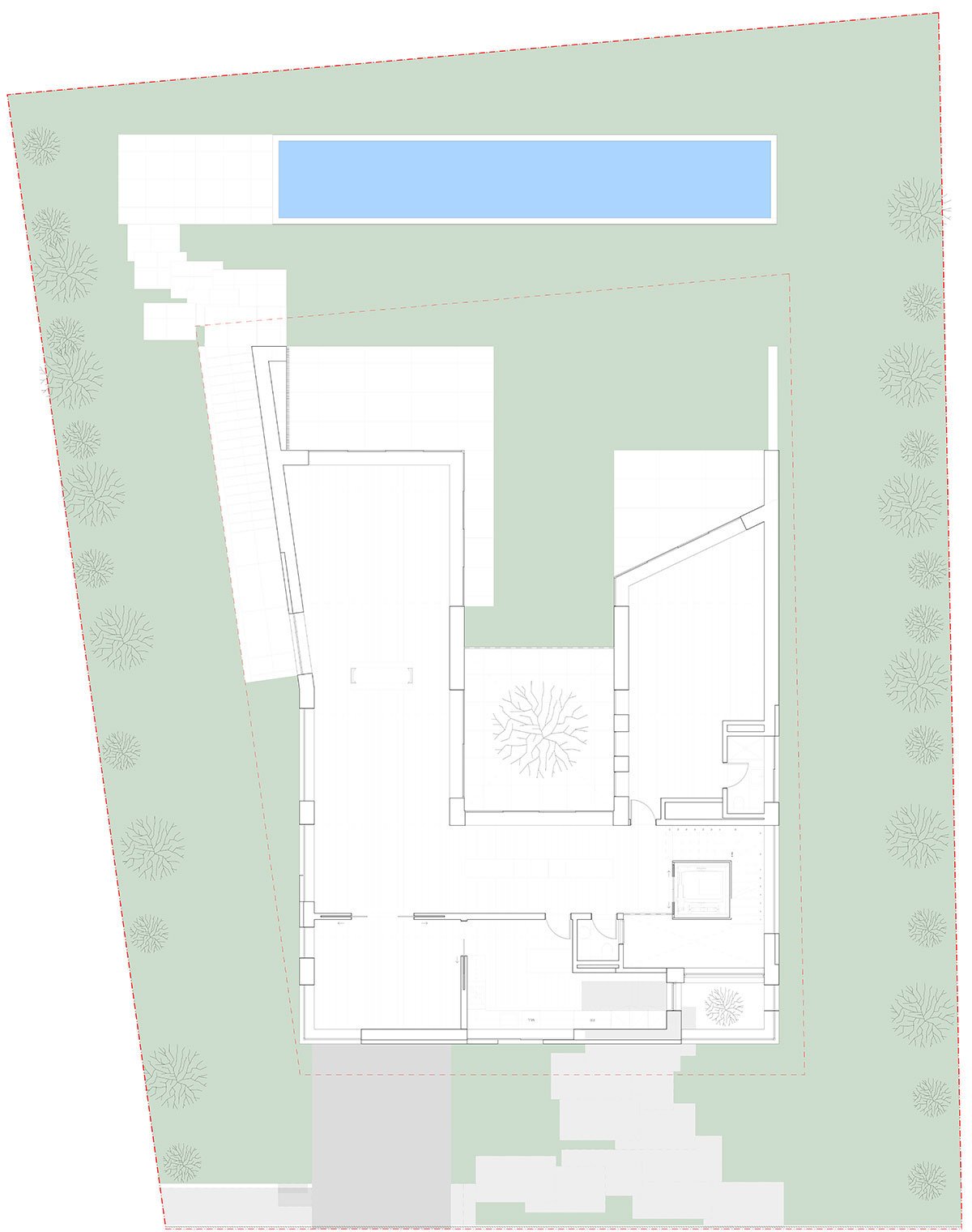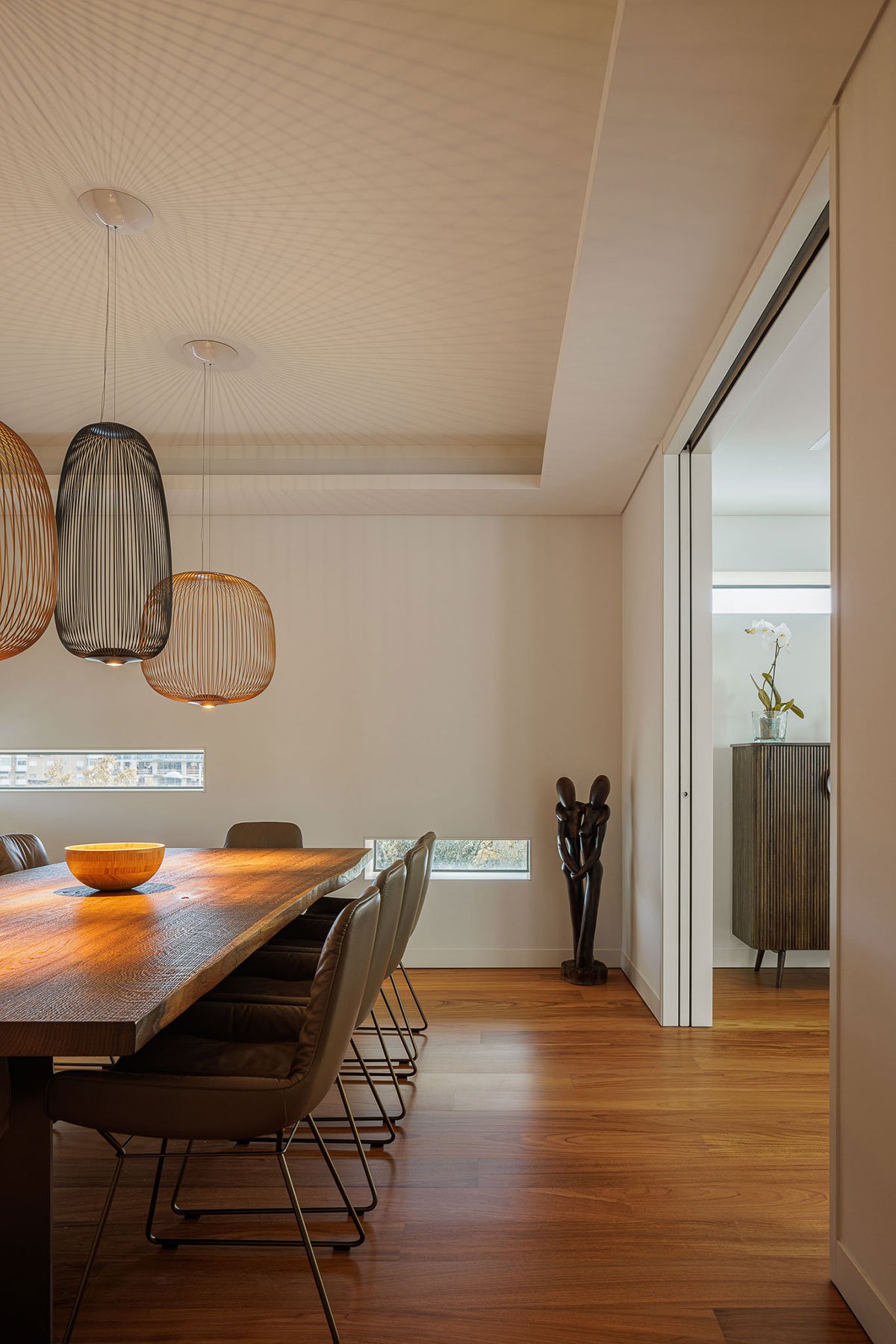 Urban and landscape integration is ensured, as the materiality of the facades leaves the volume sober and camouflaged in the terrain. As this is a terrain with a steep slope, it was possible to let the volume function in two overlapping layers: one that serves as a base and is embedded in the terrain, and another that levitates over the first, represented by a white element, and where the social part of the house develops.