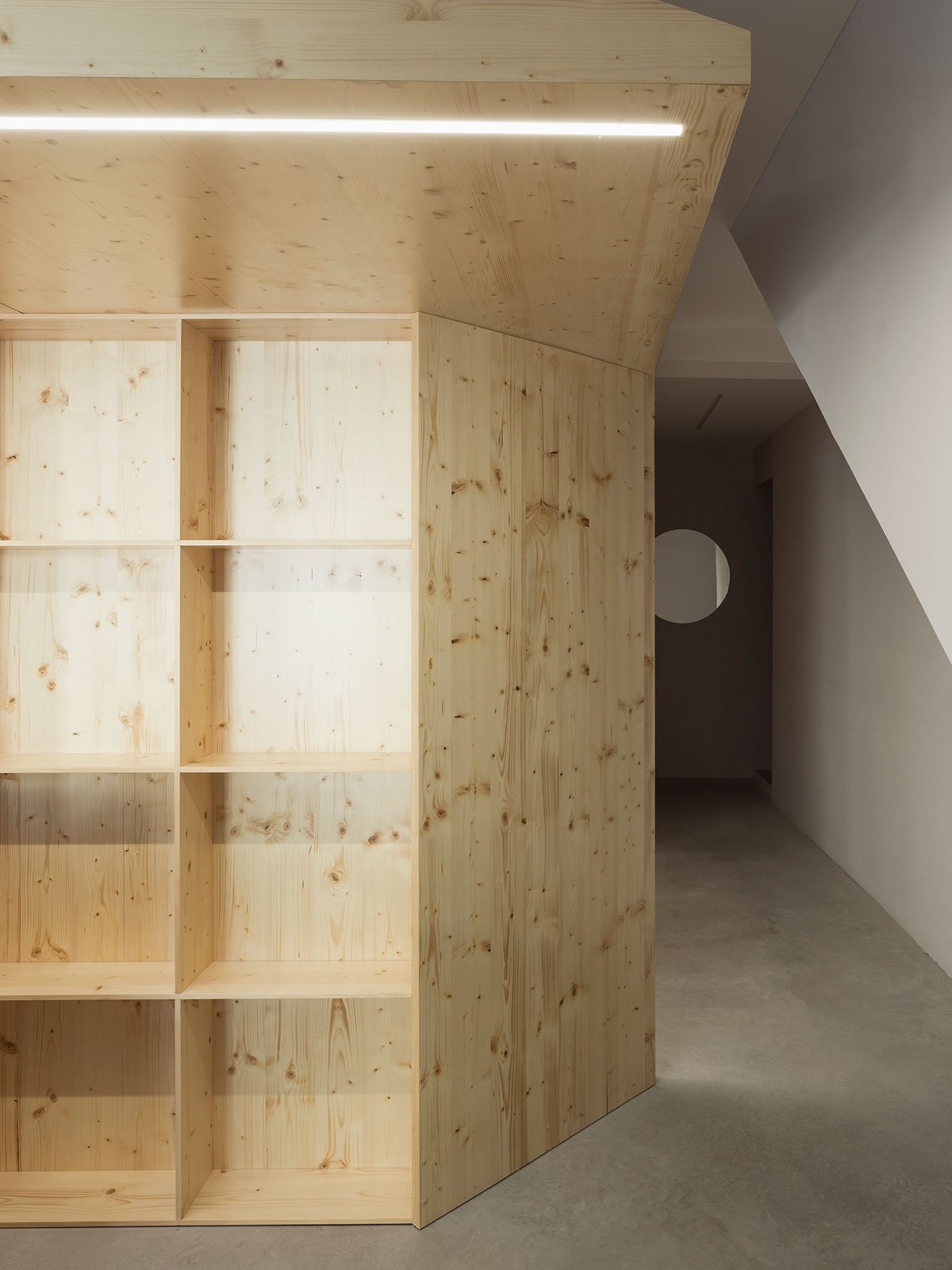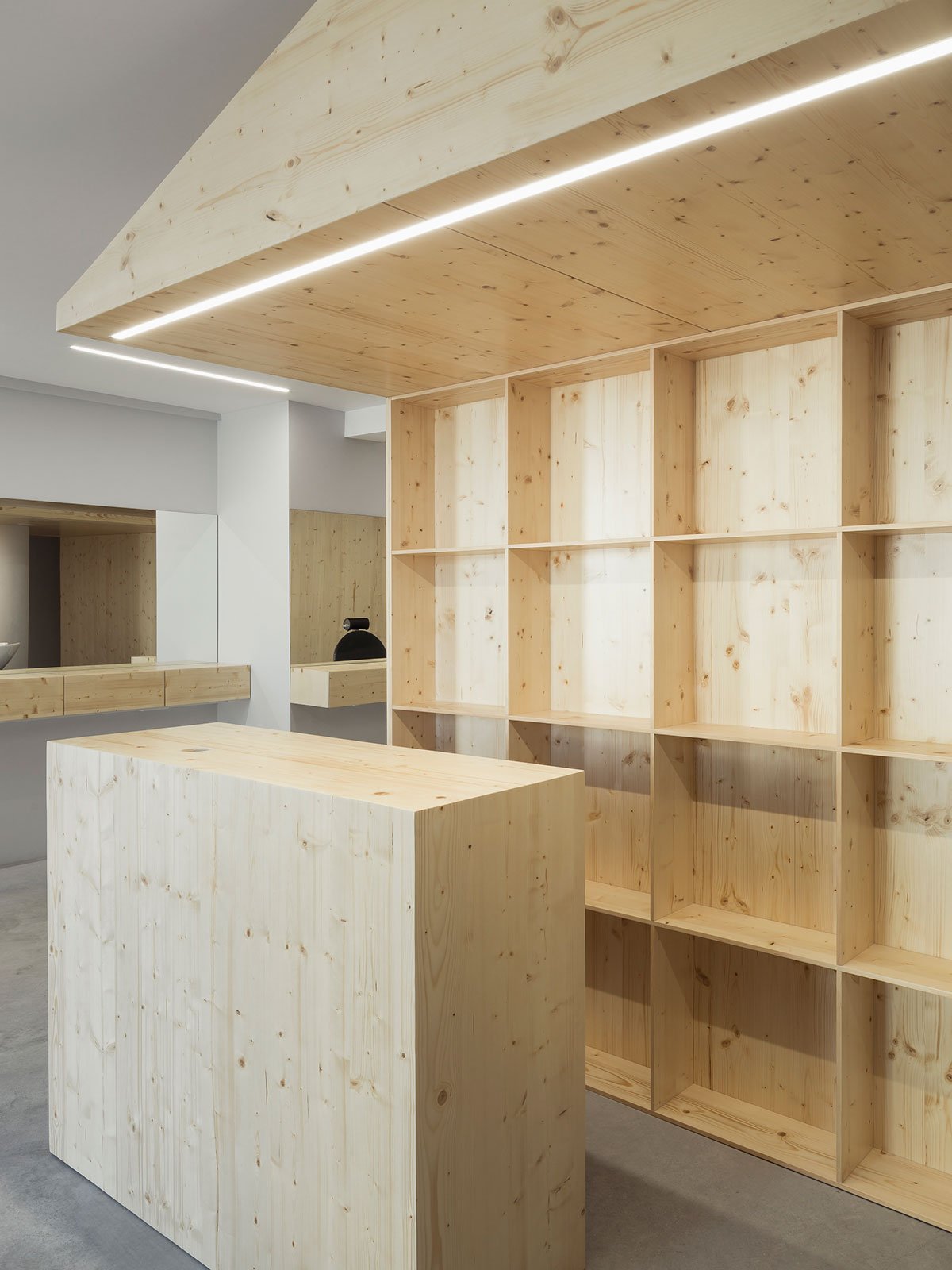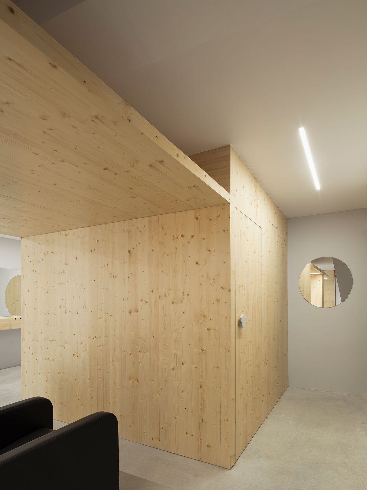 Wood is the chosen material that defines the interior decor of this project. The programmed space is created from it, as also the work surfaces, the reception desk and a waiting area, near the entrance. Concrete is used for flooring, hence creating a slightly colder character, in contrast with the key material – wood.