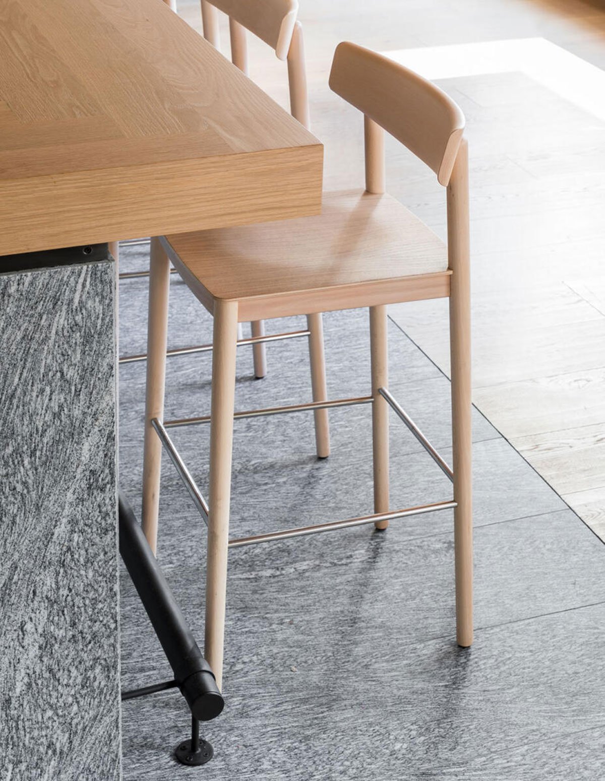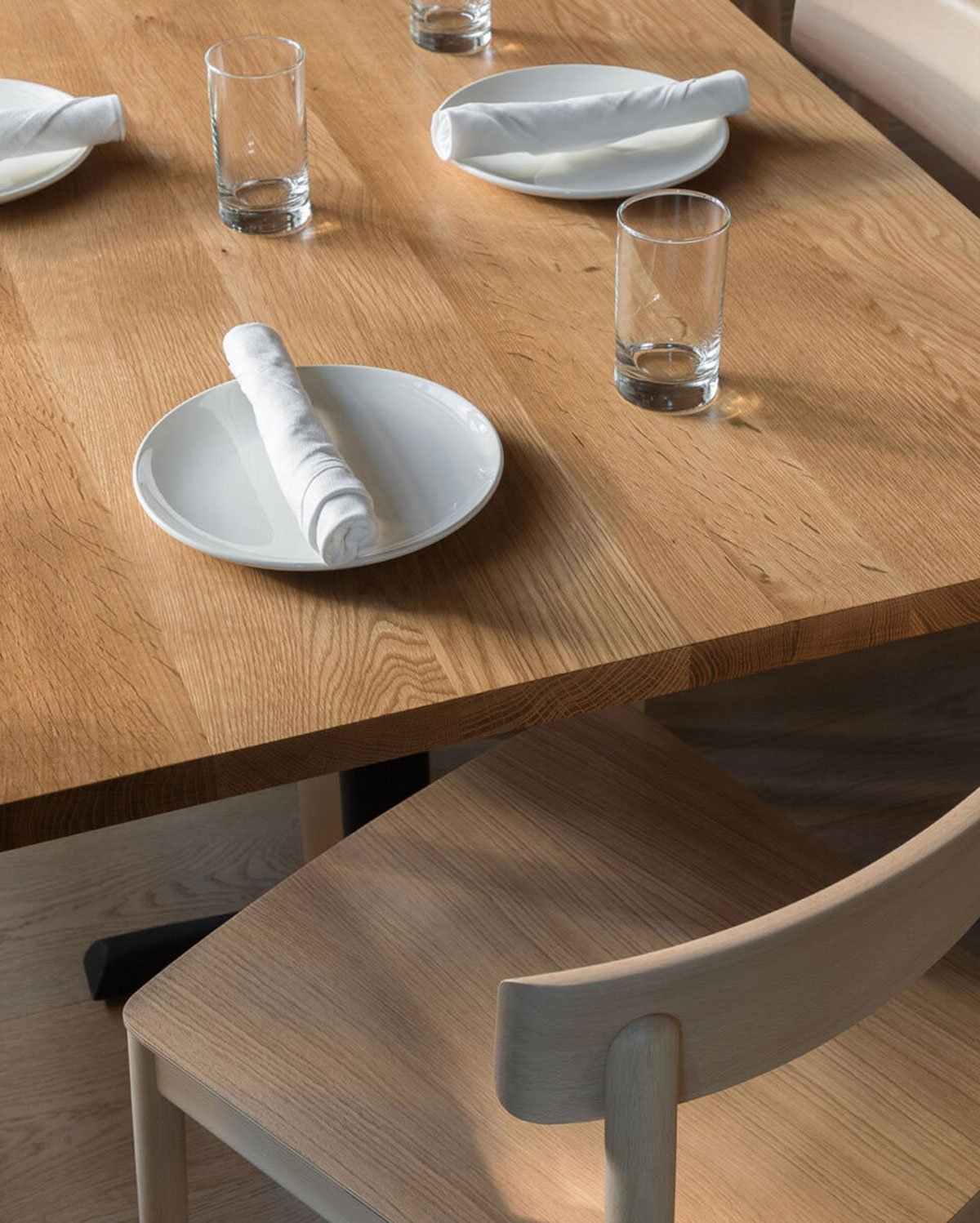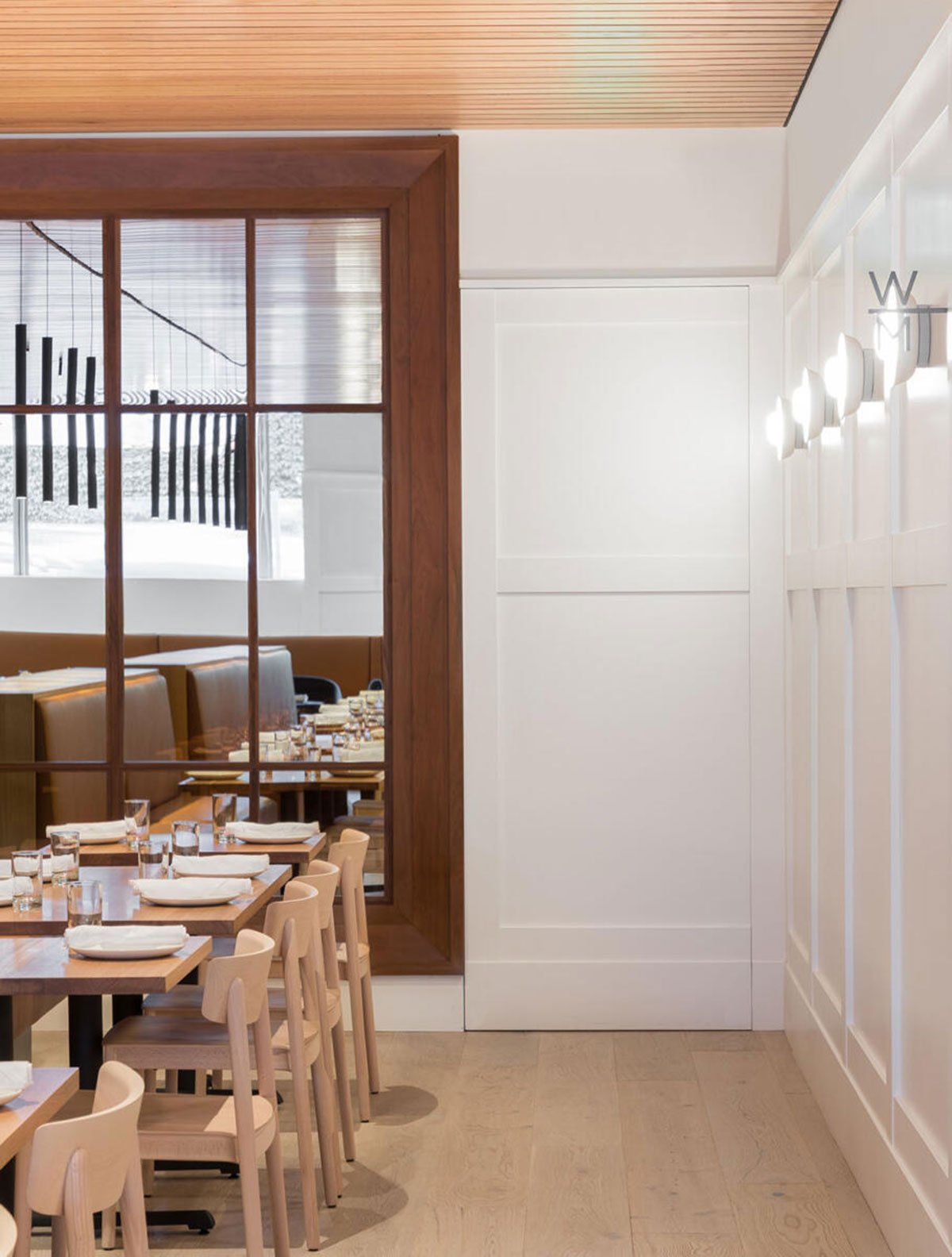 The design results in a space of relaxed elegance for the downtown set that establishes a strong connection to the street, the building lobby and the building courtyard, and maximizes the amount of natural light entering the restaurant along 100 feet of north facing storefront. The architectural lines are crisp and clean. The palette is a composition of white paneled walls, oak casework and ceilings, wide-plank oak floors, a granite-faced bar, and brown leather upholstered seating.