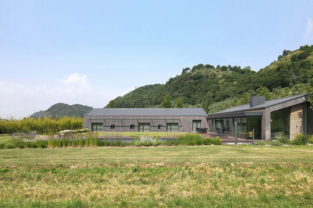 Excerpt: Country House is a residence designed by the architectural firm Dario Scanavacca architetto. The new residential building, with its distinctly modern character, fits into the agricultural landscape among the hills not far from the historic center of Bassano del Grappa, a municipality in the foothills of the Veneto region. The building consists of two single-pitched volumes and a swimming pool arranged in a U-shape to create a private courtyard raised above ground level from which to enjoy the view of the surrounding landscape.