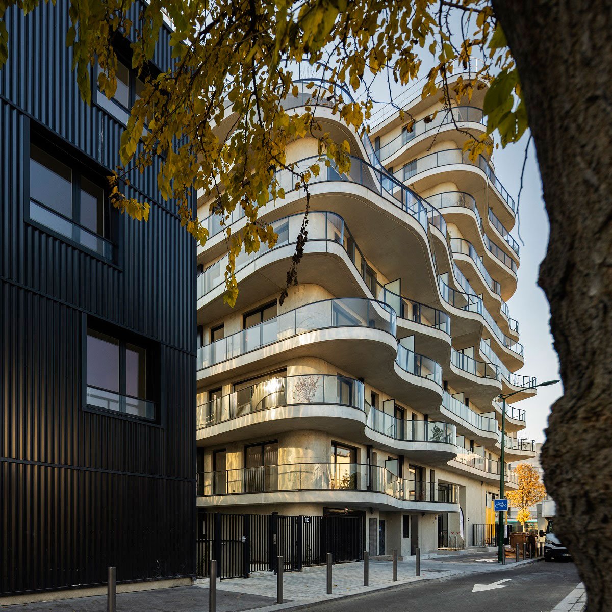 Excerpt: Courbes, designed by Christophe Rousselle Architecte, is part of the urban renewal program of the ZAC Charles de Gaulle in Colombes. The architectural project comprises two buildings with large and double-height shops on the ground floor, it restores the notion of alignment to the boulevard while bestowing visual lightness in its upper floors thanks to the suppleness of its interlocking volumes. The project with its 134 apartments serves to signal the entrance to the town while the molded volumes give each apartment a unique character.