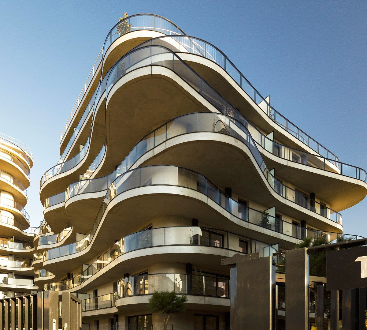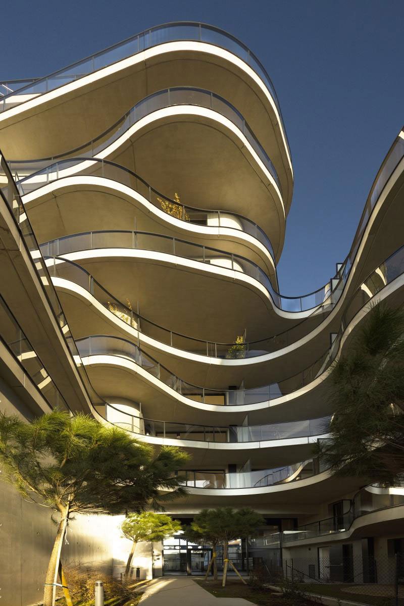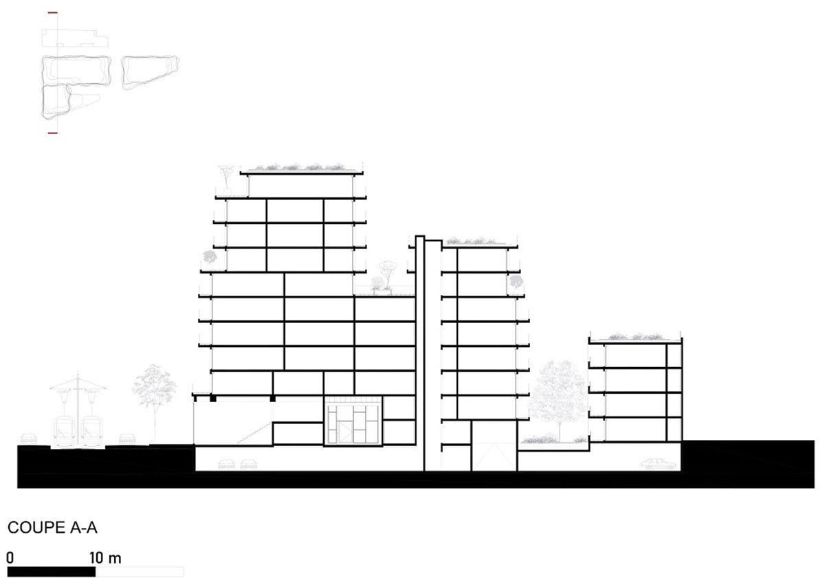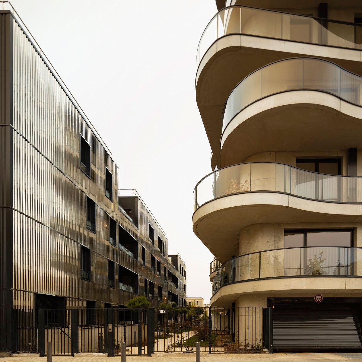 The architectural project comprises two buildings with large and double-height shops on the ground floor, it restores the notion of alignment to the boulevard while bestowing visual lightness in its upper floors thanks to the suppleness of its interlocking volumes. The important variations in the project’s height envelope and floor plan results from the presence of setbacks on every floor, which make it possible to offer rich volumes according to the surrounding context. The core of the city block benefits from the creation of a pedestrian alleyway lined with over 30 parasol pines, and the residential building is clad in shiny annealed stainless steel, which amplifies the perception of the greenery and light within the block. The project with its 134 apartments serves to signal the entrance to the town while the molded volumes give each apartment a unique character. The aim was to densify the area, respecting the comfort of all at the same time. Each floor has been designed in accordance with its specific location, whilst complying with the orientation, the neighboring structures and the volumes of the floors above and below. The massive appearance of the building is mitigated by the presence of balconies – between reflection and transparency- offering open sky exterior spaces. Over 2 km of curved glazing were required to complete the project.