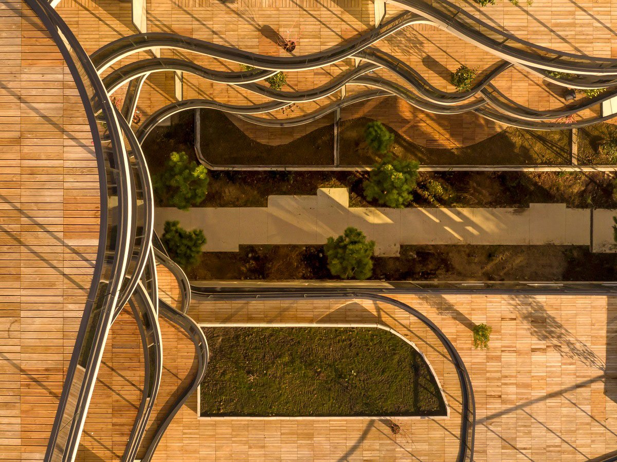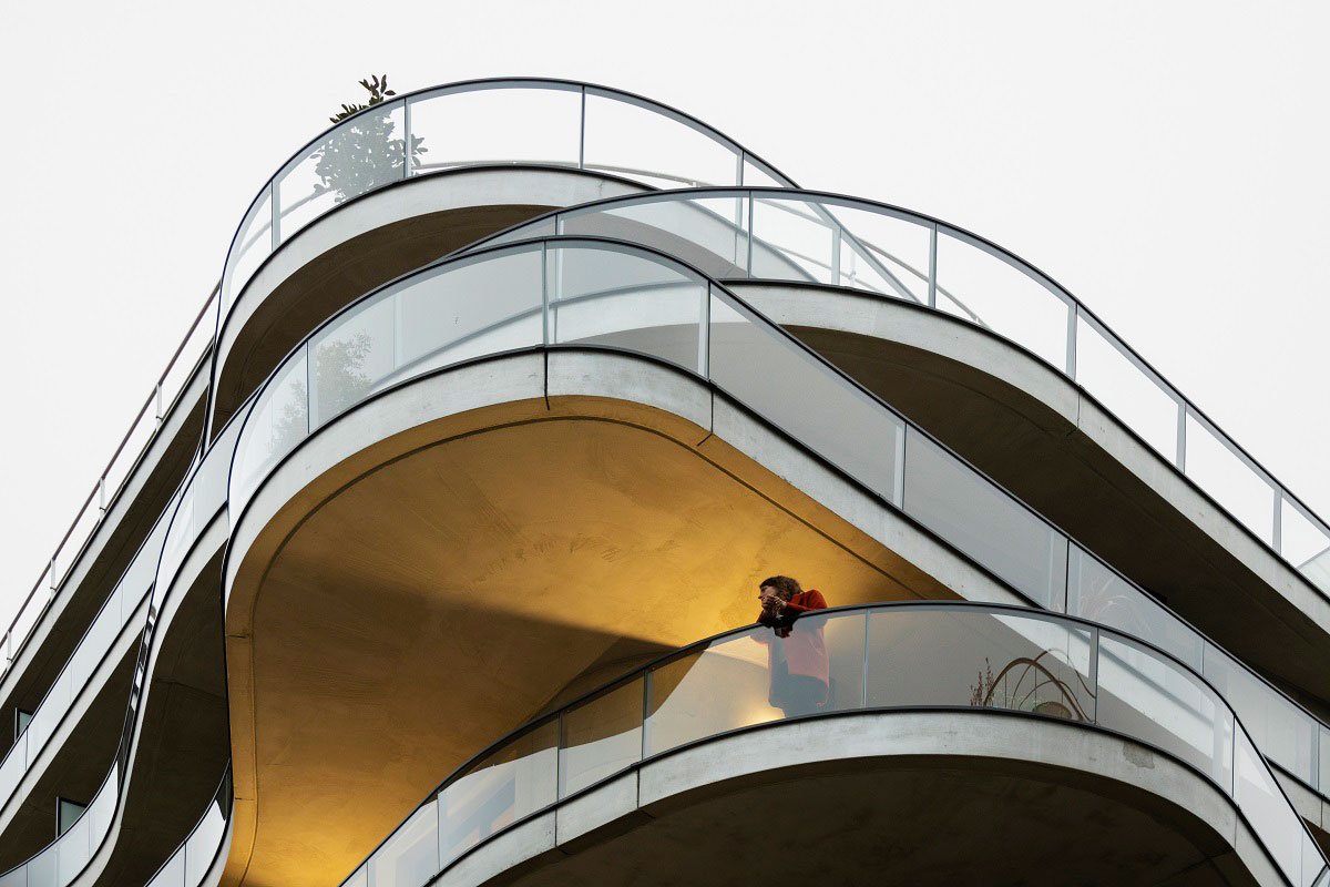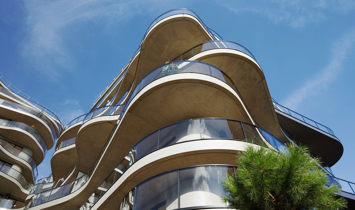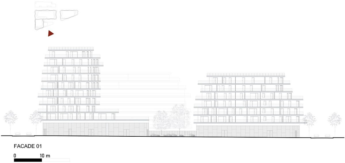 The architectural project comprises two buildings with large and double-height shops on the ground floor, it restores the notion of alignment to the boulevard while bestowing visual lightness in its upper floors thanks to the suppleness of its interlocking volumes. The important variations in the project’s height envelope and floor plan results from the presence of setbacks on every floor, which make it possible to offer rich volumes according to the surrounding context. The core of the city block benefits from the creation of a pedestrian alleyway lined with over 30 parasol pines, and the residential building is clad in shiny annealed stainless steel, which amplifies the perception of the greenery and light within the block. The project with its 134 apartments serves to signal the entrance to the town while the molded volumes give each apartment a unique character. The aim was to densify the area, respecting the comfort of all at the same time. Each floor has been designed in accordance with its specific location, whilst complying with the orientation, the neighboring structures and the volumes of the floors above and below. The massive appearance of the building is mitigated by the presence of balconies – between reflection and transparency- offering open sky exterior spaces. Over 2 km of curved glazing were required to complete the project.