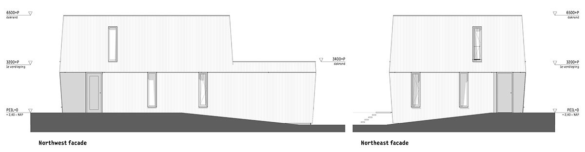 An irregular rhythm of grayed wooden slats forms the skin of the house. The forest side of the house is maximally oriented to the surrounding nature through large horizontal and vertical windows. The laar side is more closed with narrow vertical windows for views of the surroundings.
