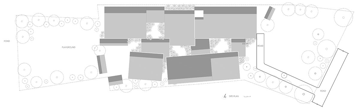 The roofing system itself is designed with flexibility in mind, allowing for spaces to be reconfigured or removed as necessary to accommodate the evolving needs of the children and the program. The fragmented roofs come together to form a continuous flow of space beneath, offering the children the freedom to move, play, and explore without constraints. The formal orientation of the building ensures that it remains protected from the noisy, active environment outside, while still maintaining visual connections to the sky and the surrounding greenery.