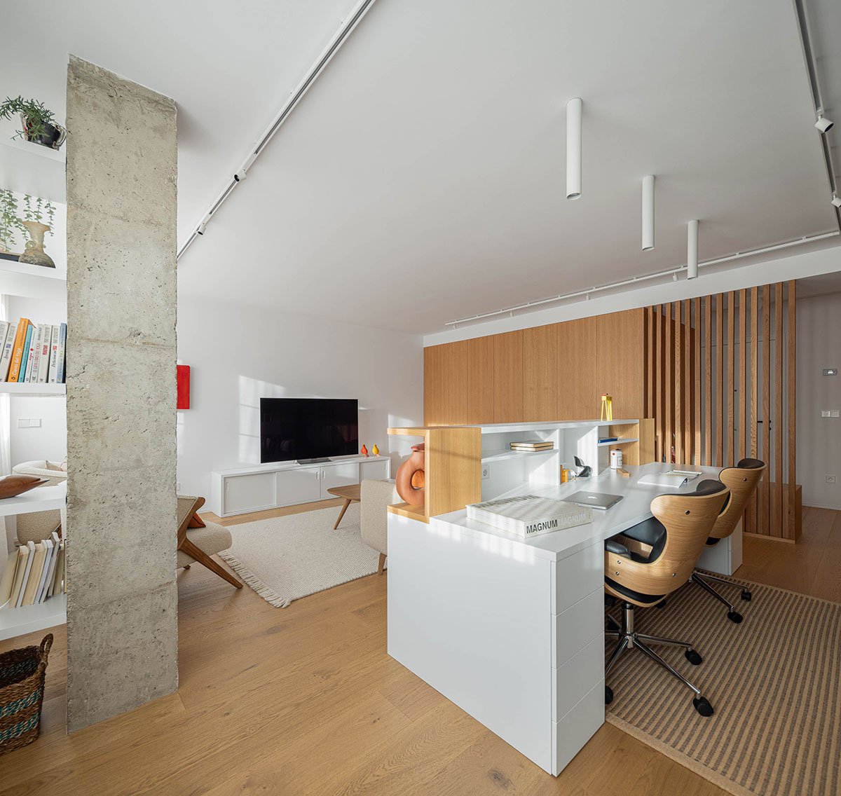 Excerpt: CV Apartment Renovation in Avilés by David Olmos Arquitectos is an interior design project for a flat with a very compartmentalised and elongated layout. The proposed reform aims to reconfigure the space, creating a large living room with a work area and multipurpose room. The kitchen and dining areas overlooking a courtyard are arranged more openly, using furniture as a delimiting element.