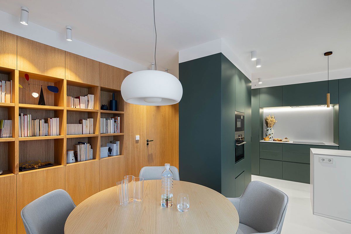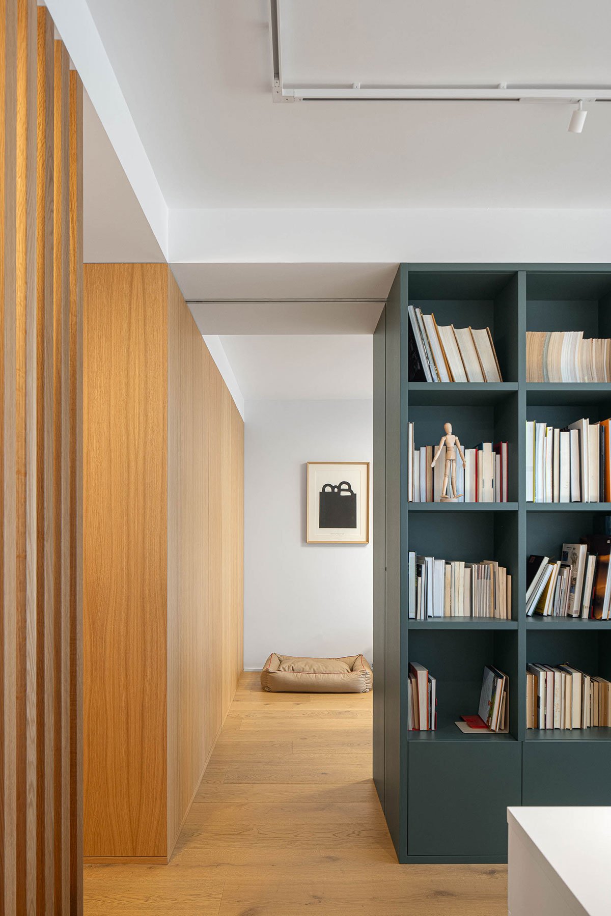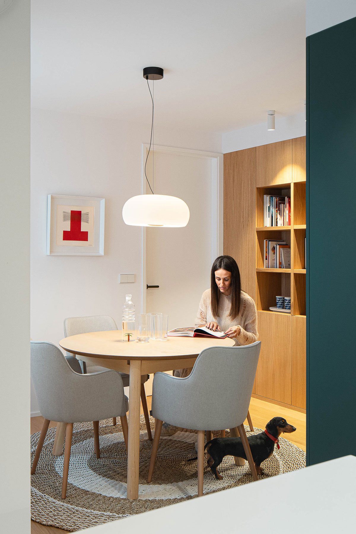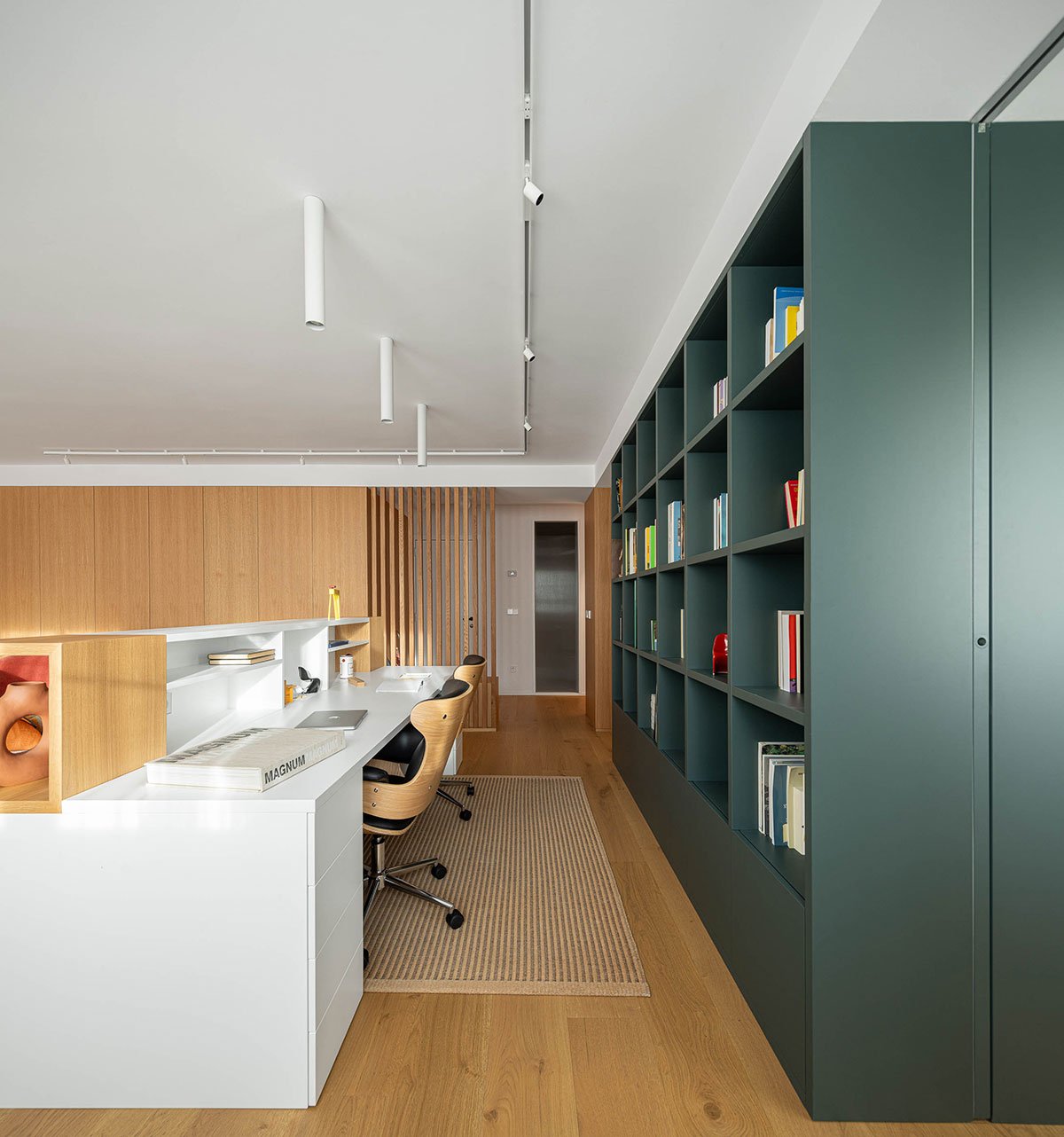 The materials chosen for the refurbishment combine oak wood in the elements that seek the continuity of the spaces, the olive green colour achieves the separation between different spaces and white as an element that unites everything.