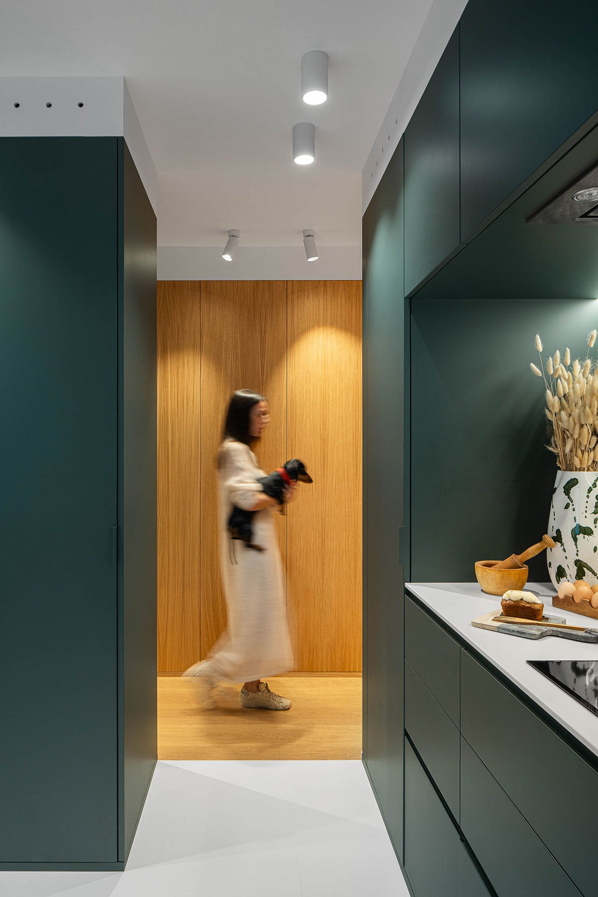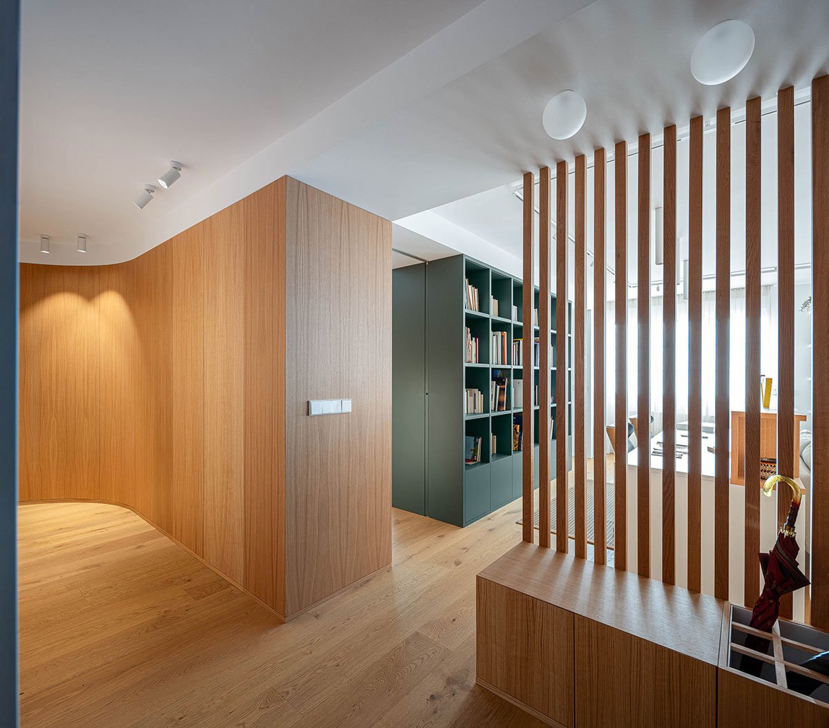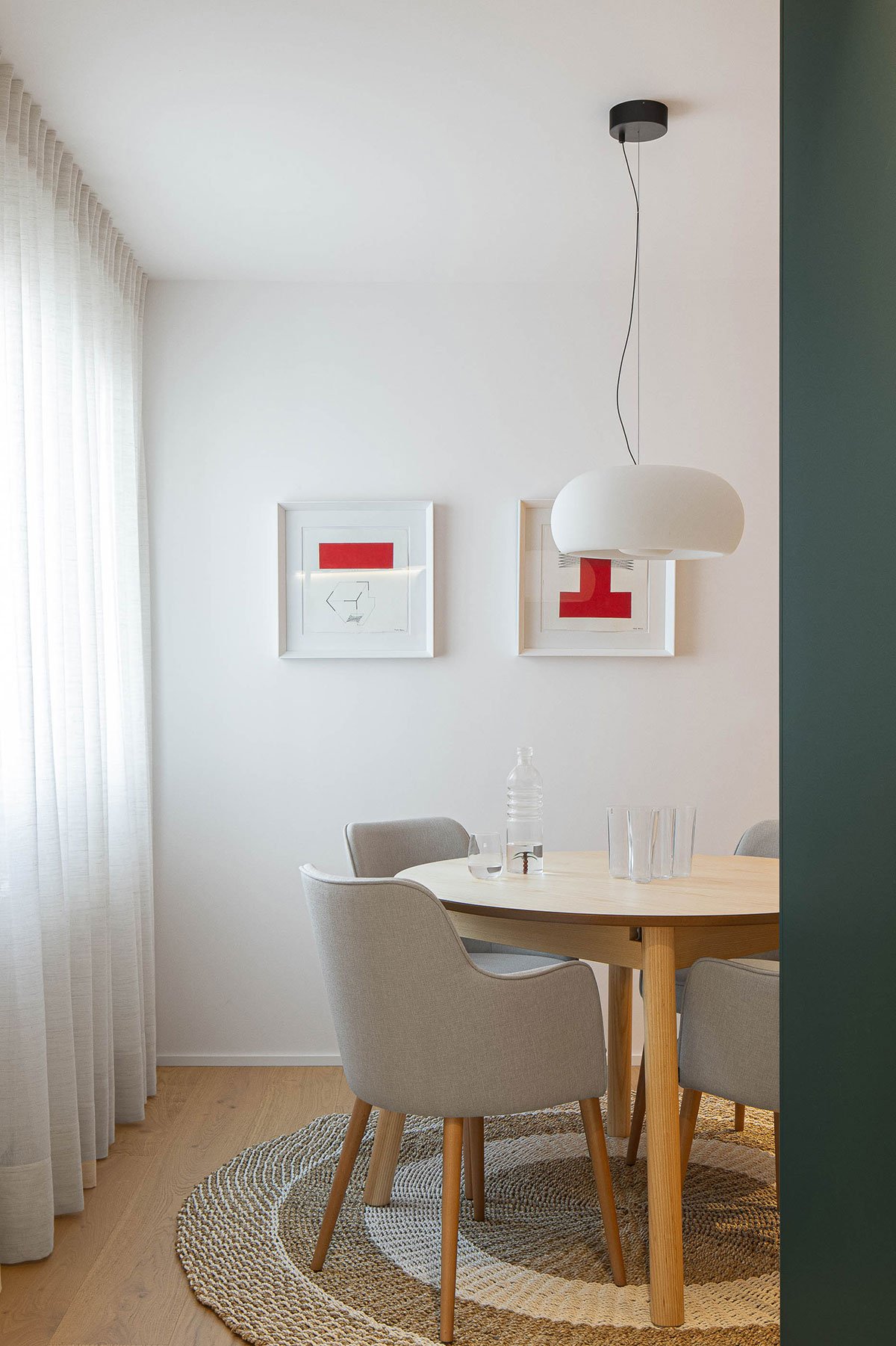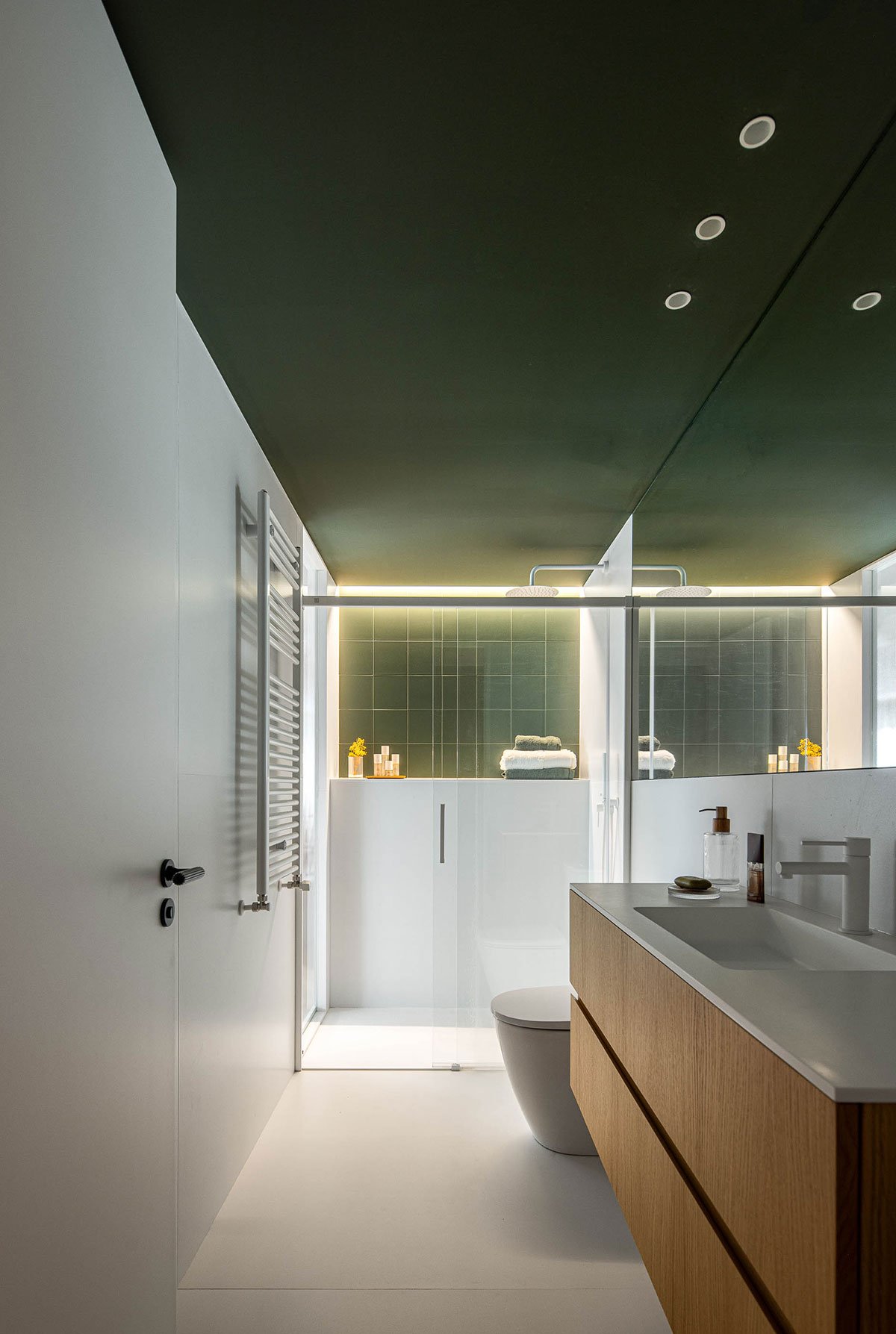 The materials chosen for the refurbishment combine oak wood in the elements that seek the continuity of the spaces, the olive green colour achieves the separation between different spaces and white as an element that unites everything.