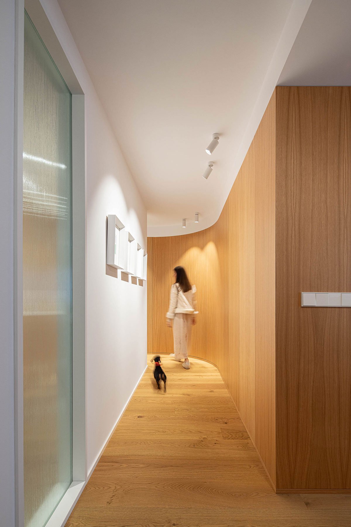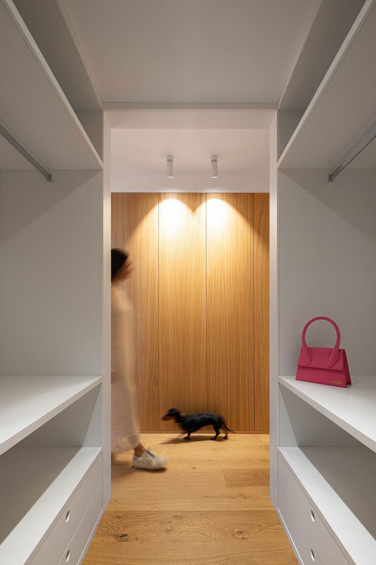 The space linking the two areas of the floor is no longer a simple corridor, but also an element that serves as storage and as a connecting thread to the different rooms, which it serves, even its change of layout helps to increase the dimension of the toilet and the concealment of the structure of the pillars of the building.