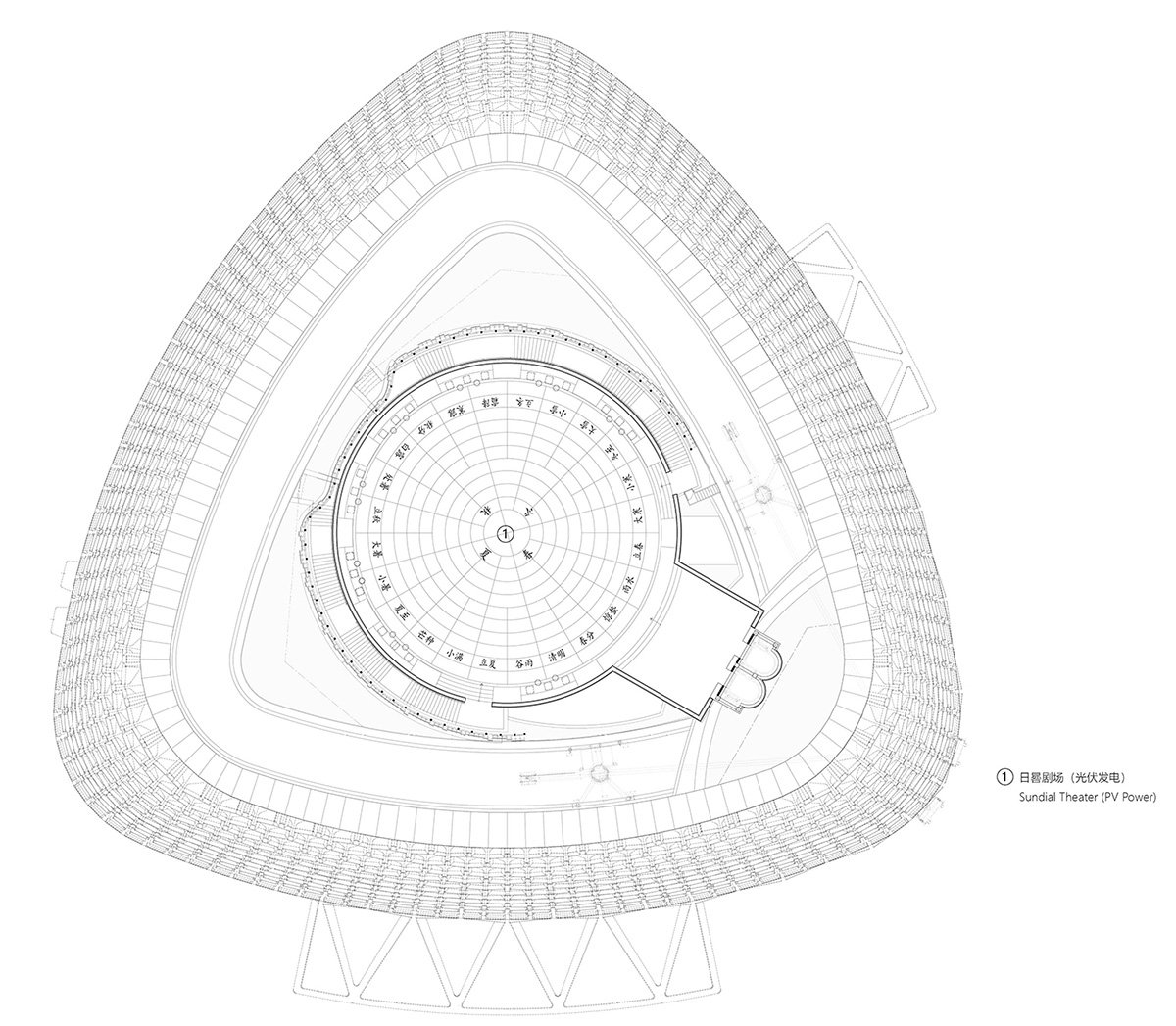 Architecture is Affect: A staircase from the 57th floor enters the iceberg, leading up to the 58th floor—the summit. Here lies a giant sundial etched with the 24 solar terms, made from photovoltaic panels, serving as a platform for helicopter hover rescue and as a performance stage. It shows how technology can be translated into dramatic spatial experience. This was the final step to complete the iceberg. Thus, we finally built the iceberg atop the Xintiandi T1 Tower. Standing at the center of the sundial, feeling the breeze and the warmth of the sun, you feel connected to the world. Everything falls into place.