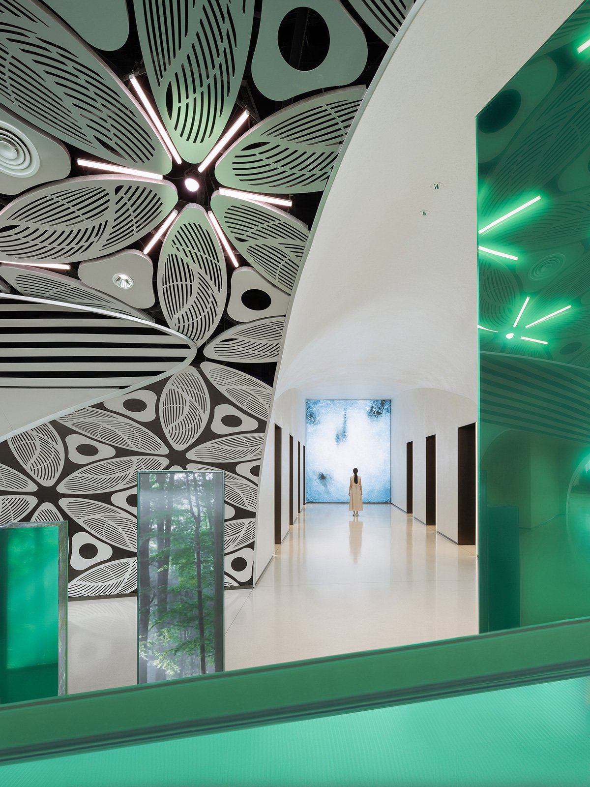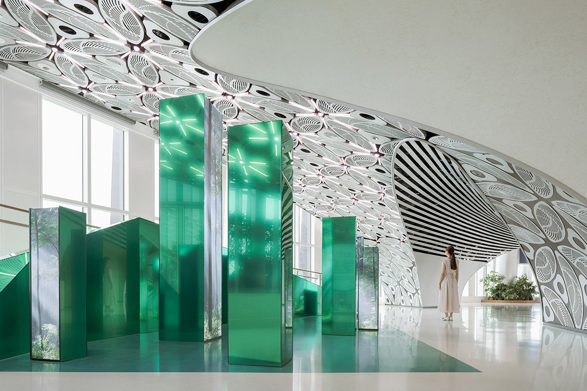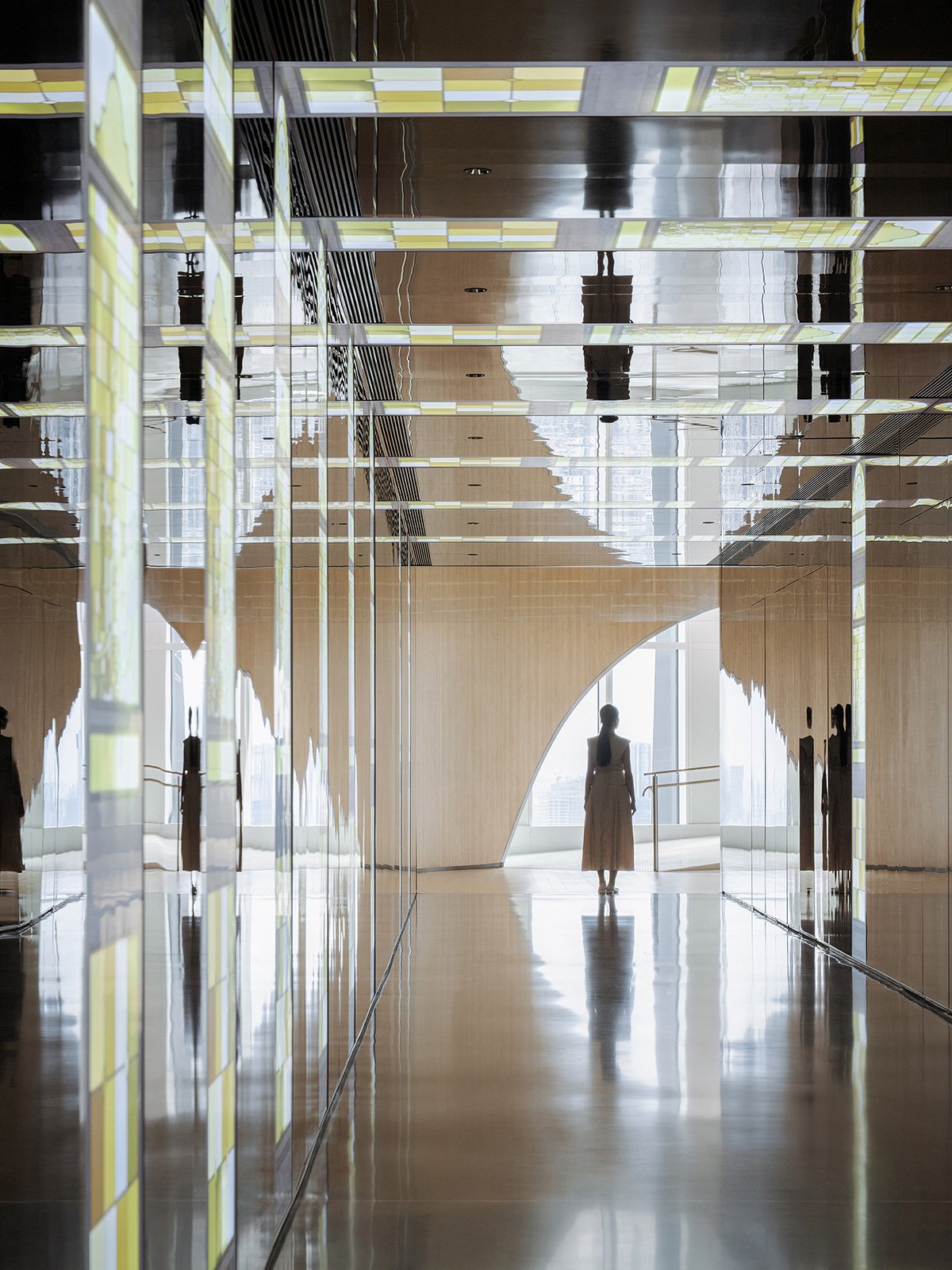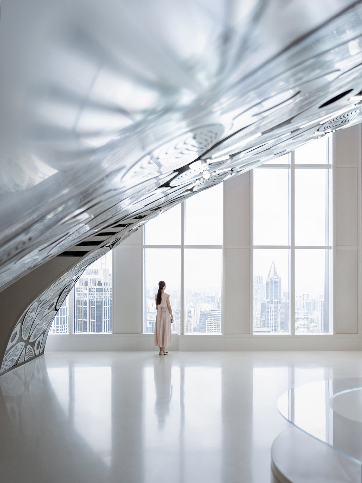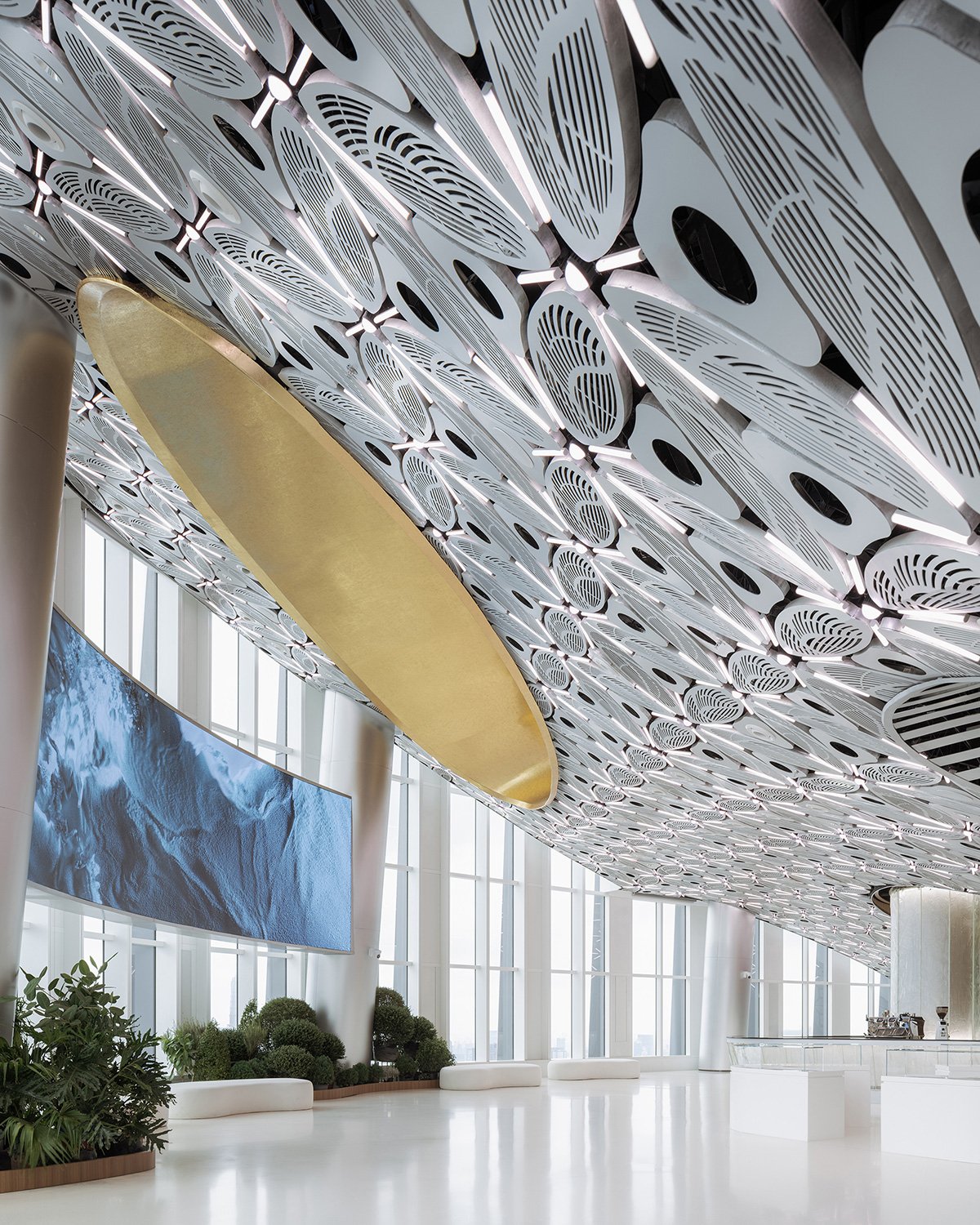 The indoor spaces of the 55th floor and 56th floor—including the entrance lobby, observation decks, exhibition halls, café, convention hall, floating garden, meeting rooms, and lounge—constitute the submerged part of the iceberg. The functional spaces are designed as caves within the iceberg, consistently using a refined vocabulary of arched elements to create a familiar strangeness that is perceptible.