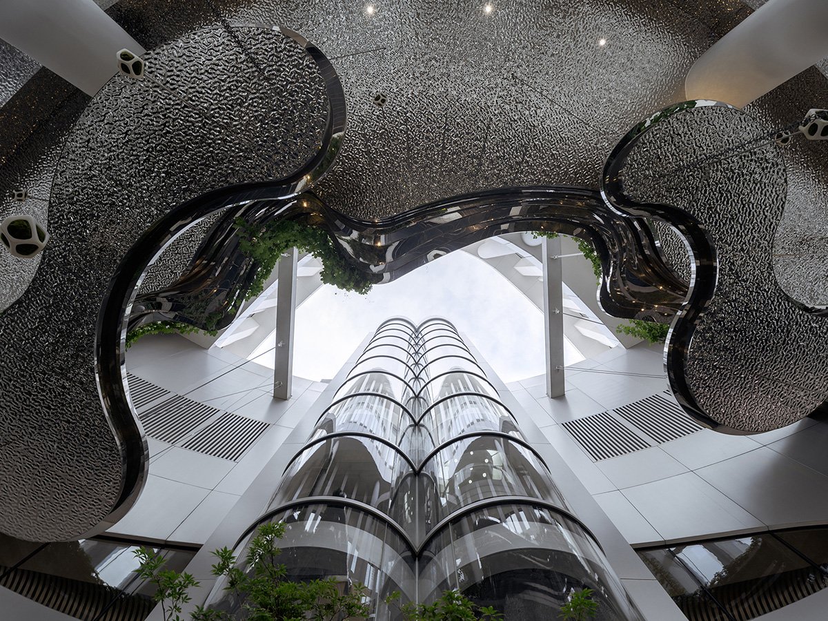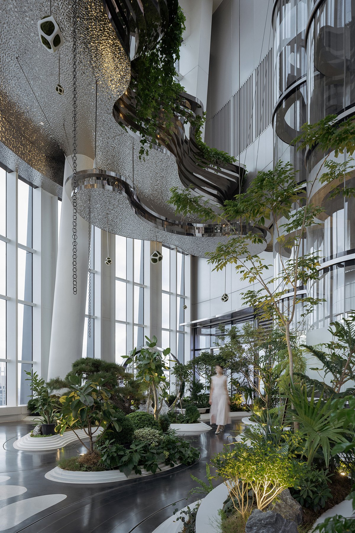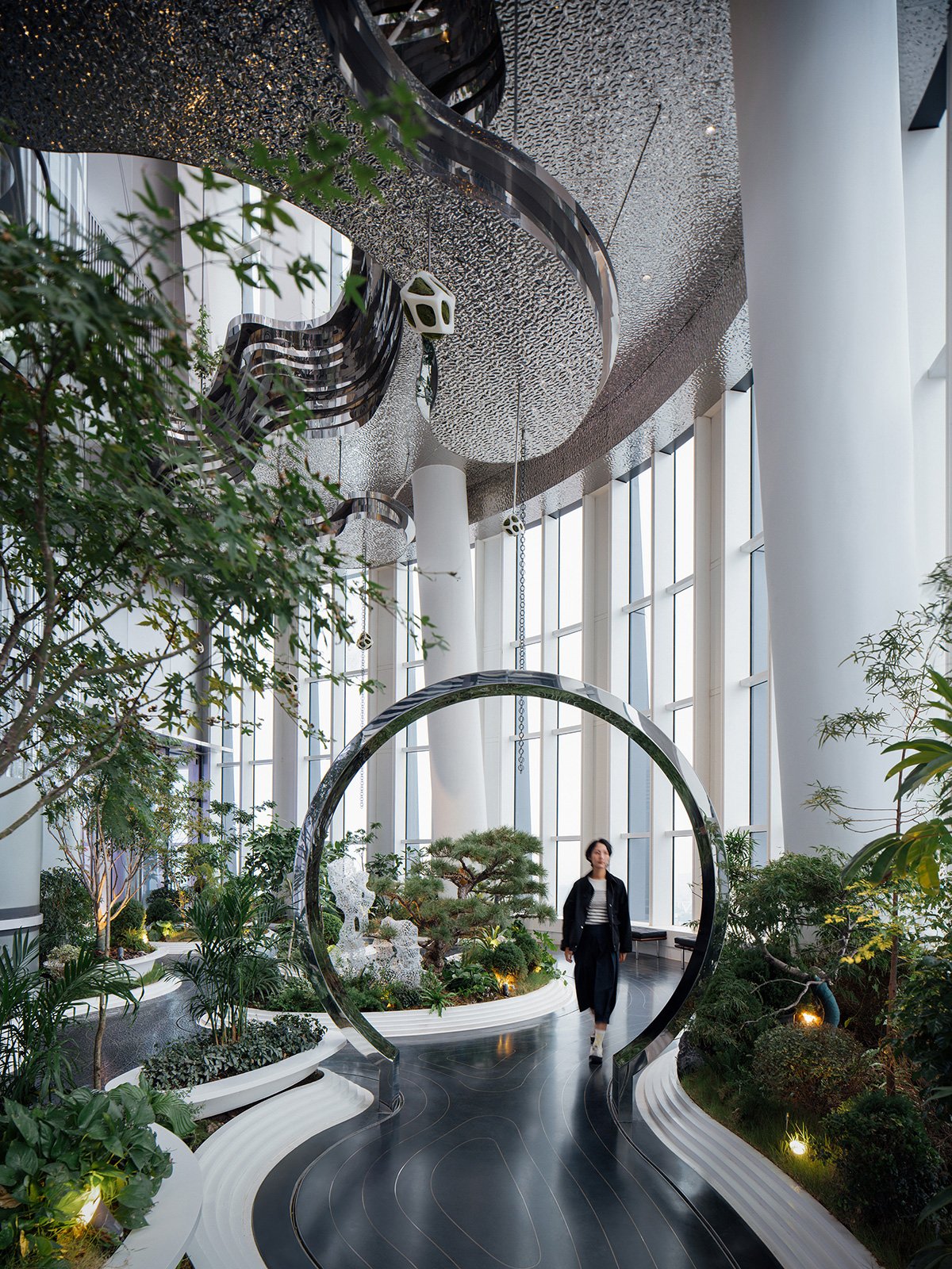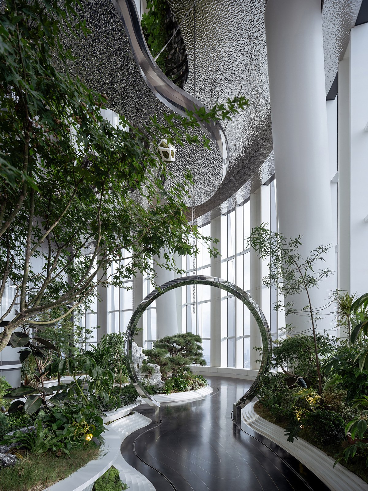 Across the 25-meter height, the architects and landscape designers customized rippled stainless steel of different heights to wrap the floating island garden. The journey from the 55th floor to the 57th floor by the sightseeing elevator is traversing a vertical garden. Each layer of the floating garden casts a shadow on the 120 sqm floor of the 55th floor, which simulate water with black terrazzo and metal ripples. The floating garden creates more than 100% green coverage. A stainless steel moon gate and 3D-printed Taihu rocks, paying attribute to the Yu Linglong in Yu Garden, visually pair the historical and the contemporary in this reconstructed Chinese garden.