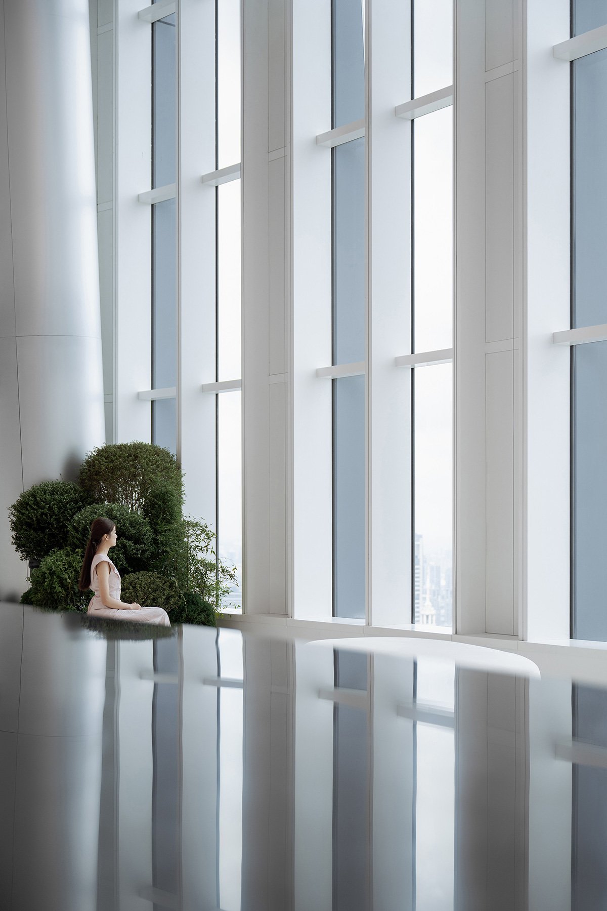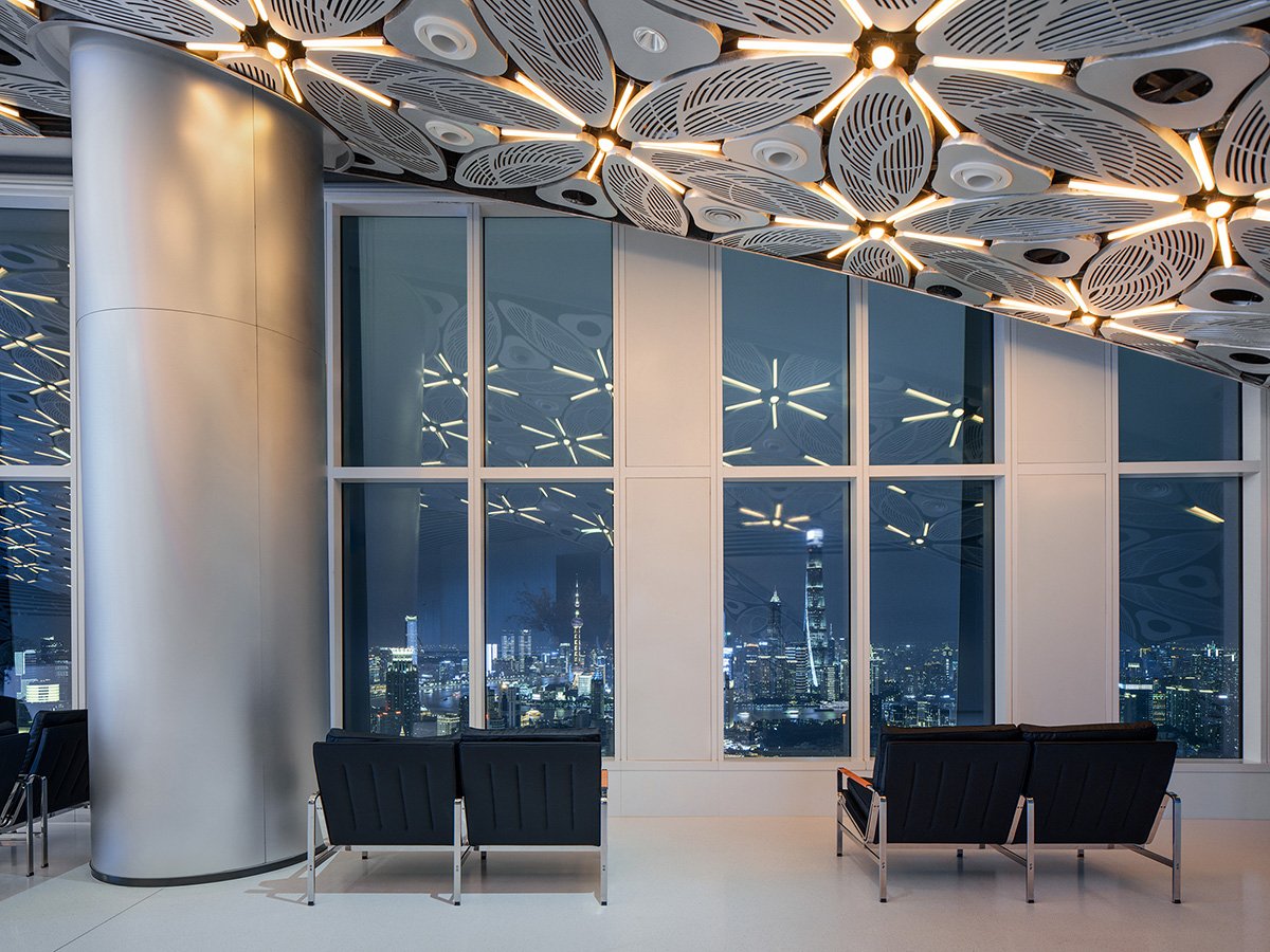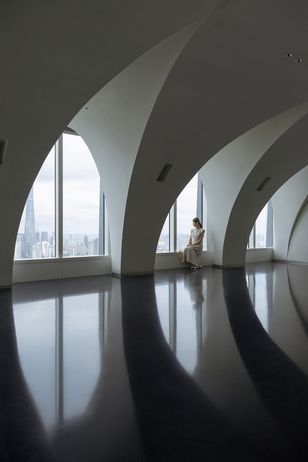 Space is Spirit: My personal favorite is the lounge on the 56th floor. The continuous arcades frame a new urban landscape at the façade. Shanghai glimmers like crystal beyond the arches. Standing on the black, reflective floor, my mind goes quiet and empty. This space, because of this emptiness, acquires an instant sacredness.