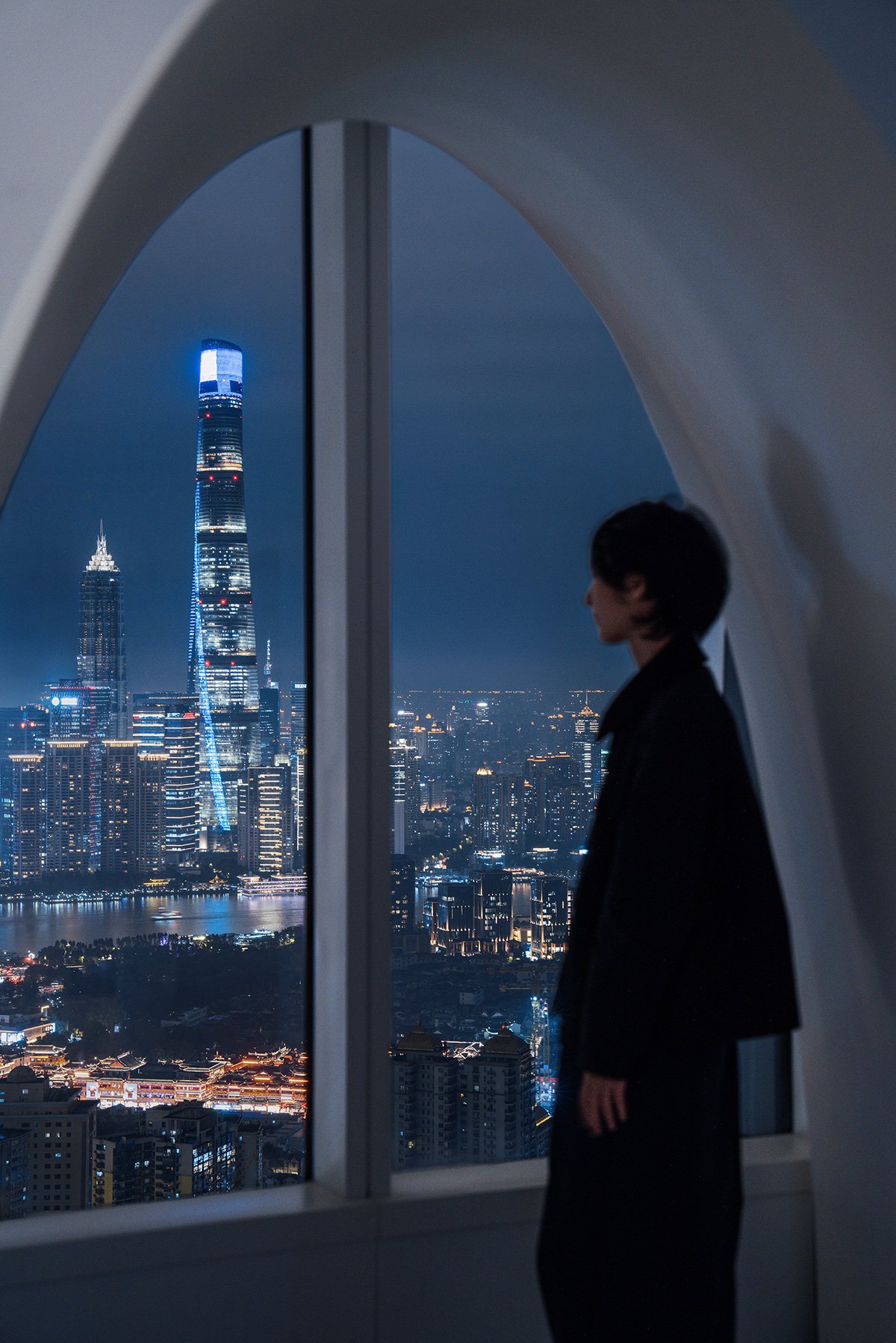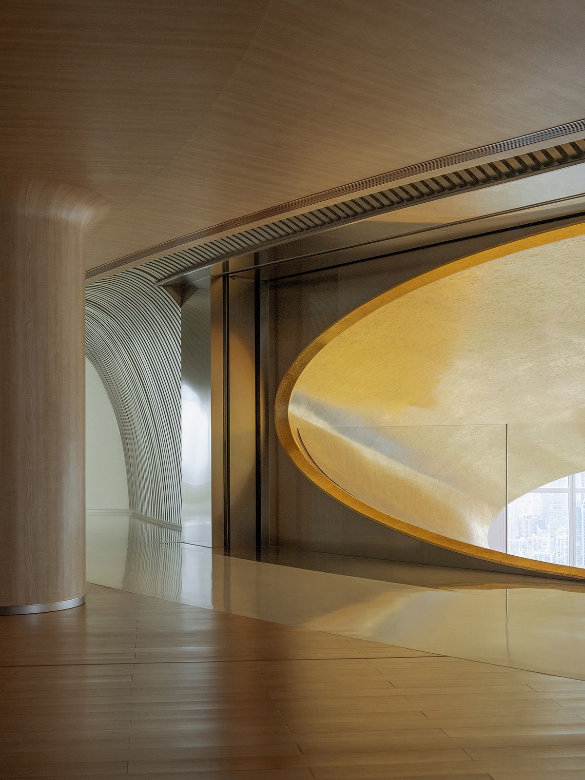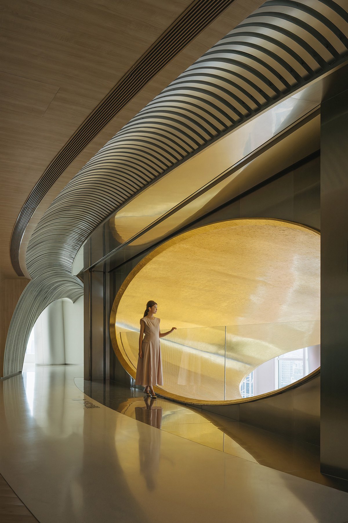 Space is Spirit: My personal favorite is the lounge on the 56th floor. The continuous arcades frame a new urban landscape at the façade. Shanghai glimmers like crystal beyond the arches. Standing on the black, reflective floor, my mind goes quiet and empty. This space, because of this emptiness, acquires an instant sacredness.