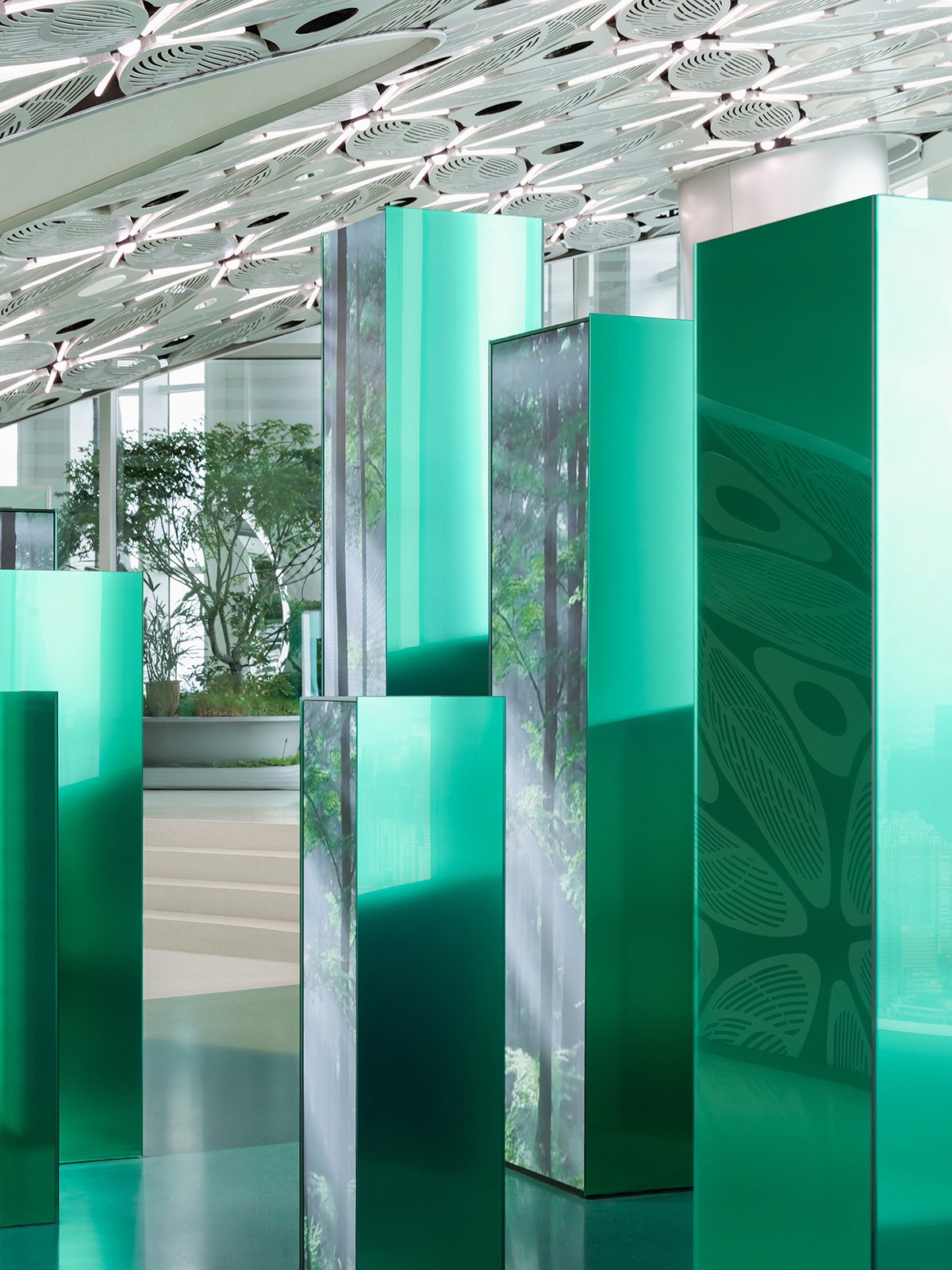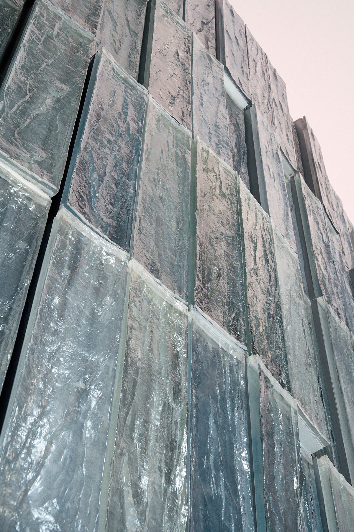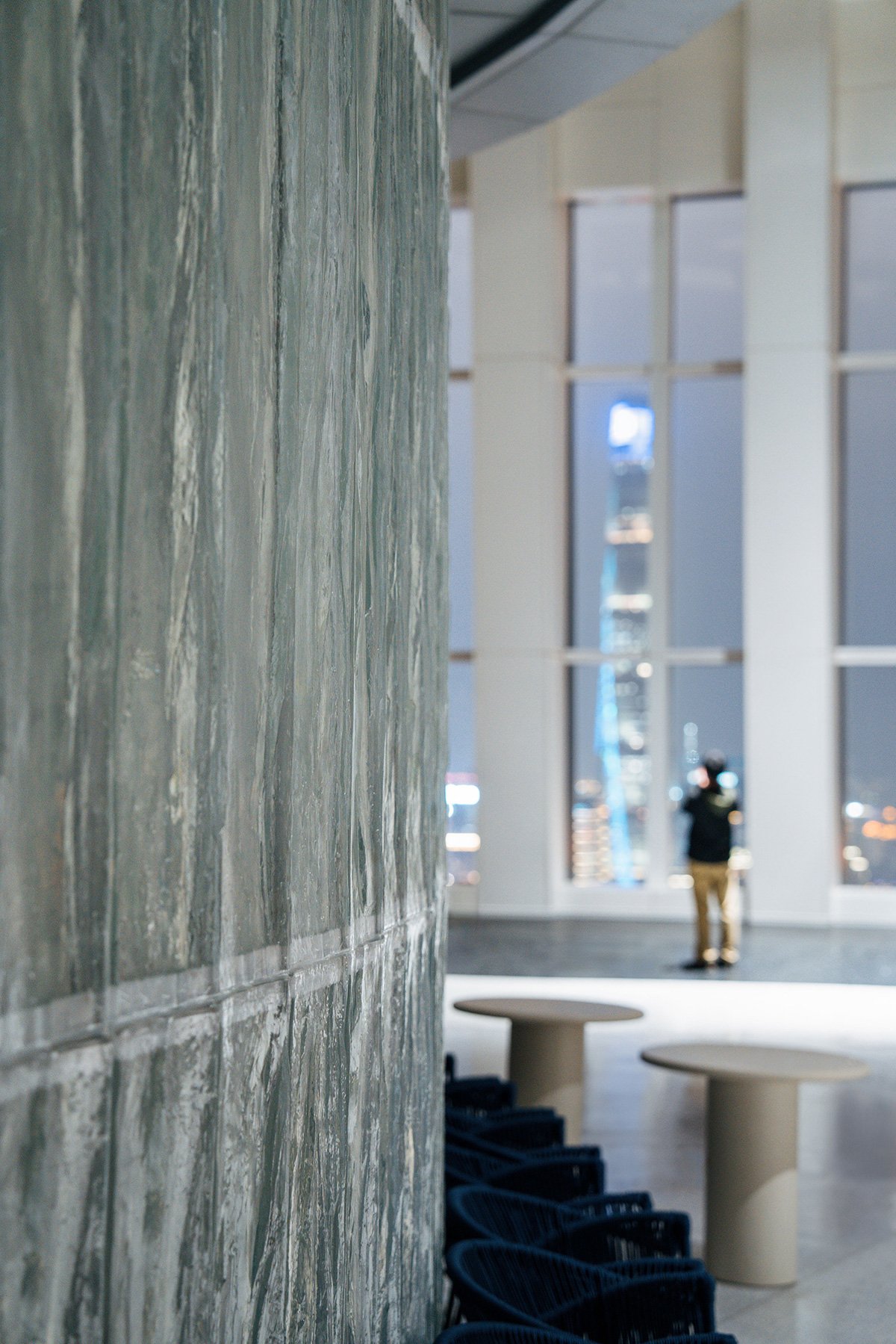 Material is Mood: On the white terrazzo ‘sea surface’ of the 57th floor, the rooftop, we collaborated with Mr. Shi Jun, a Shanghai Master of Arts and Crafts to transform elevator equipment rooms into abstract ice forms using translucent glaze—a material that echoes real ice, directly referencing the iceberg theme. Behind these glacial walls, LED lighting by OPPLE offers two modes: one shifts colors, turning the iceberg into a colourful mountain; the other evokes a subtle scene of the Yangtze River. The iceberg uses the material of glaze, emotionally connecting itself to Shanghai. This was the third step building the iceberg.