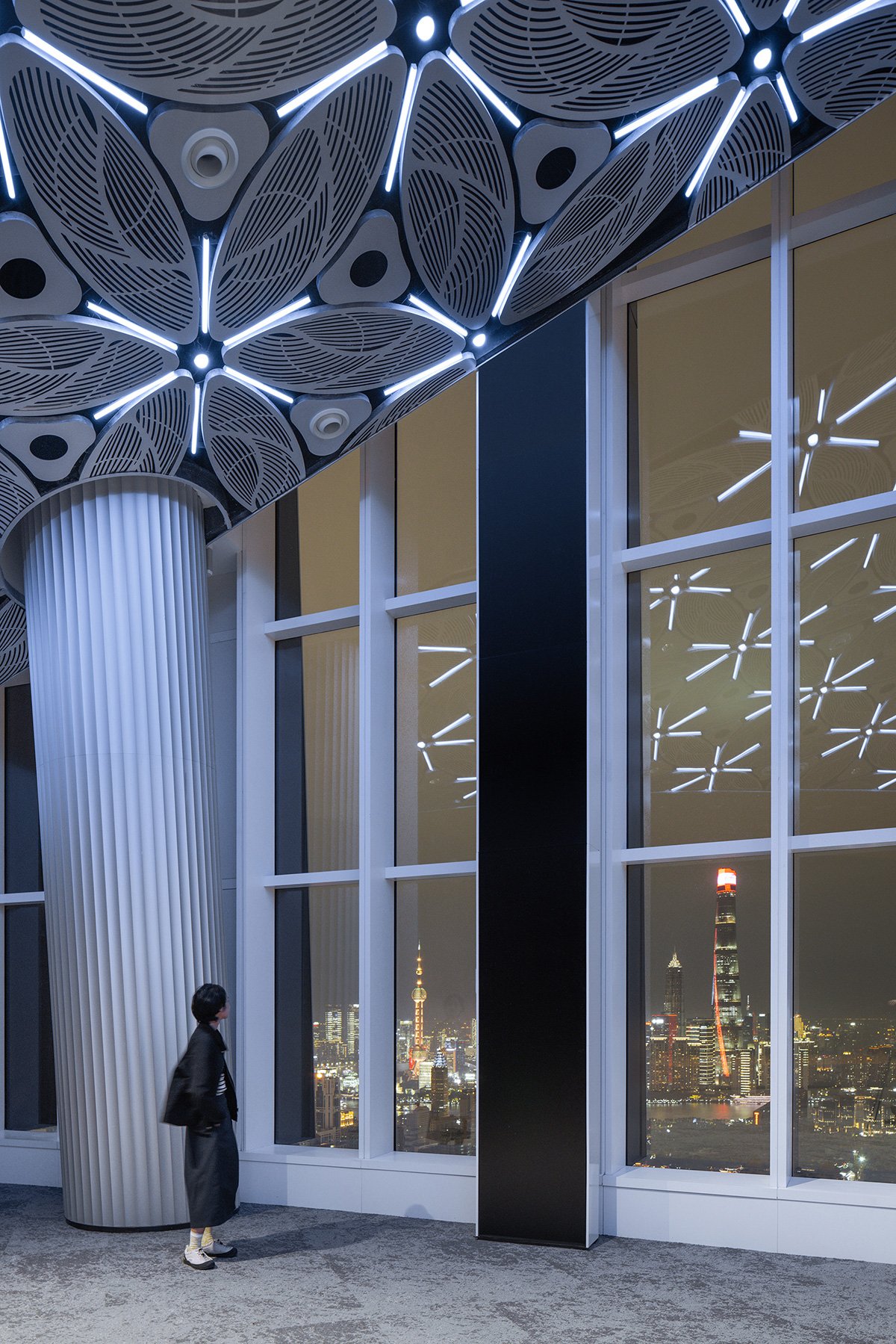 During my final walk-through, I was standing at the center of the large stage and beneath the snowflake-patterned ceiling, facing the city of Shanghai, when the LED columns on the interior façade suddenly lighted up. The splendid light reflected on the window intertwined with the night view of Shanghai, creating a scene of magical realism.